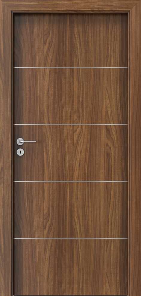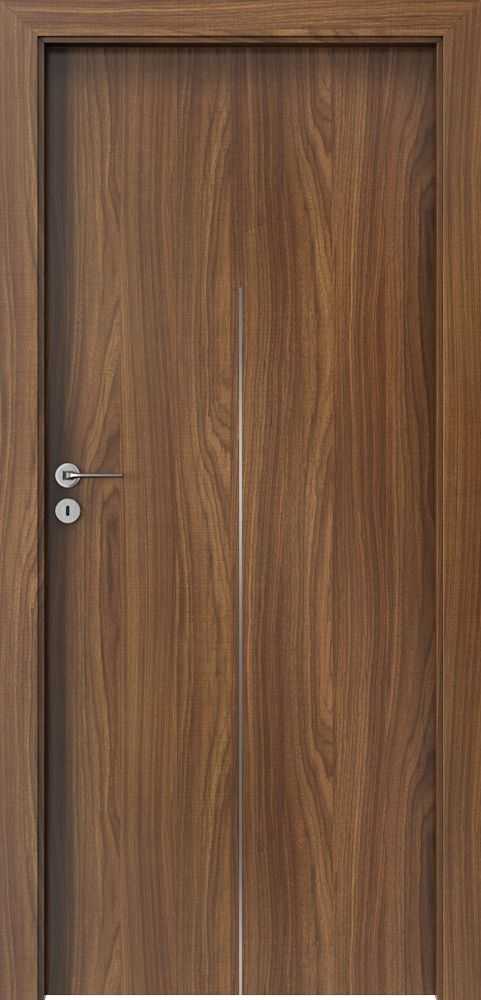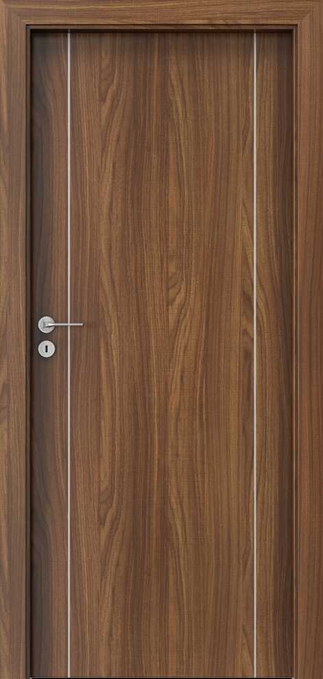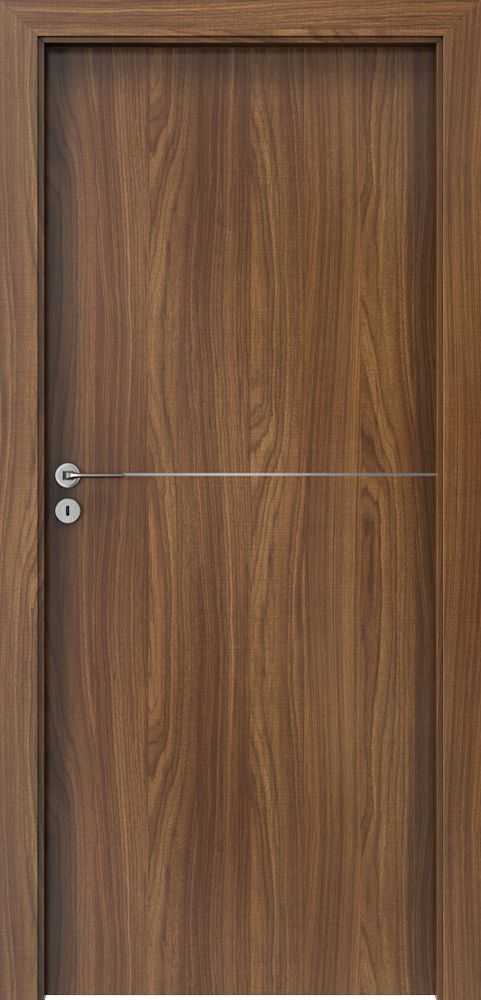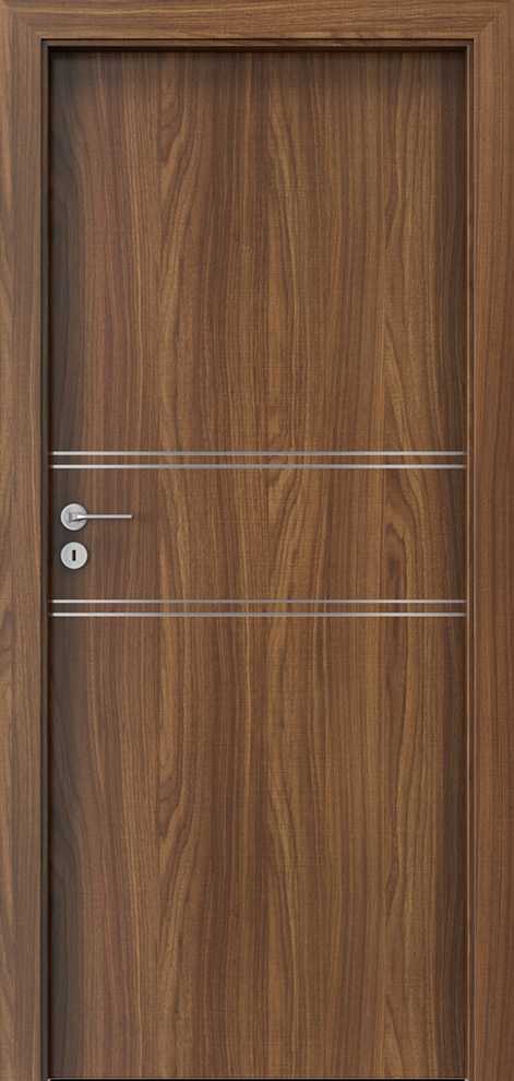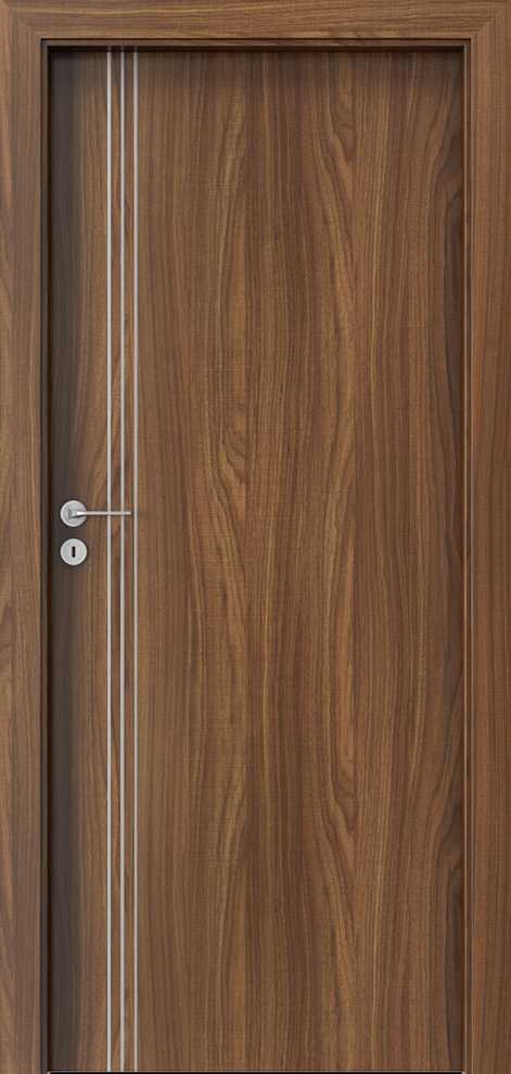 Drzwi Porta Line występują w wielu kolorach, w okleinach CPL HQ 0,2, Portadecor, Portaperfect 3D i Portasynchro 3D. Ich potencjał stanowi zdobienie aluminiowymi intarsjami. Zdobienia występują w kolorze srebrnym i złotym. Wnętrze skrzydła to rama wykonana ze sklejki. Wypełnienie stanowi płyta wiórowa otworowa. Ramiak obłożony jest obustronnie płytą HDF. Producent przygotował kilka podstawowych wzorów oznaczonych kolejnymi literami alfabetu. Przykładowe wzory zamieszczamy poniżej.