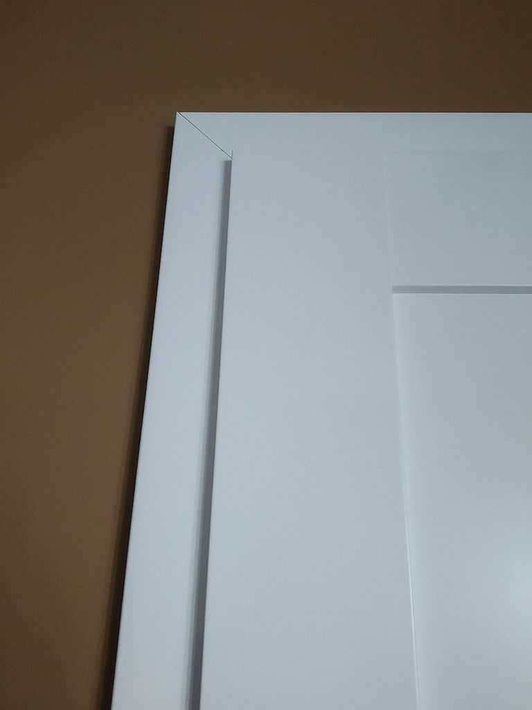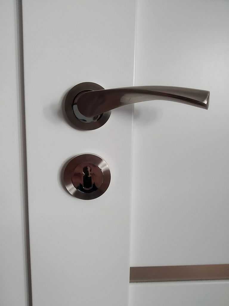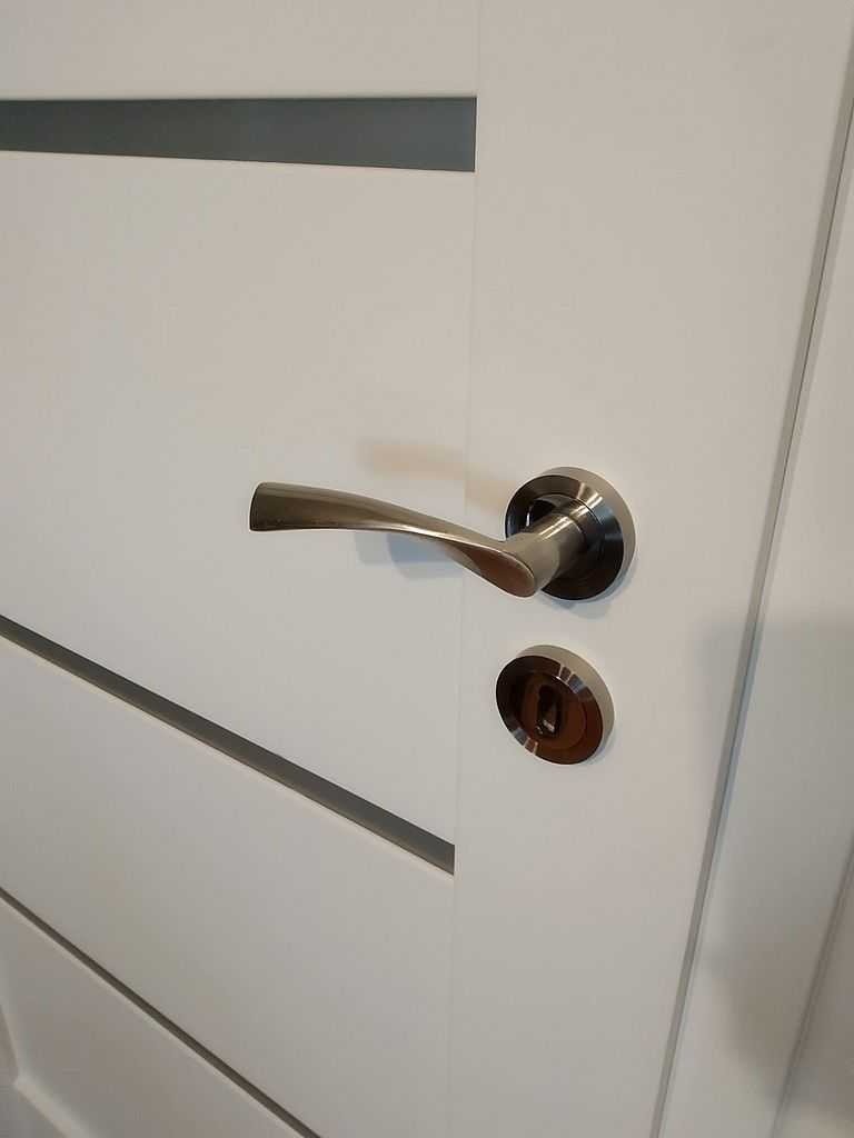 Klienci wybrali model Porta Verte G.4 jako drzwi pokojowe oraz G.2 z podcięciem wentylacyjnym do łazienki. Wszystkie modele wybrano w okleinie Portadecor biały. Skrzydła zostały osadzone na ościeżnicach regulowanych przylgowych. Pomimo różnych grubości ścian wszystkie wyglądają praktycznie jednakowo. Na widoczne zawiasy nałożyliśmy białe nasadki. Lekko ukryte zawiasy podnoszą walory estetyczne. Dodatkowo zamontowaliśmy klamki z firmy Infinity Line model Laura w kolorze chrom-satyna.