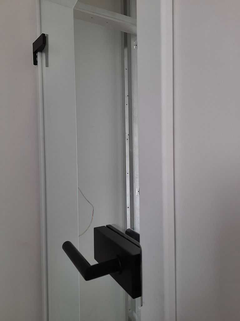 Nasza grupa montażowa dostarczyła i zamontowała dziesięć kompletów drzwi Erkado. Wybrany model do wiatrołapu to właśnie drzwi szklane Graf 9. Przezroczysta tafla szkła została osadzona na ościeżnicy regulowanej przylgowej na zawiasach prostokątnych w kolorze czarnym. Pozostałe drzwi to Laurencja 1 w kolorze białym premium. Model ten charakteryzuje się ramiakową konstrukcją i poziomym szkleniem. Klienci zdecydowali się na szybę bezpieczną obustronnie gładką w kolorze czarnym.