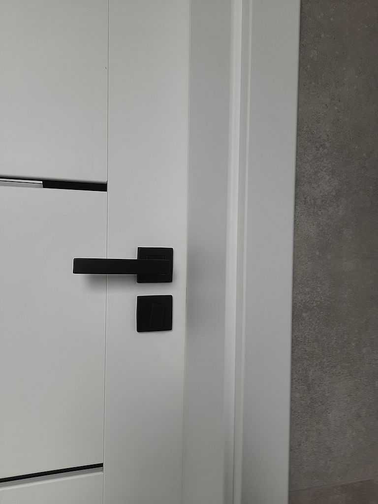 Nasi montażyści osadzili skrzydła drzwiowe na ościeżnicach regulowanych przylgowych. Drzwi łazienkowe posiadają podcięcie wentylacyjne oraz blokadę łazienkową. Czarnym dodatkiem, który pięknie komponuje się z przeszkleniem w modelu Laurencja są klamki Futura na kwadratowej rozecie. Drzwi do wiatrołapu jak w przypadku naszych klientów nie zawsze muszą być w takim samym wzorze jak w pozostałych pomieszczeniach. Szklane skrzydło subtelnie oddziela wnętrze i wprowadza do niego dużo światła.