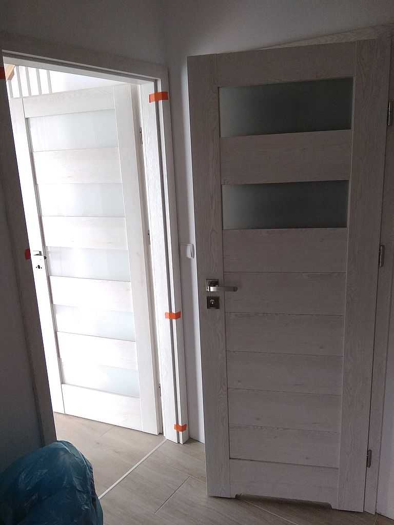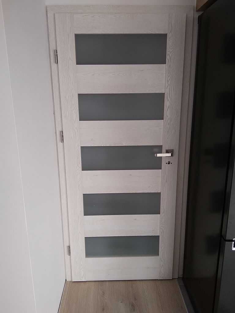 Drzwi Porta Verte Home Otomin. Dostarczyliśmy i zamontowaliśmy drzwi w kolorze dąb skandynawski w wersji przylgowej. Kolekcja PORTA VERTE Home model C5 oraz C2. Ościeżnice regulowane PORTA SYSTEM z opaską o szerokości 8 cm. Zamontowaliśmy również klamki Office z oddzielną rozetą na klucz i blokadę WC w kolorze srebrny mat.