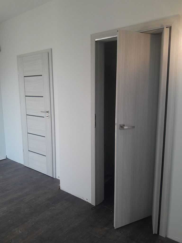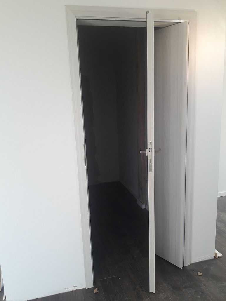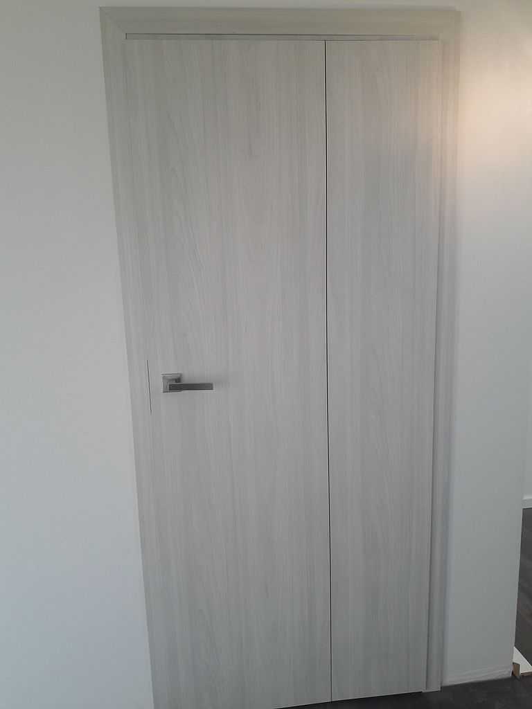 Do pokoi zamontowaliśmy łącznie 9 kompletów drzwi DRE Auri z ościeżnicami regulowanymi o standardowych zakresach regulacji i opaskami prostymi T63. W jednym pomieszczeń całkowita grubość muru wynosi 33 cm, w związku z czym zastosowaliśmy tzw. „Panel regulujący” połączony z ościeżnicą, który pozwolił nam objąć tak gruby mur. Z uwagi na małe pomieszczenie, jakim jest garderoba, zaproponowaliśmy drzwi FOLDE, łamane niesymetrycznie do środka pomieszczenia, również pokryte laminatem w kolorze wiąz syberyjski.