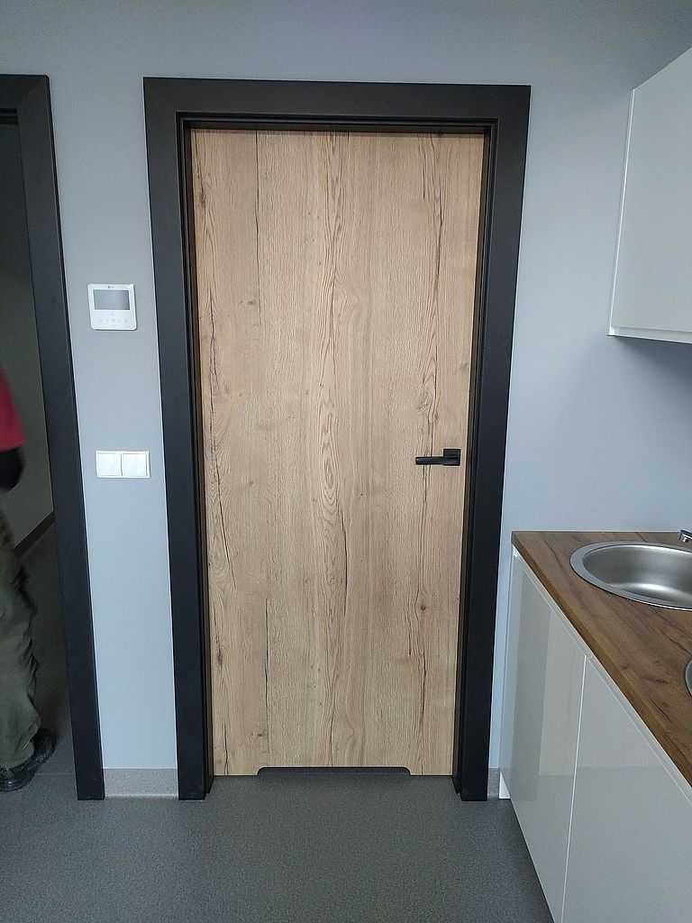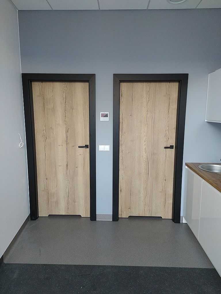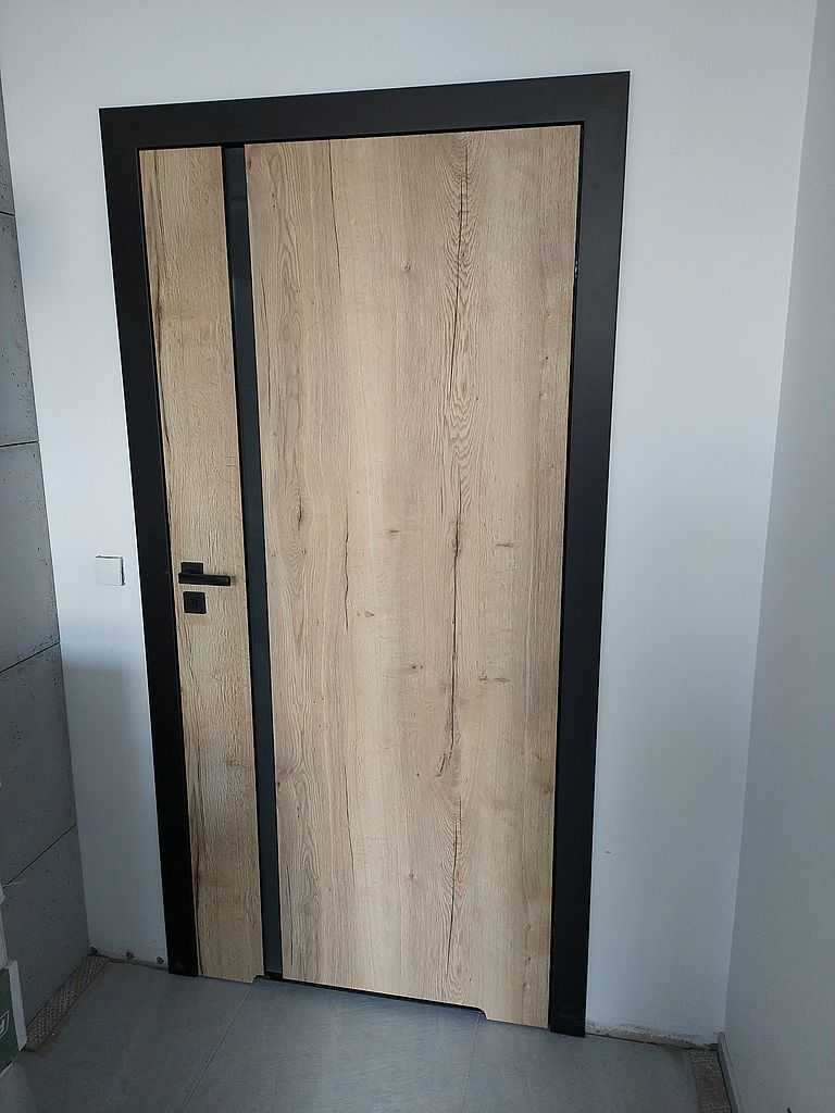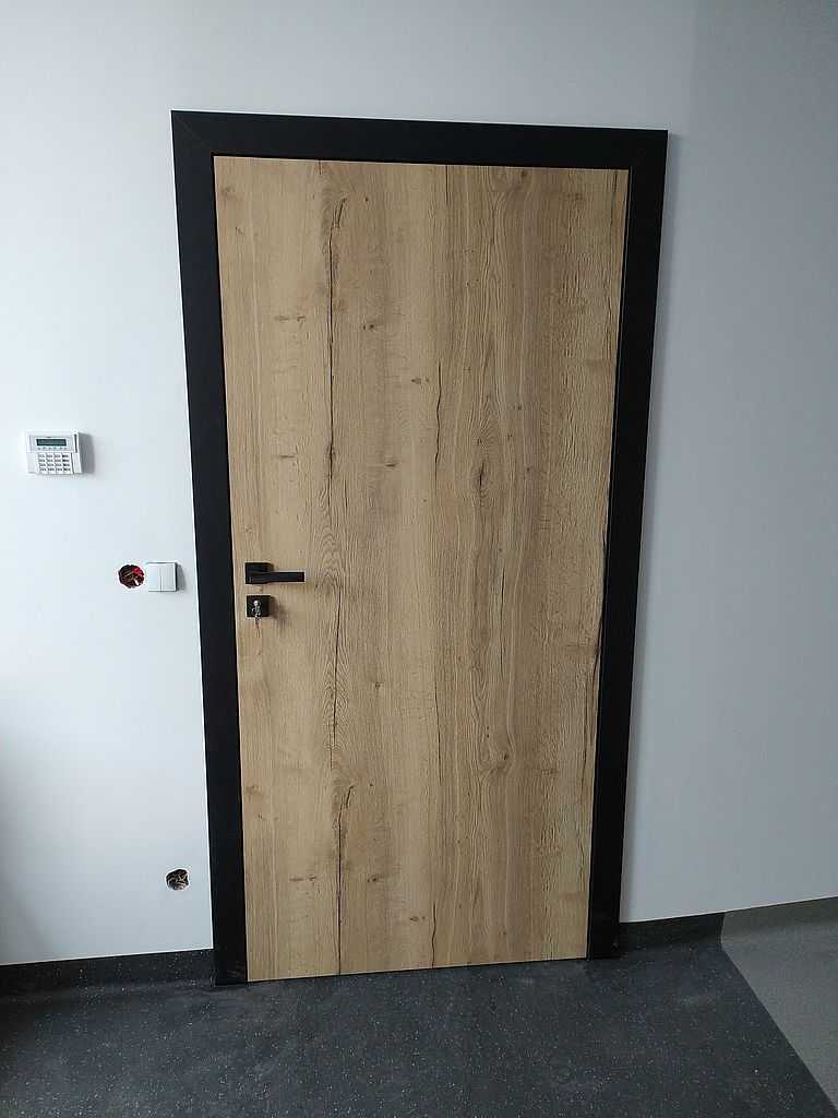 Decydując się na drzwi industrialne świetnym rozwiązaniem będą drzwi Porta Loft. Na załączonych zdjęciach możemy zauważyć zamontowane przez naszą ekipę montażową tego typu stolarkę. Są to drzwi w systemie bezprzylgowym. Oznacza to tyle, że skrzydło wraz z ościeżnicą tworzą jednolitą całość. Drzwi są pozbawione felca, mają ścięty brzeg, dzięki czemu „chowają” się w ościeżnicę tworząc jedną płaszczyznę. Wyposażone w płytę wiórowo-otworową, zamki magnetyczne oraz zawiasy chowane Simonswerk regulowane na trzech płaszczyznach.