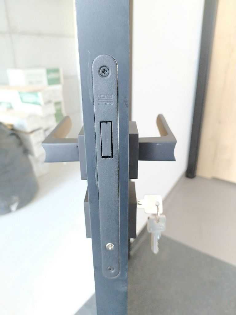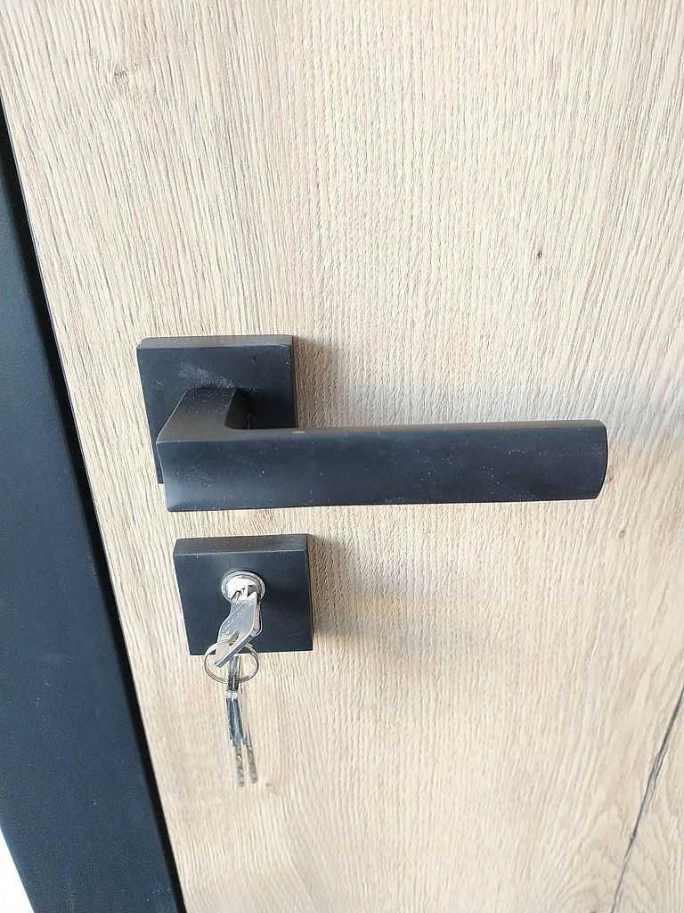 Dopełnieniem całości drzwi industrialnych są okucia. Tutaj zamontowaliśmy klamki Ibiza polskiego producenta Metal -Bud, które kolorystycznie współgrają z cała stolarką.
