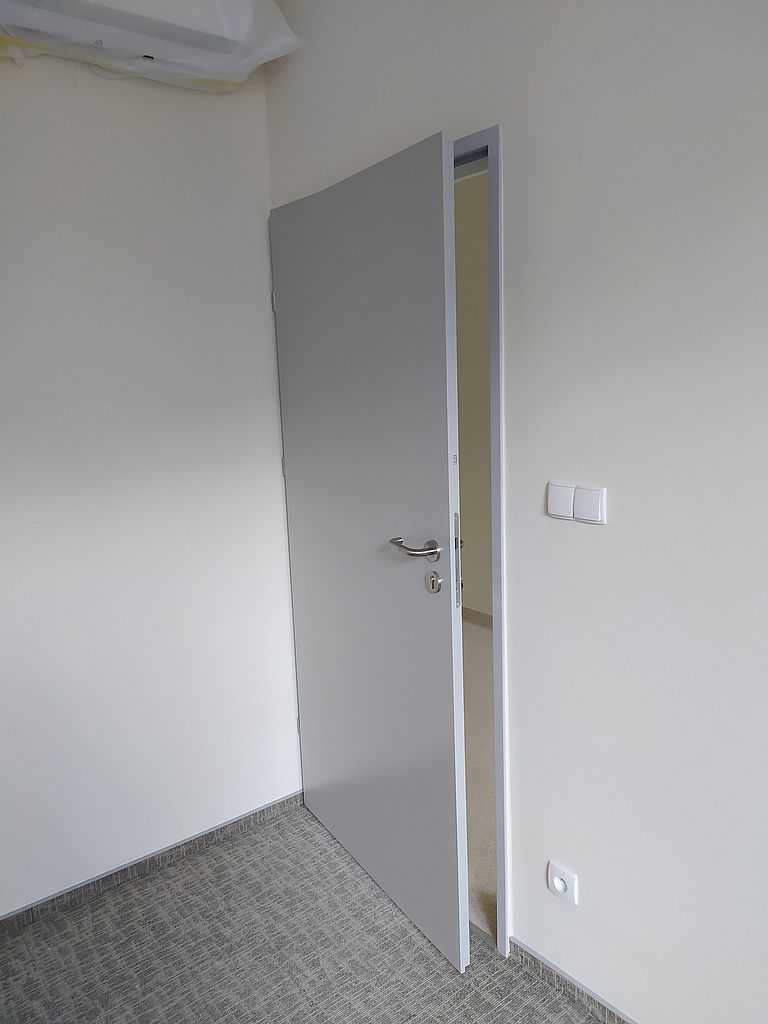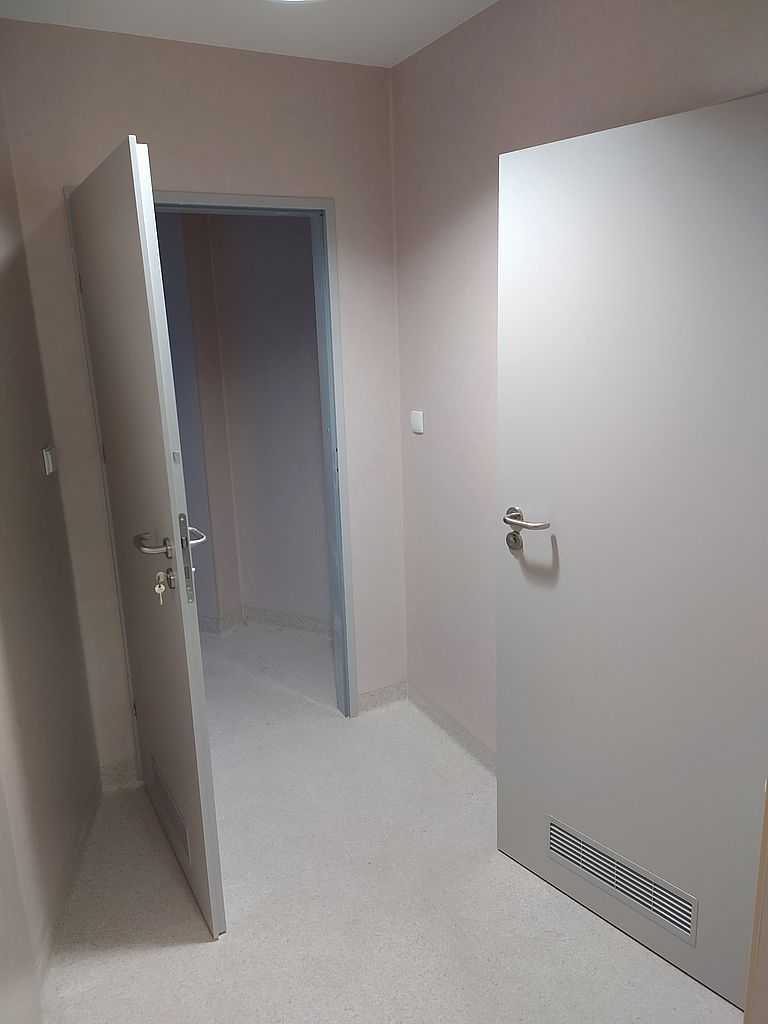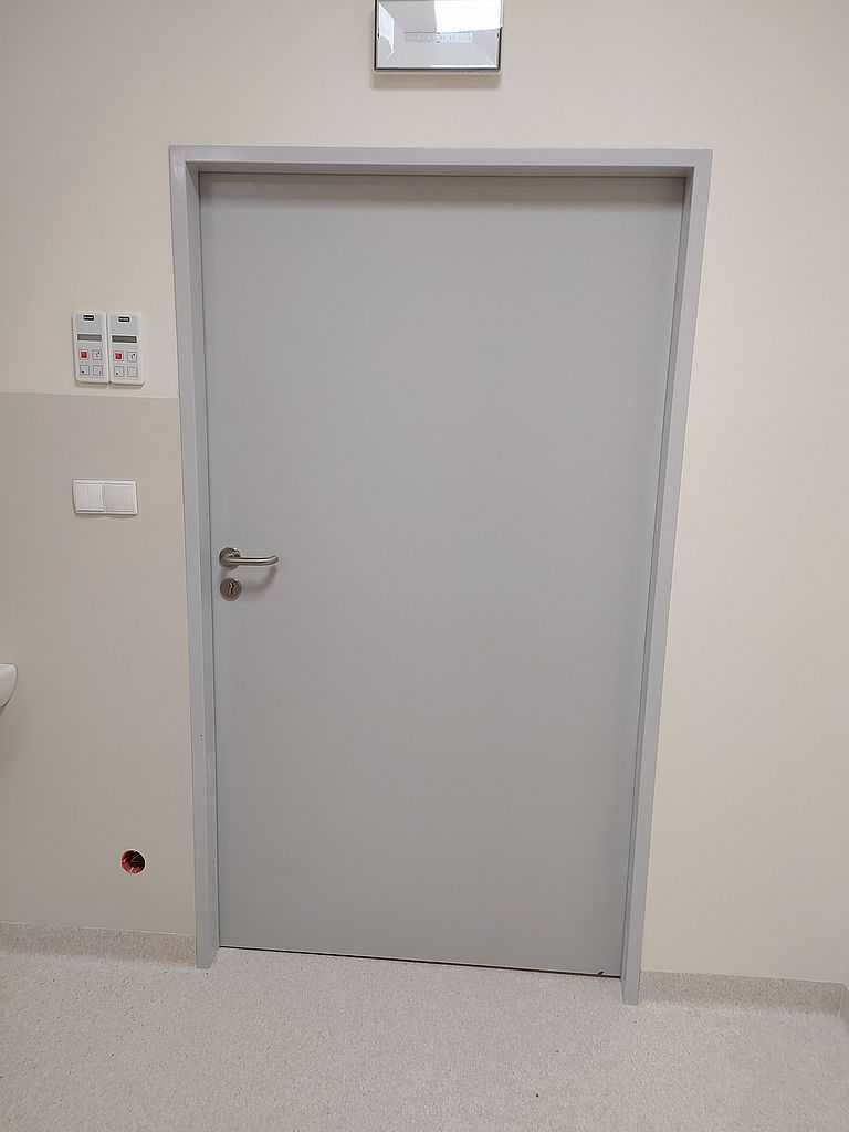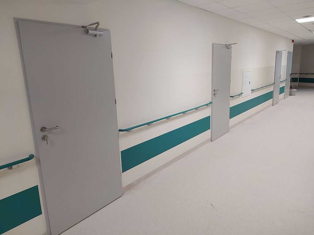 Kolejną realizacją z naszym udziałem była dostawa i montaż drzwi okleinowanych do Szpitala Specjalistycznego im. J. Dietla w Krakowie. Inwestor wybrał drzwi okleinowane CPL producenta Porta. Na załączonej dokumentacji zdjęciowej możemy zobaczyć zamontowane drzwi pełne, płaskie. Model 1.1. o różnych szerokościach. Dzięki wypełnieniu skrzydeł płytą wiórowo-otworową, drzwi posiadają dużo lepszą izolację akustyczną. Są bardziej stabilne oraz wytrzymałe przy eksploatacji, a w szpitalu ma to ogromne znaczenie. Skrzydła popielate w okleinie CPL o grubości laminatu 0,2 mm, którą stosuje się w budynkach użyteczności publicznej. Ten laminat wraz z wykończeniem taśmą brzegową ABS zapewnia optymalną ochronę skrzydeł przed uszkodzeniami mechanicznymi. Ościeżnice metalowe, kątowe. Malowane na kolor RAL 7035. Najbardziej zbliżony do koloru popielatego.