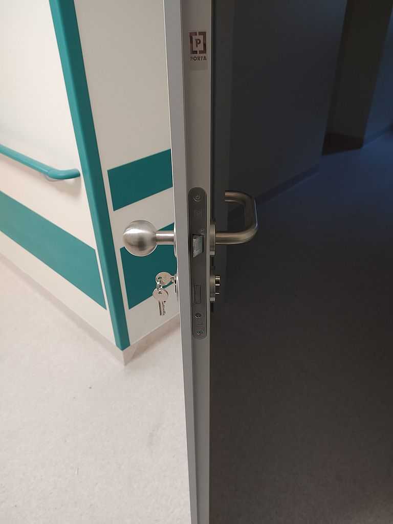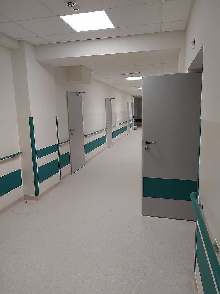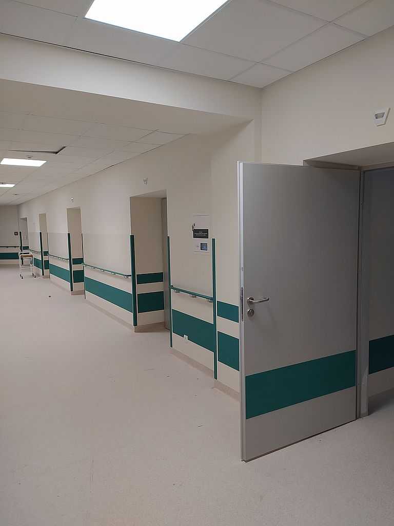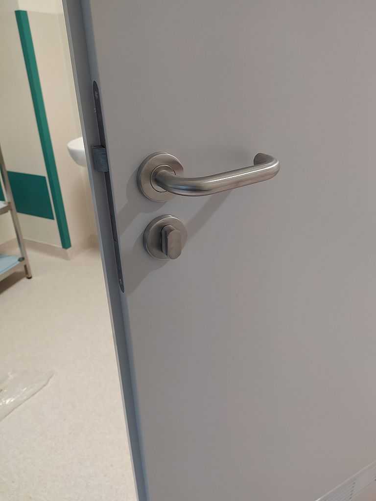 Ważnym punktem w stolarce dla szpitali są okucia. W tym przypadku zastosowaliśmy klamki bezpieczne i klamko-gałki producenta Assa Abloy. Producent ten jest liderem w sprzedaży specjalistycznych okuć m.in. do szpitali. Wykonane są ze stali nierdzewnej, co daje im długowieczność i tak naprawdę są „niezniszczalne”.