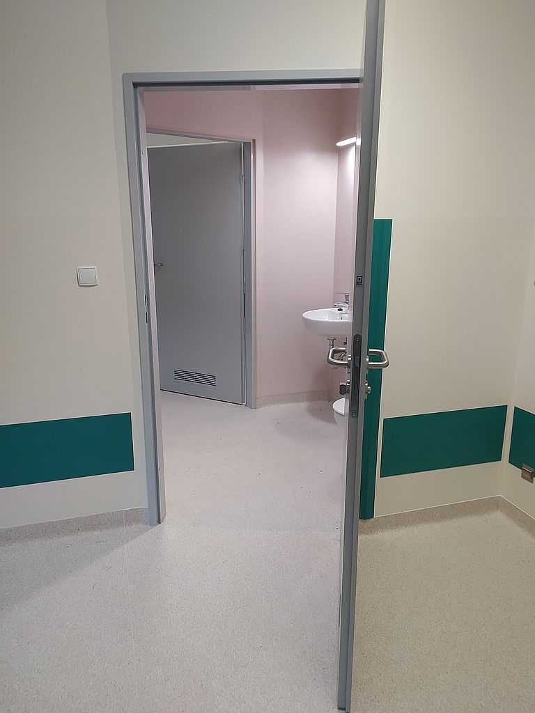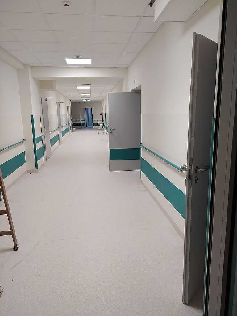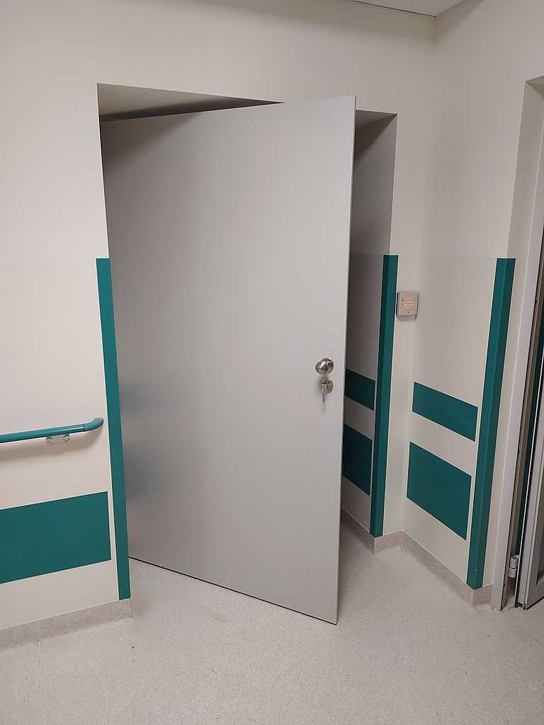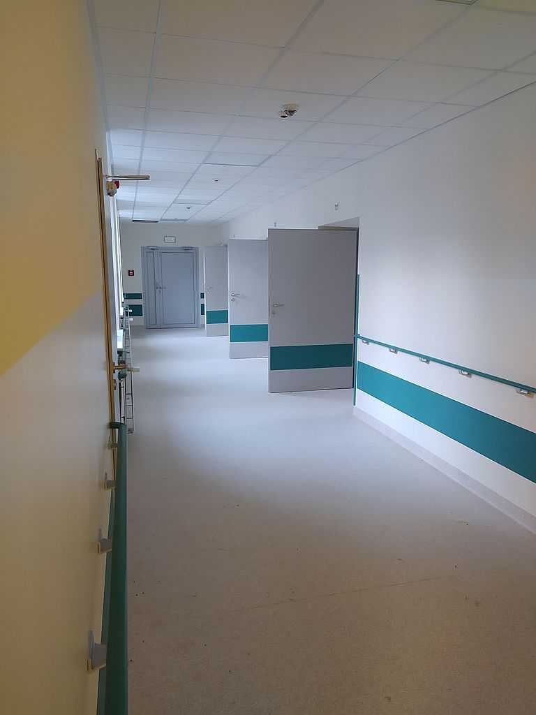 Ważnym punktem w stolarce dla szpitali są okucia. W tym przypadku zastosowaliśmy klamki bezpieczne i klamko-gałki producenta Assa Abloy. Producent ten jest liderem w sprzedaży specjalistycznych okuć m.in. do szpitali. Wykonane są ze stali nierdzewnej, co daje im długowieczność i tak naprawdę są „niezniszczalne”.