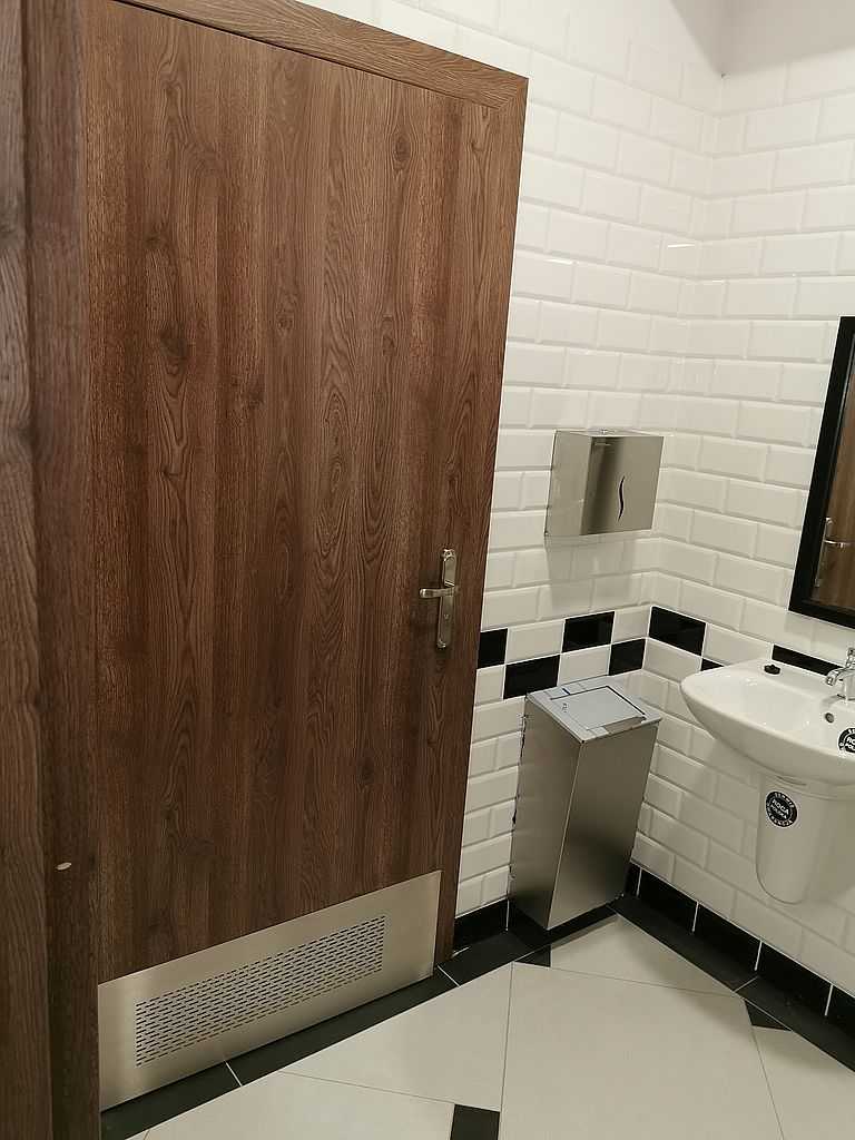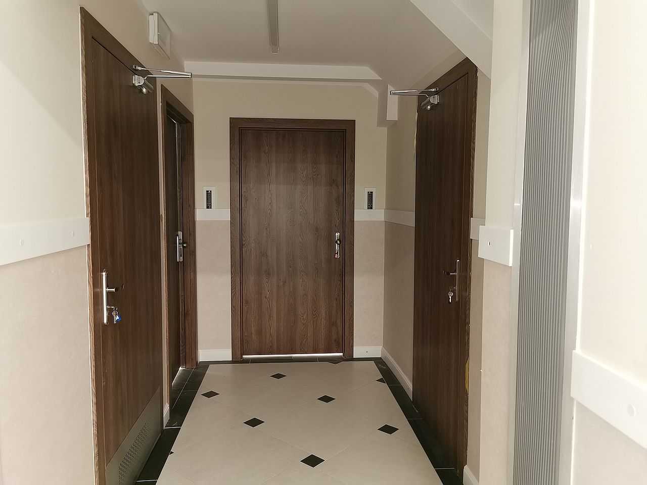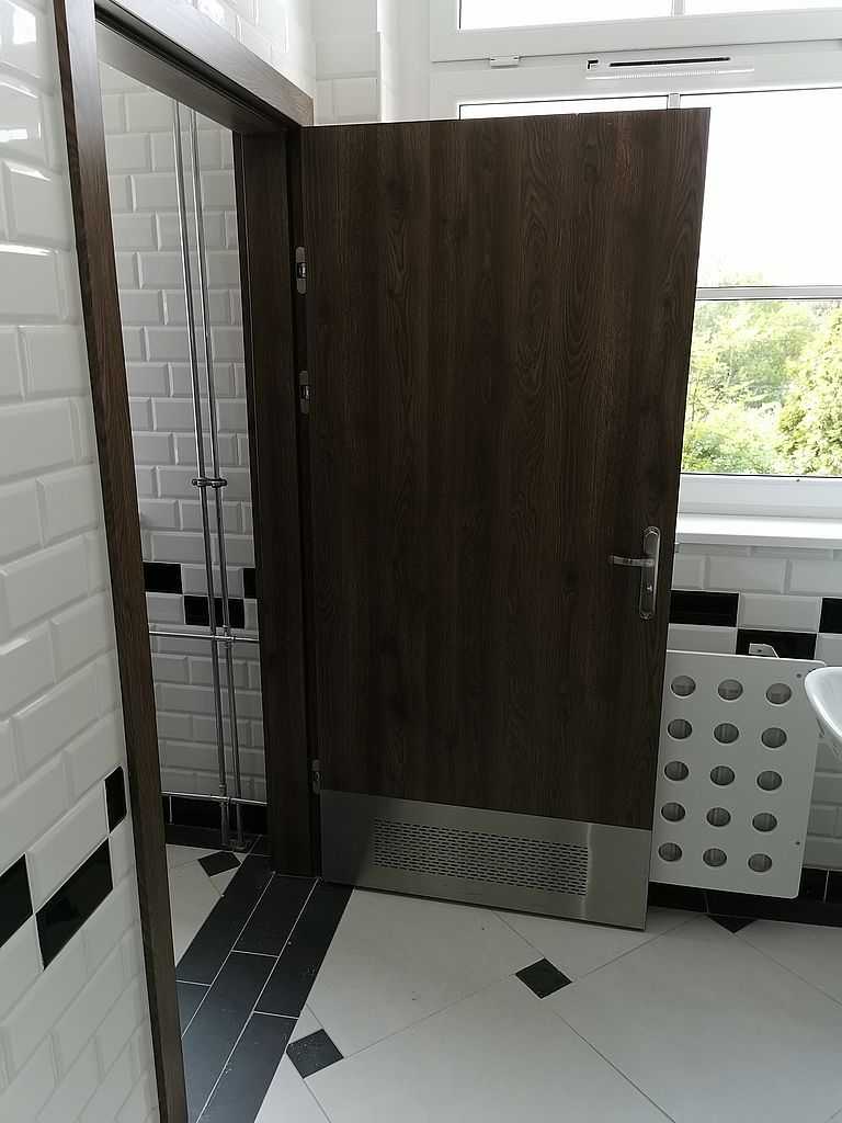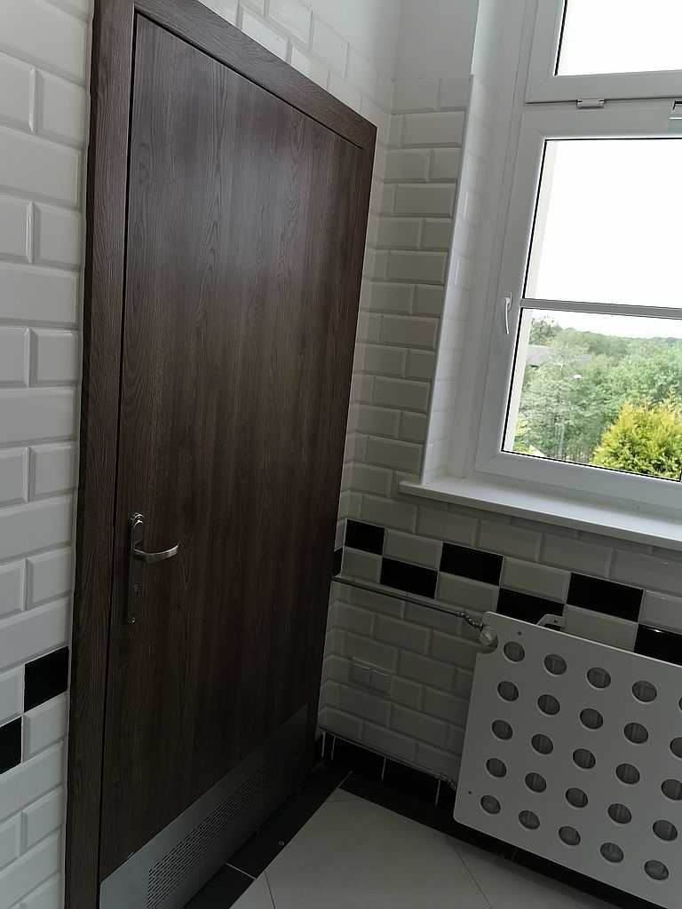 W łazienkach zaś możemy zauważyć drzwi tego samego typu z panelem dolnym wentylacyjnym – kratka wentylacyjna ze stali nierdzewnej u dołu skrzydła połączona z panelem na wysokość ok. 30 cm. Tego typu rozwiązanie stosuje się w budynkach użyteczności publicznej. Wszystko w kolorze ECO TOP, dąb nugat 157. W piwnicach, w pomieszczeniach technicznych możemy zauważyć drzwi stalowe, pełne, białe. Są to drzwi przeciwpożarowe PORTA o odporności ogniowej 60 minut. Wypełnieniem skrzydła jest wysokiej jakości wełna mineralna. Drzwi wyposażone w dwa zawiasy trójelementowe. Jeden z nich jest zawiasem nośnym, drugi zaś – dzięki zamontowanej w nim sprężynie umożliwia samozamykanie drzwi. W komplecie ościeżnica stalowa, kątowa o profilu 110 mm. Wykonana z blachy stalowej o grubości 1,5 mm. Całość malowana na kolor RAL 9016. Okucia jakie zastosowaliśmy to samozamykacze producenta Assa Abloy i klamki na rozecie podłużnej marki ROOTHKIN. Efekt na załączonej dokumentacji fotograficznej.