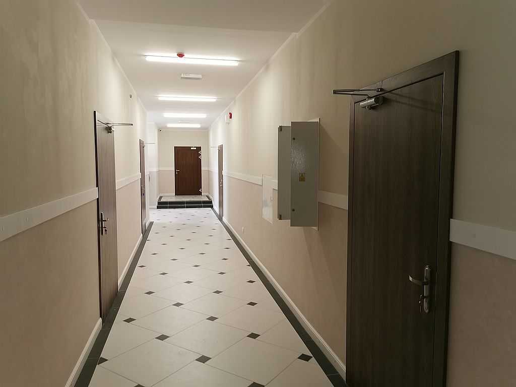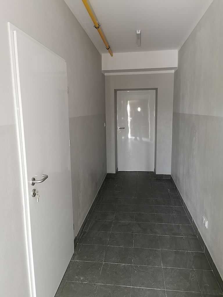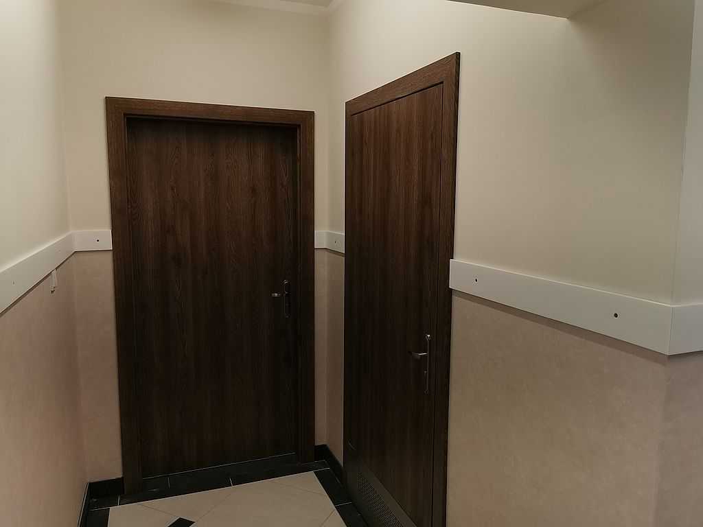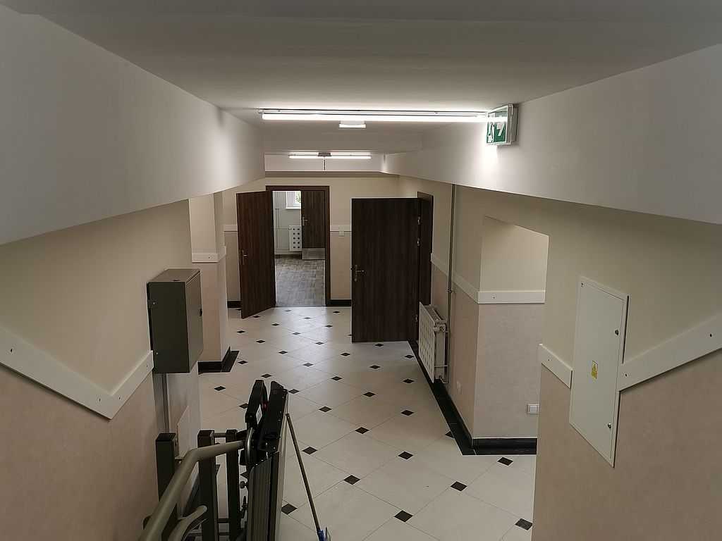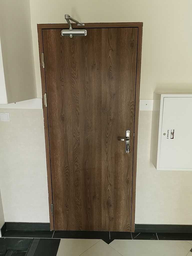 W łazienkach zaś możemy zauważyć drzwi tego samego typu z panelem dolnym wentylacyjnym – kratka wentylacyjna ze stali nierdzewnej u dołu skrzydła połączona z panelem na wysokość ok. 30 cm. Tego typu rozwiązanie stosuje się w budynkach użyteczności publicznej. Wszystko w kolorze ECO TOP, dąb nugat 157. W piwnicach, w pomieszczeniach technicznych możemy zauważyć drzwi stalowe, pełne, białe. Są to drzwi przeciwpożarowe PORTA o odporności ogniowej 60 minut. Wypełnieniem skrzydła jest wysokiej jakości wełna mineralna. Drzwi wyposażone w dwa zawiasy trójelementowe. Jeden z nich jest zawiasem nośnym, drugi zaś – dzięki zamontowanej w nim sprężynie umożliwia samozamykanie drzwi. W komplecie ościeżnica stalowa, kątowa o profilu 110 mm. Wykonana z blachy stalowej o grubości 1,5 mm. Całość malowana na kolor RAL 9016. Okucia jakie zastosowaliśmy to samozamykacze producenta Assa Abloy i klamki na rozecie podłużnej marki ROOTHKIN. Efekt na załączonej dokumentacji fotograficznej.