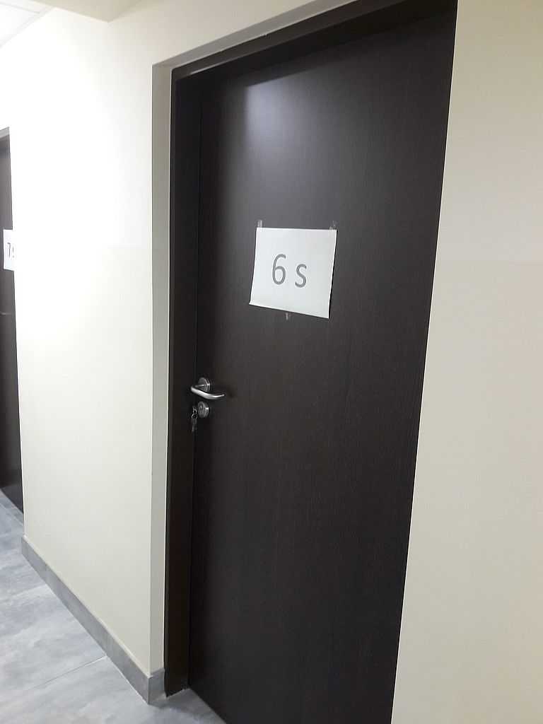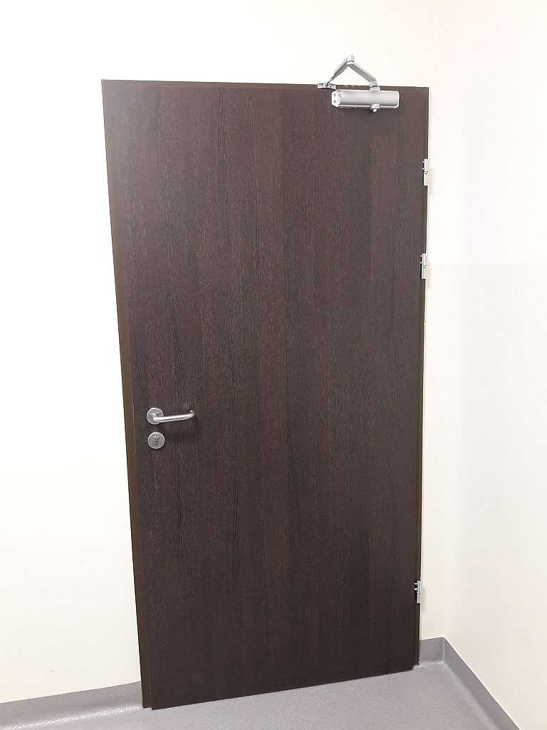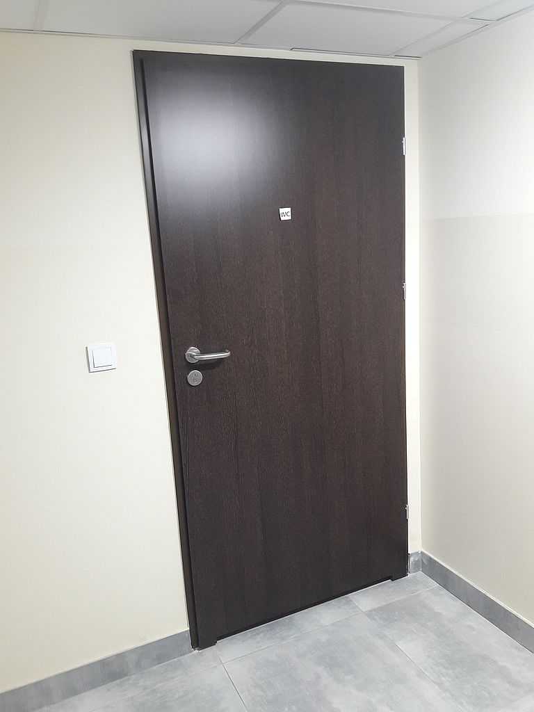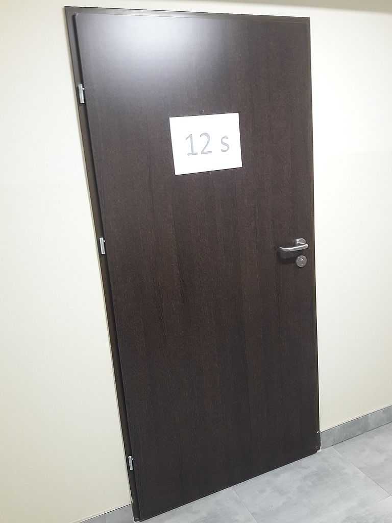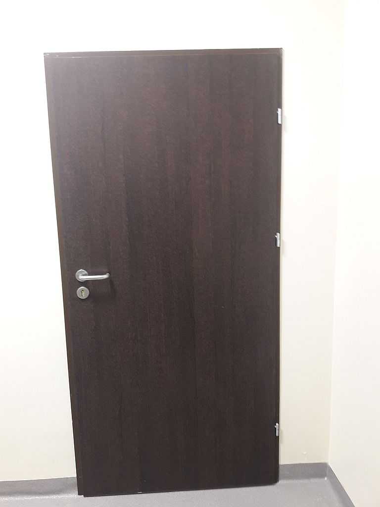 Jako drzwi przeciwpożarowe wstawiliśmy Pol-Skone EI30 SYSTEMU HALSPAN. Skrzydła z izolacyjnością akustyczną 32 dB. W kolorze wenge 265, o rozmiarze „90 PLUS”. To znaczy z tak zwanym pełnym światłem przejścia. Skrzydła zamontowaliśmy na ościeżnicach stałych, metalowych, malowanych na kolor RAL 8014. Ościeżnice te ą wykonane z blachy stalowej o grubości 1,5 mm. Drzwi są wyposażone w zawiasy OLTAV, uszczelkę opadającą oraz zamek wpuszczany.