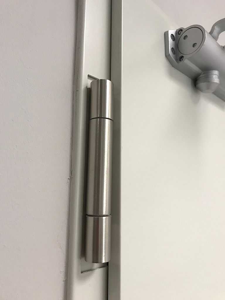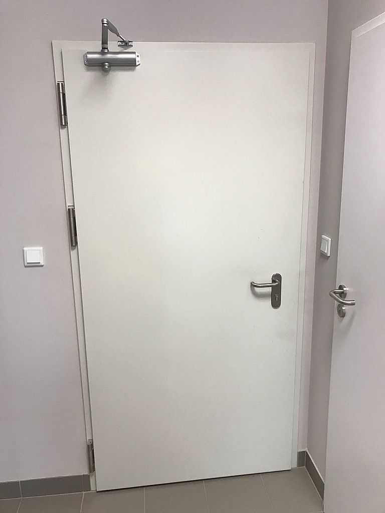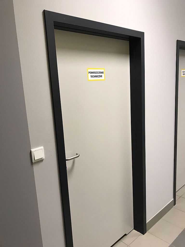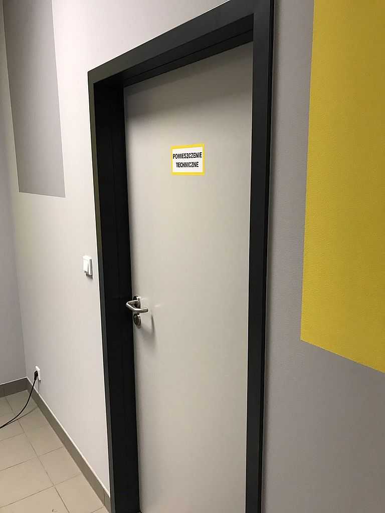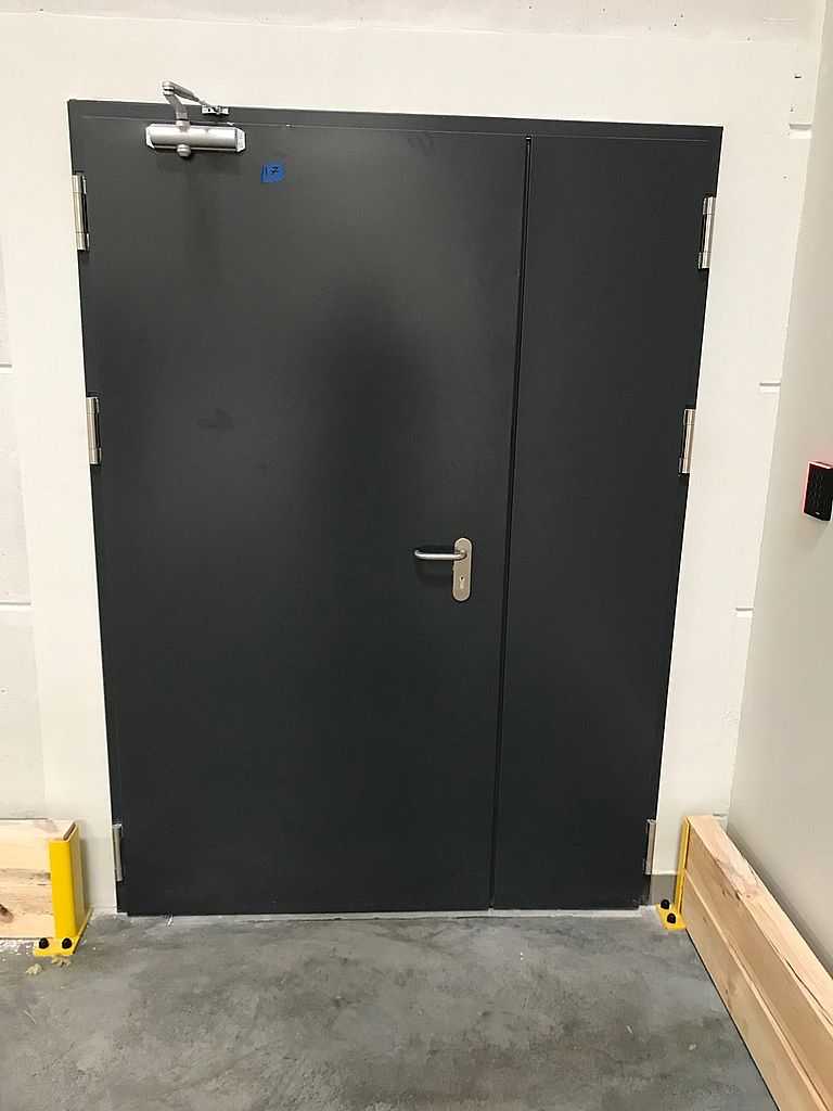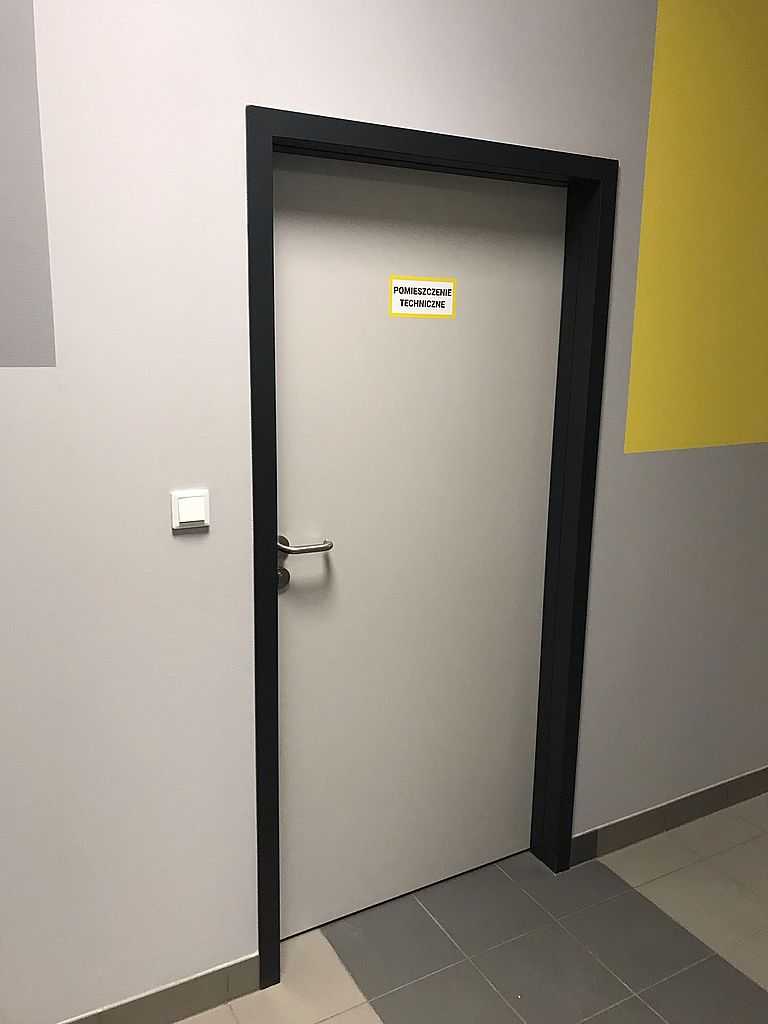 Kolejnymi skrzydłami były drzwi techniczne, stalowe, dwuskrzydłowe, przeciwpożarowe firmy MERCOR ASSA ABLOY. Posiadają one odporność ogniową 120. Malowane na kolor RAL 7024, na ościeżnicy kątowej oraz jednoskrzydłowe w kolorze RAL 7035. Zarówno skrzydła, jak i ościeżnice wykonane są z wysokiej jakości blachy ocynkowanej w oparciu o nieszablonową technologię, która między innymi gwarantuje wysoką odporność na korozję oraz idealną płaszczyznę skrzydła drzwi. Są to drzwi dymoszczelne i wysokiej izolacyjności akustycznej. Wyposażone w zawiasy samozamykające i okucia przeciwpożarowe