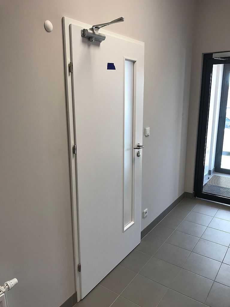 Zasadniczo były to drzwi okleinowane CPL PORTA, model 1.5 z szybą przeźroczystą, w kolorze popielaty euroivest. Na ościeżnicy regulowanej, stalowej w zupełnie odmiennej kolorystyce (RAL 7024). Takie połączenie daje niebanalne zestawienie i nowoczesny design. Ten rodzaj drzwi jest głównie przeznaczony do budynków użyteczności publicznej z uwagi na formę wykonania. Zastosowaliśmy wysokiej jakości okucia: samozamykacz ramieniowy DC 120 producenta Assa ABLOY oraz klamki bezpieczne tego samego producenta .