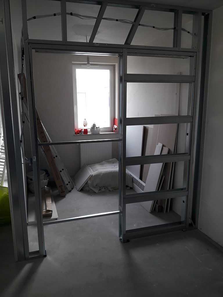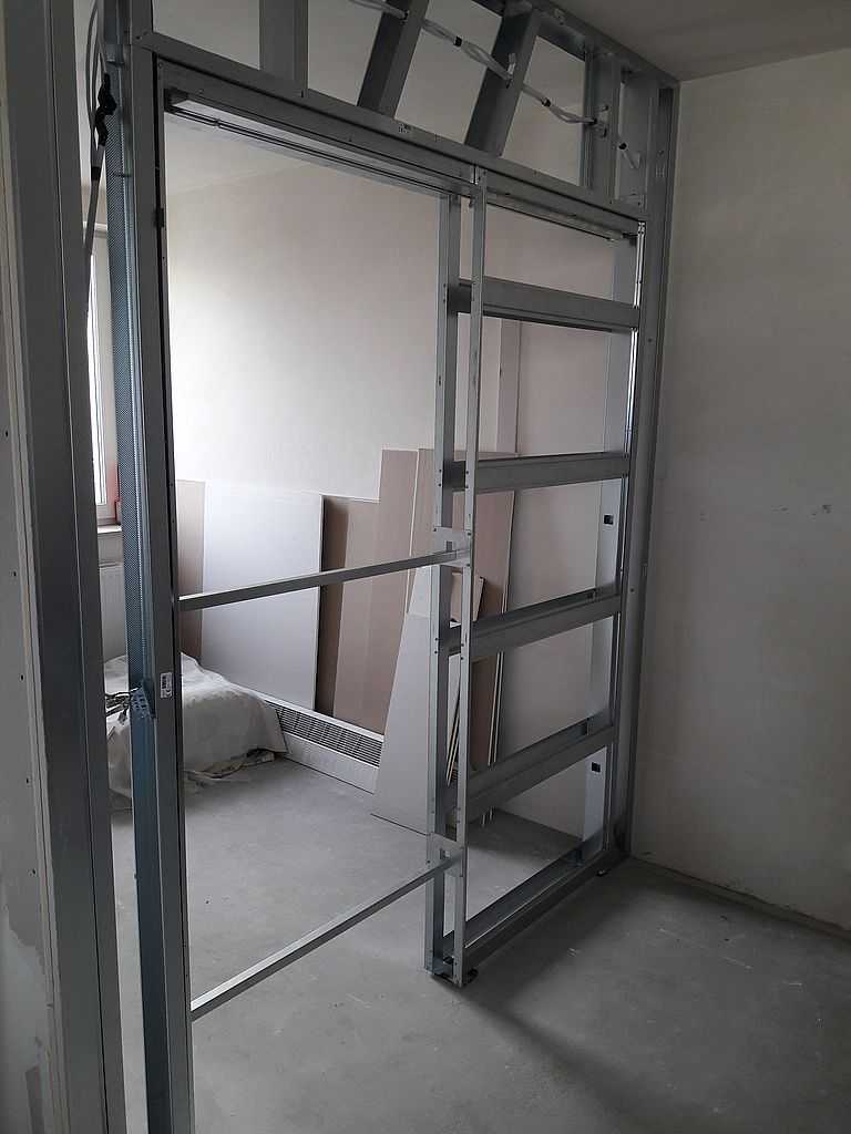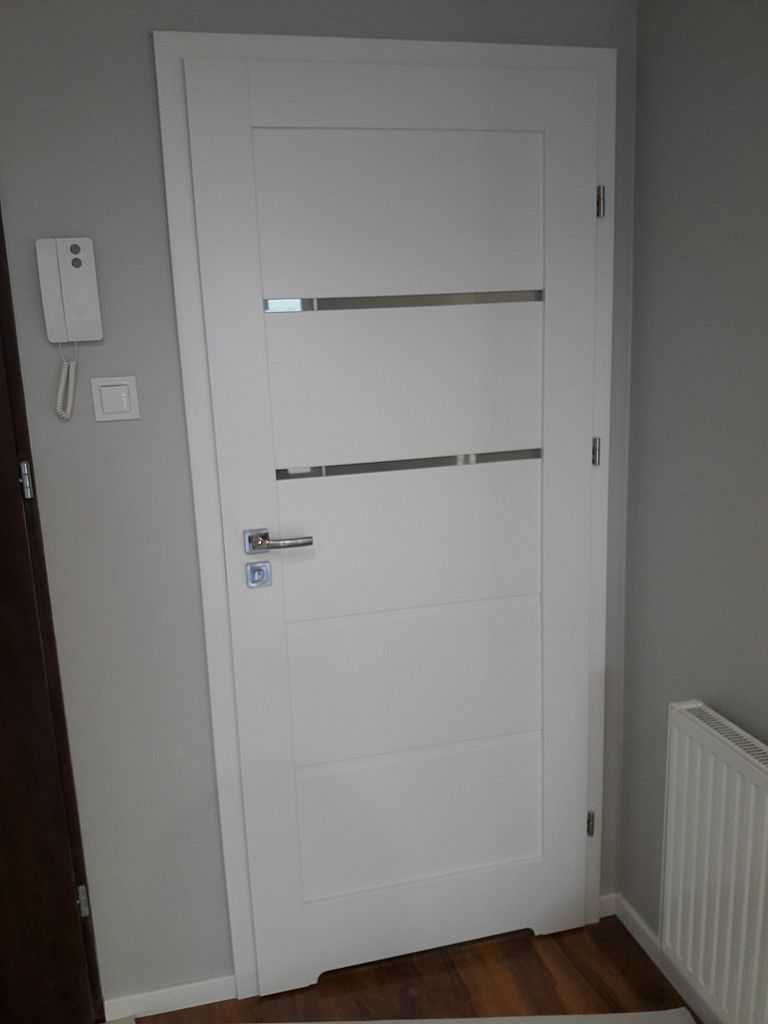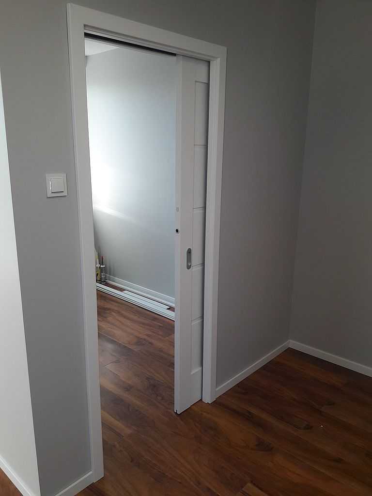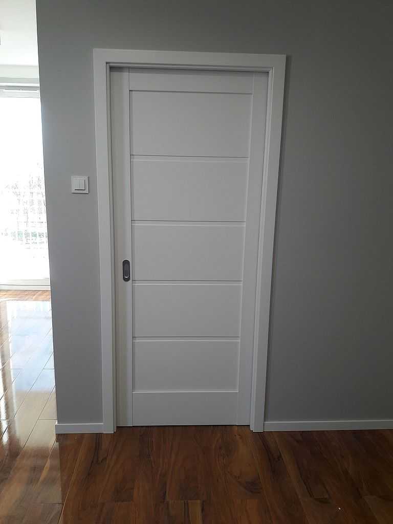 Drzwi Porta Verte Złocień. Na ul. Domagały, nasi montażyści zamontowali drzwi Porta Verte, model G.0., w kolorze białym – decor. Skrzydła o szerokości „80” – suwane w kasecie, które przy otwarciu chowają się w ścianę (na załączonych zdjęciach, można dokładnie zobaczyć, jak wygląda przebieg montażu drzwi chowanych w ścianie) – tzw. „System przesuwny KOMPAKT” Dodatkowo zamontowaliśmy model Verte G.2. – jako łazienkowe „80”, z wentylacją w postaci podcięcia wentylacyjnego. Na ościeżnicy regulowanej w zakresie 12-14, kątowniki 60 mm. Jako okucia klientka wybrała pochwyt podłużny w drzwiach suwanych (chrom-mat) oraz klamkę producenta METAL-BUD Camila na rozecie kwadratowej.