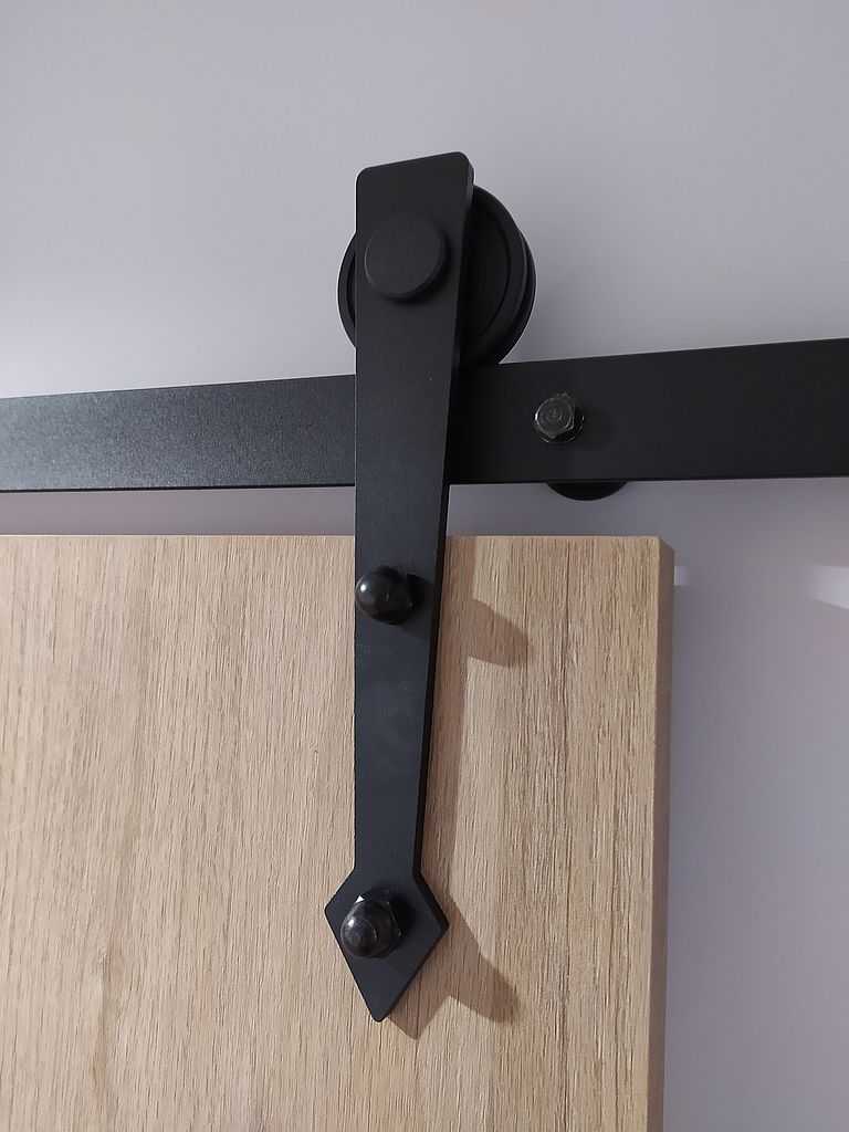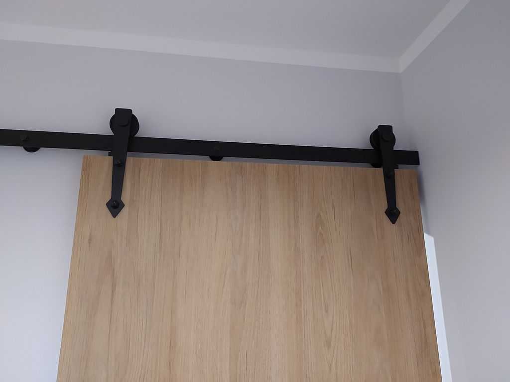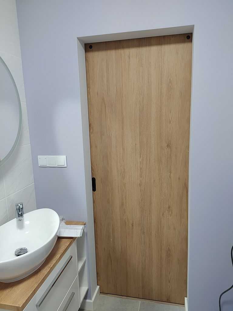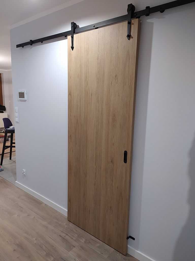 Na takie rozwiązanie zdecydował się Klient, któremu bardzo spodobało się takie rozwiązanie. W nowo wybudowanym domu, nieopodal Krakowa nasza ekipa montażowa dostarczyła i zamontowała drzwi przesuwne typu loft polskiego producenta Erkado. Klient spośród wielu możliwości wybrał skrzydła okleinowane w kolorze dąb premium. Kolor ten świetnie imituje naturalne drewno. Cały zestaw typu loft składa się z metalowego systemu naściennego, skrzydła przesuwnego oraz samozamykacza. Skrzydło jest bezprzylgowe, a zamiast zamka i klamki posiada pochwyt. W tym wypadku owalny w kolorze czarnym matowym, który kolorystycznie świetnie komponuje się z systemem przesuwnym.