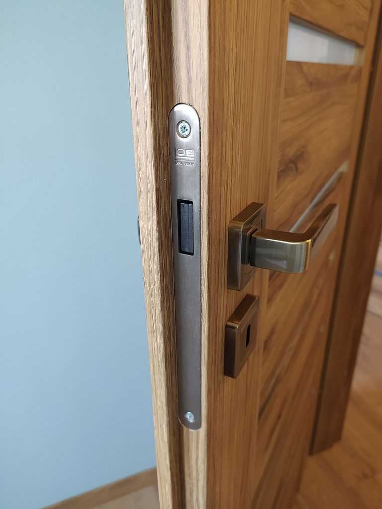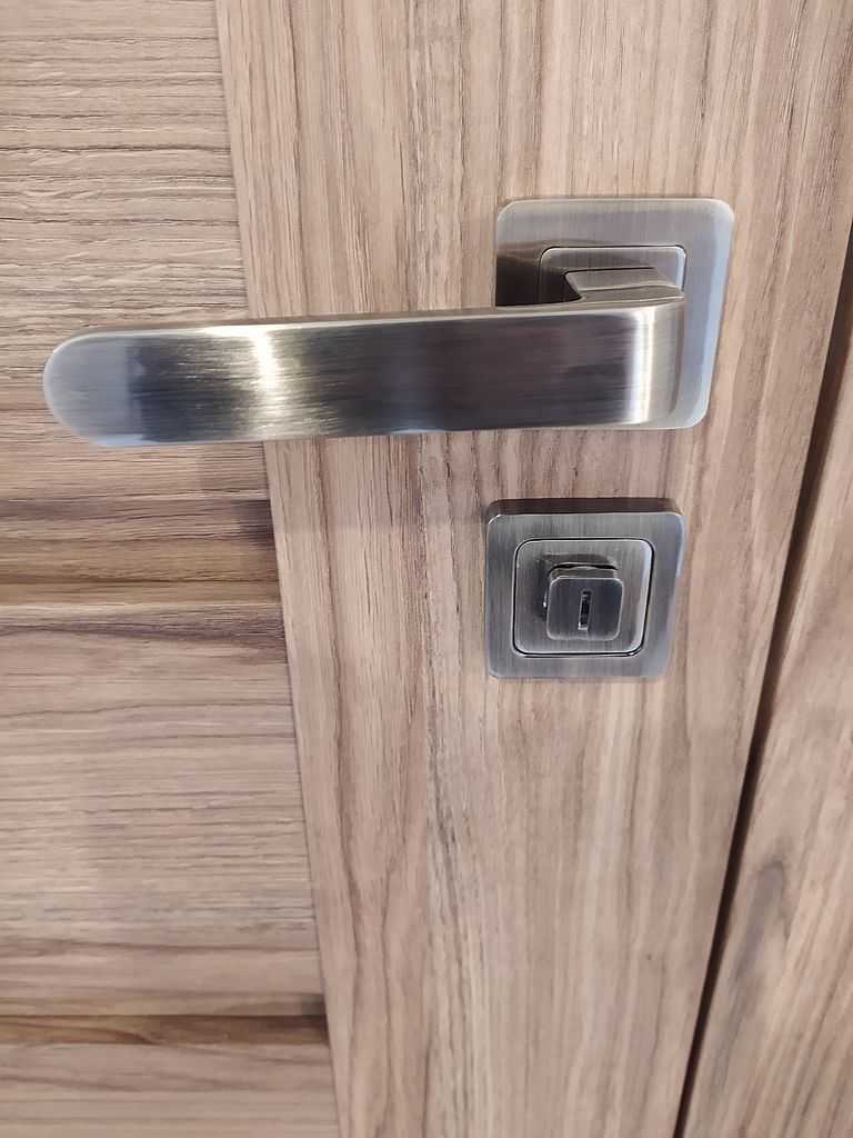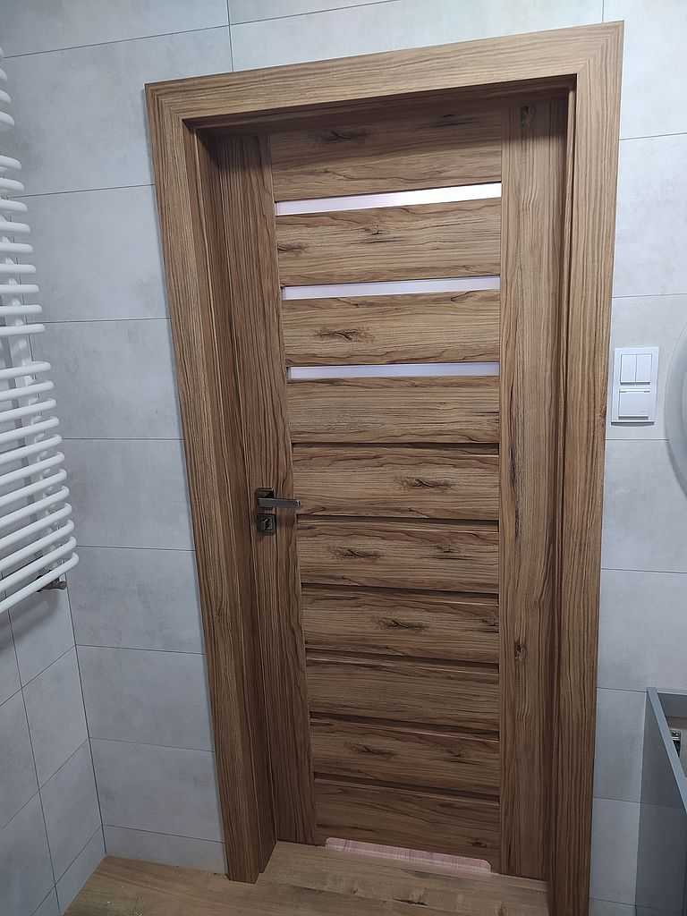 Klient zdecydował się na drzwi w systemie przylgowym do pokoi, oraz bezprzylgowym do łazienki. Skrzydła w rozmiarze „80” powieszone na ościeżnicach regulowanych o różnych zakresach regulacji w zależności od grubości muru. Aby całość była spójna zarówno w drzwiach przylgowych i bezprzylgowych opaska ościeżnicy jest w rozmiarze 80 mm. Całość pokryta laminatem – Porta decor w kolorze dąb Catania, który genialnie imituje drewno. Do skrzydeł zamontowaliśmy klamki Rio na rozecie kwadratowej, w kolorze patyna, producenta Metal – Bud.