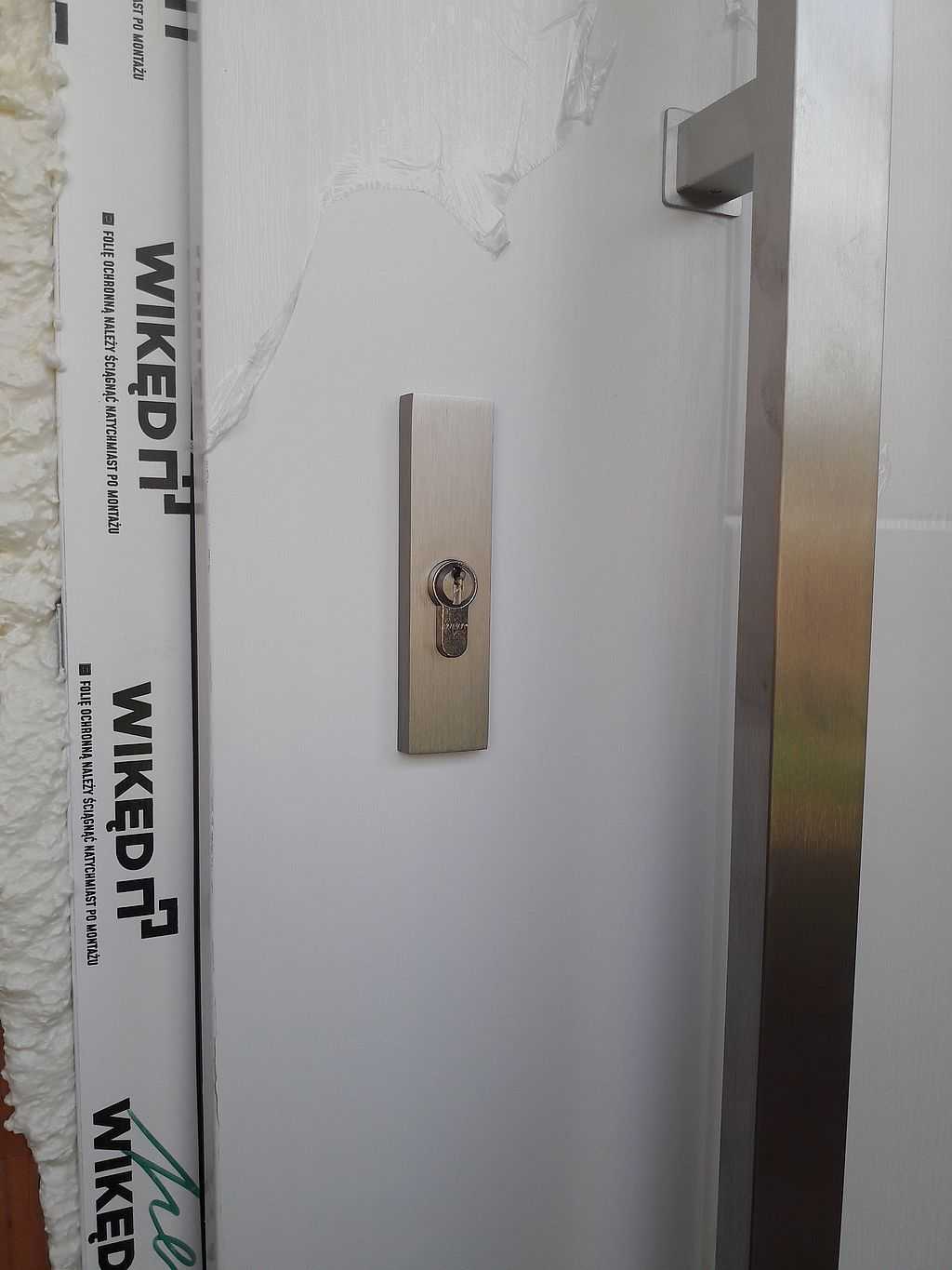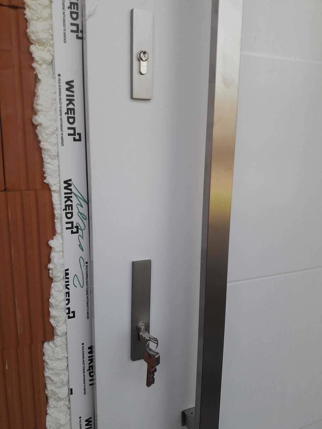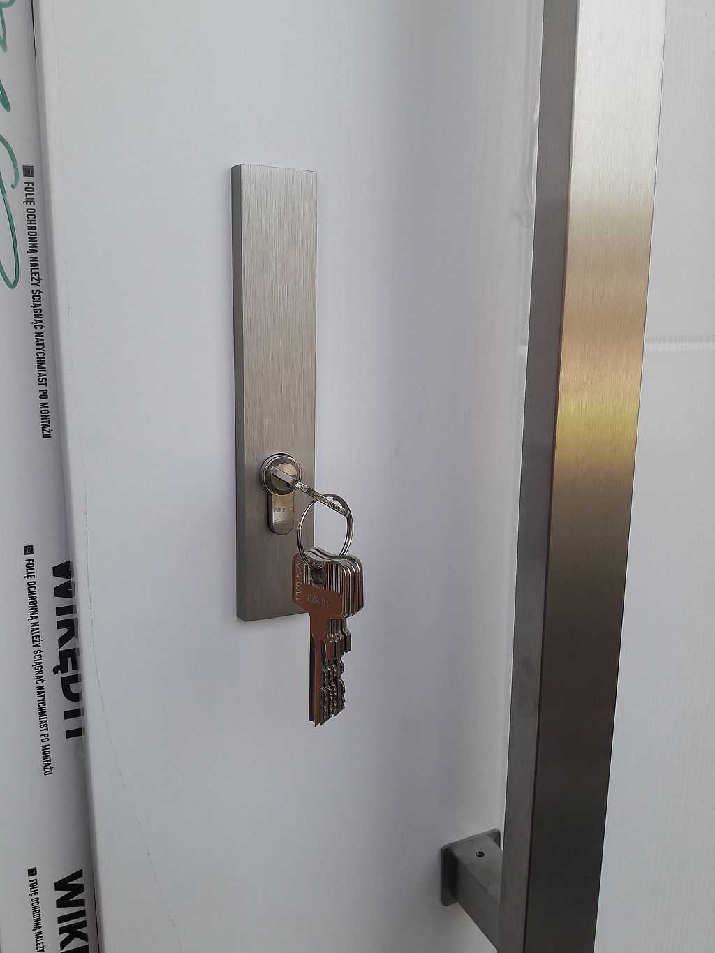 Z uwagi na nowoczesny charakter wykończenia domu jako okucia zaproponowaliśmy pochwyt BETA w kolorze INOX, prostokątny o długości 120 cm – montowany od zewnętrznej strony. Wewnątrz zaś jest dedykowana klamka SOLO oraz rozeta górna, które są zdecydowanie węższe niż standardowe klamki. W komplecie klient również otrzymuje kpl. wkładek (jedna z gałką) w systemie jednego klucza oraz nasadki na zawiasy. Całość w kolorze białym z delikatną strukturą drewna, tak jak stolarka okienna. Efekt na załączonych zdjęciach.