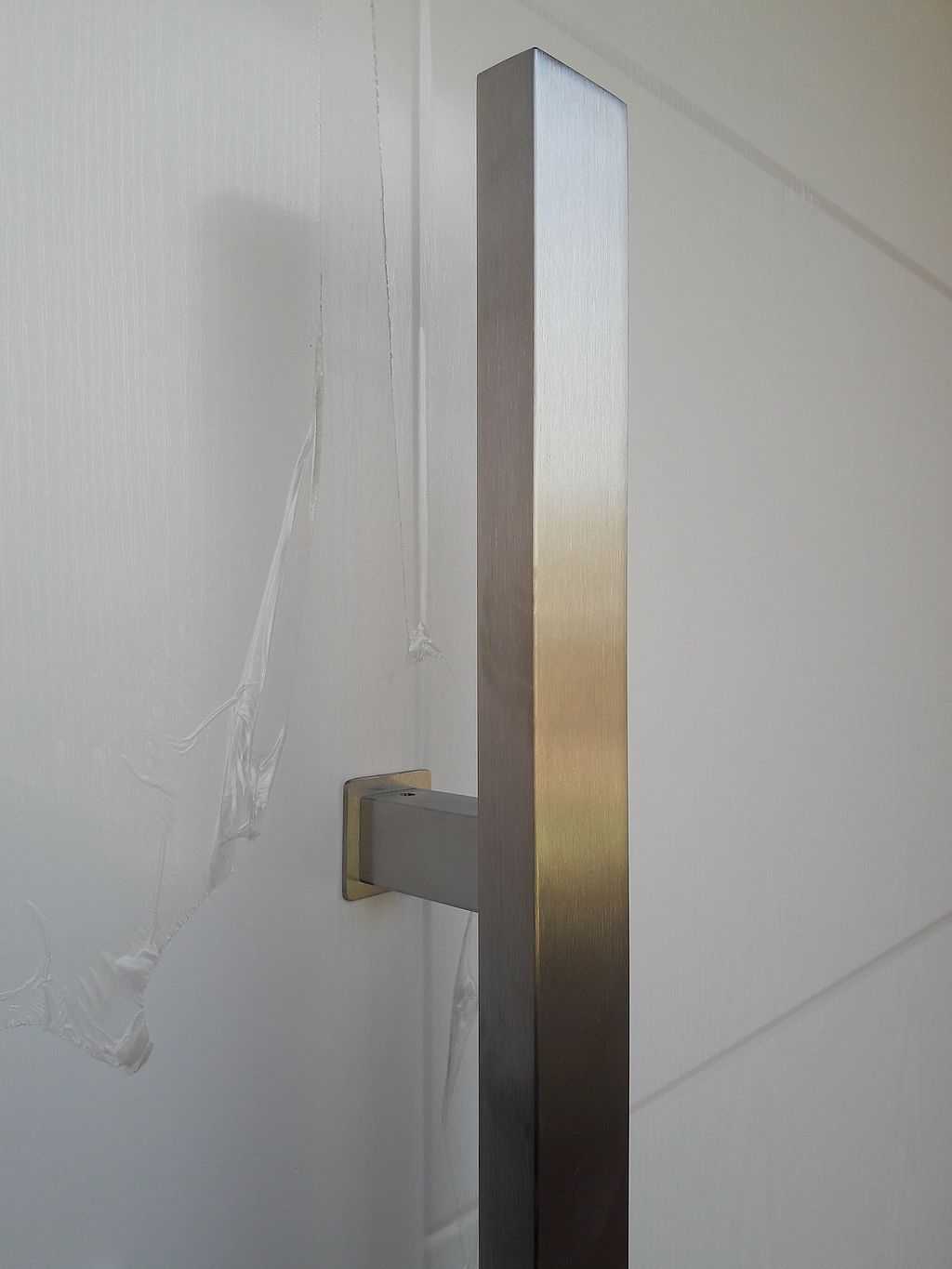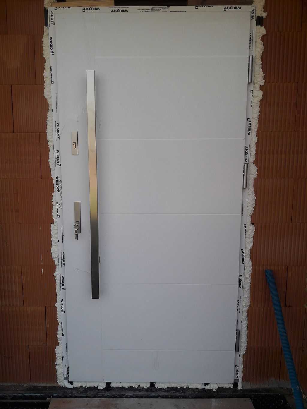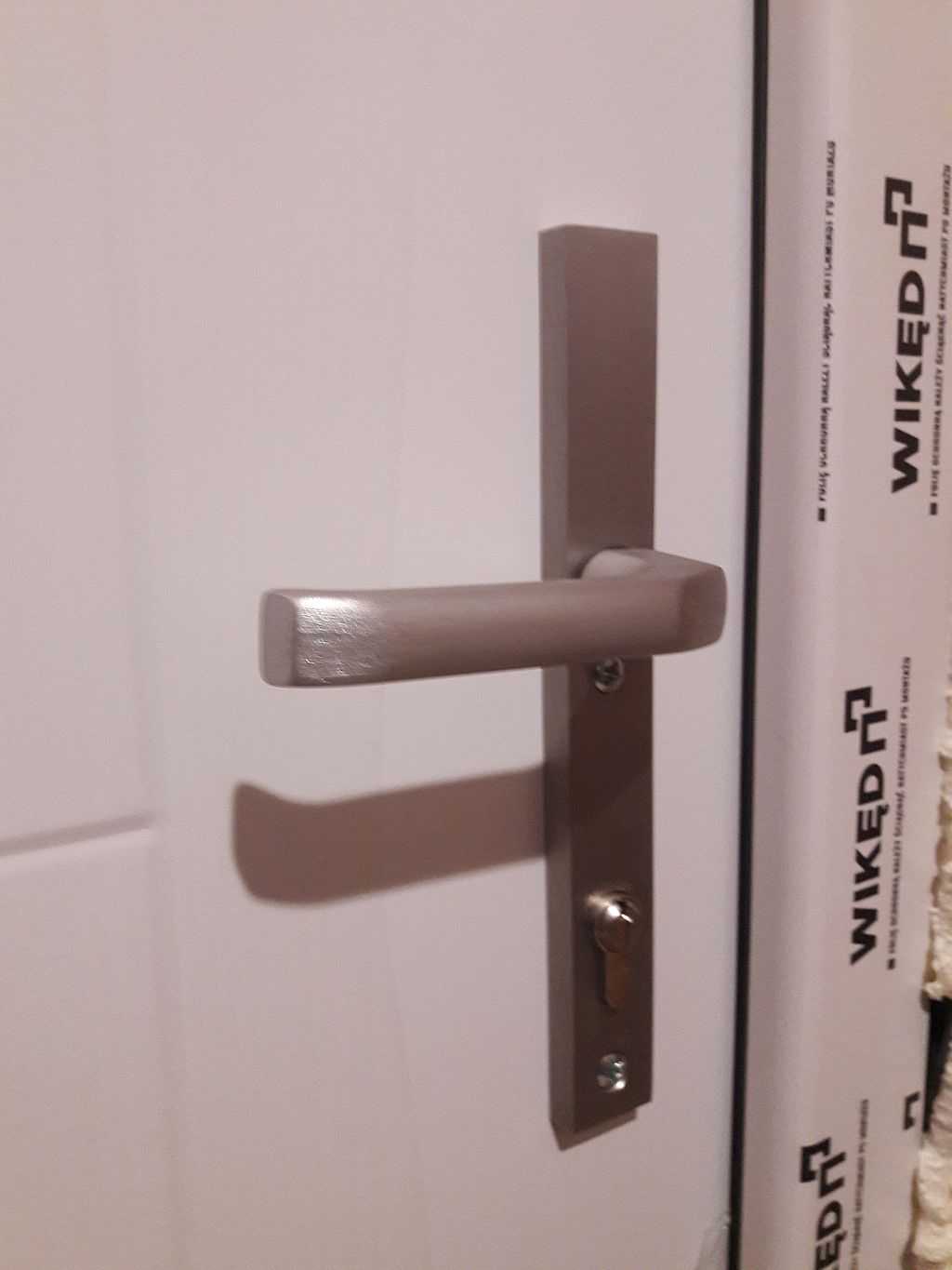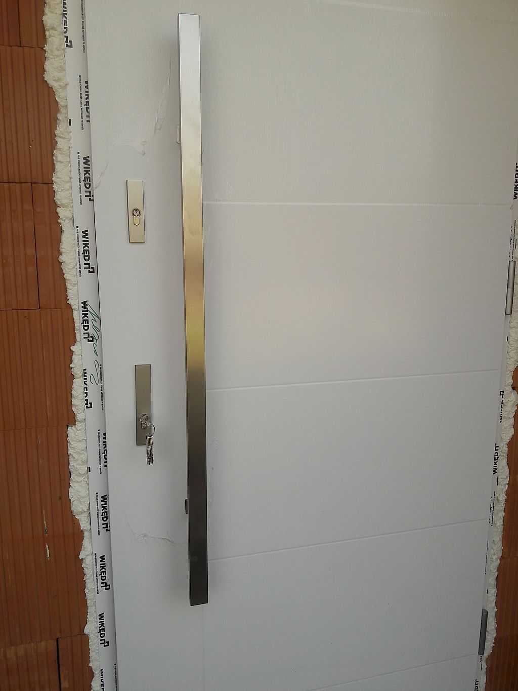 Z uwagi na nowoczesny charakter wykończenia domu jako okucia zaproponowaliśmy pochwyt BETA w kolorze INOX, prostokątny o długości 120 cm – montowany od zewnętrznej strony. Wewnątrz zaś jest dedykowana klamka SOLO oraz rozeta górna, które są zdecydowanie węższe niż standardowe klamki. W komplecie klient również otrzymuje kpl. wkładek (jedna z gałką) w systemie jednego klucza oraz nasadki na zawiasy. Całość w kolorze białym z delikatną strukturą drewna, tak jak stolarka okienna. Efekt na załączonych zdjęciach.
