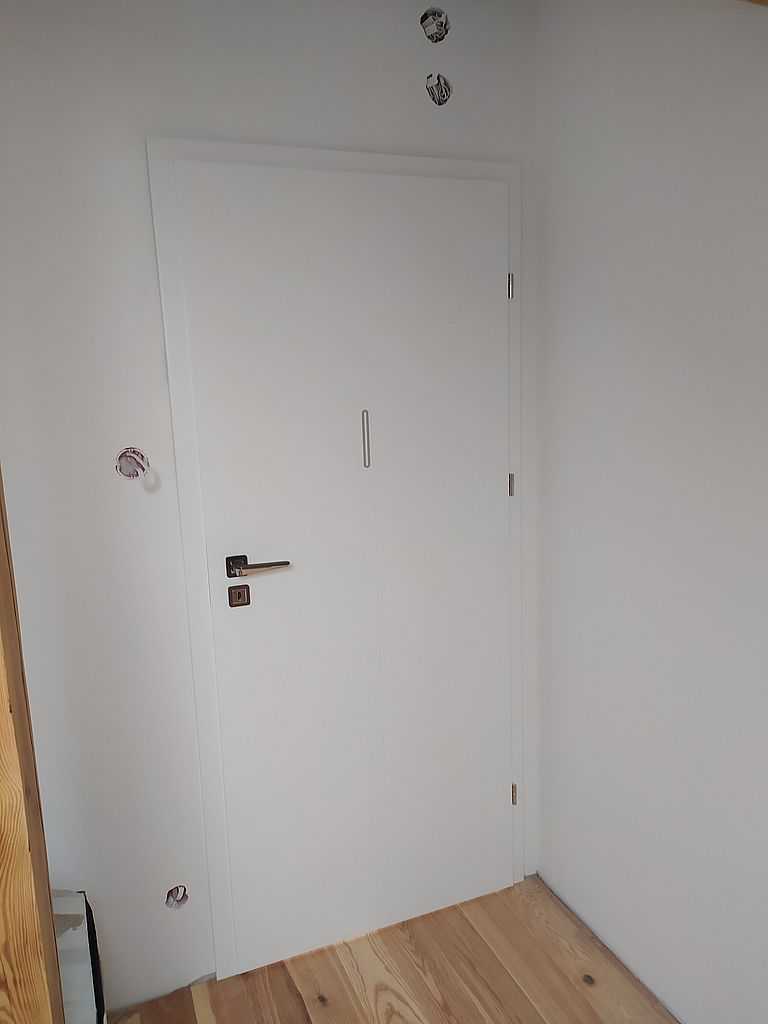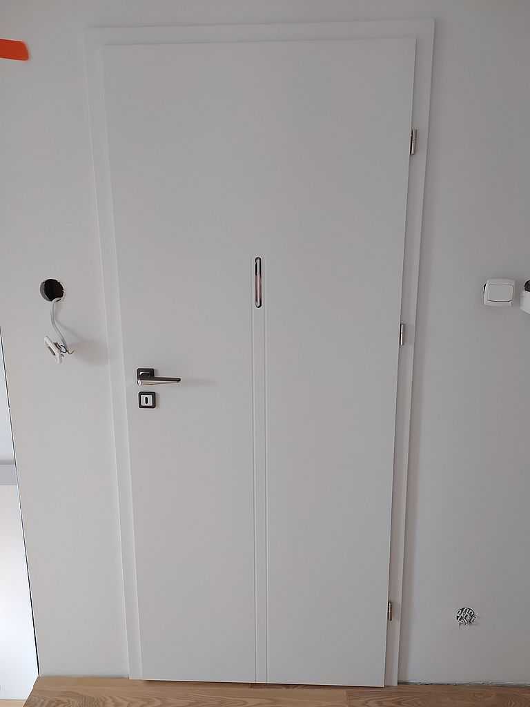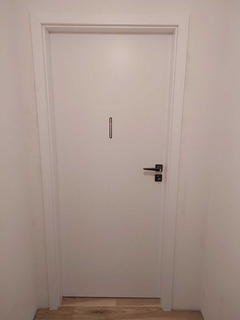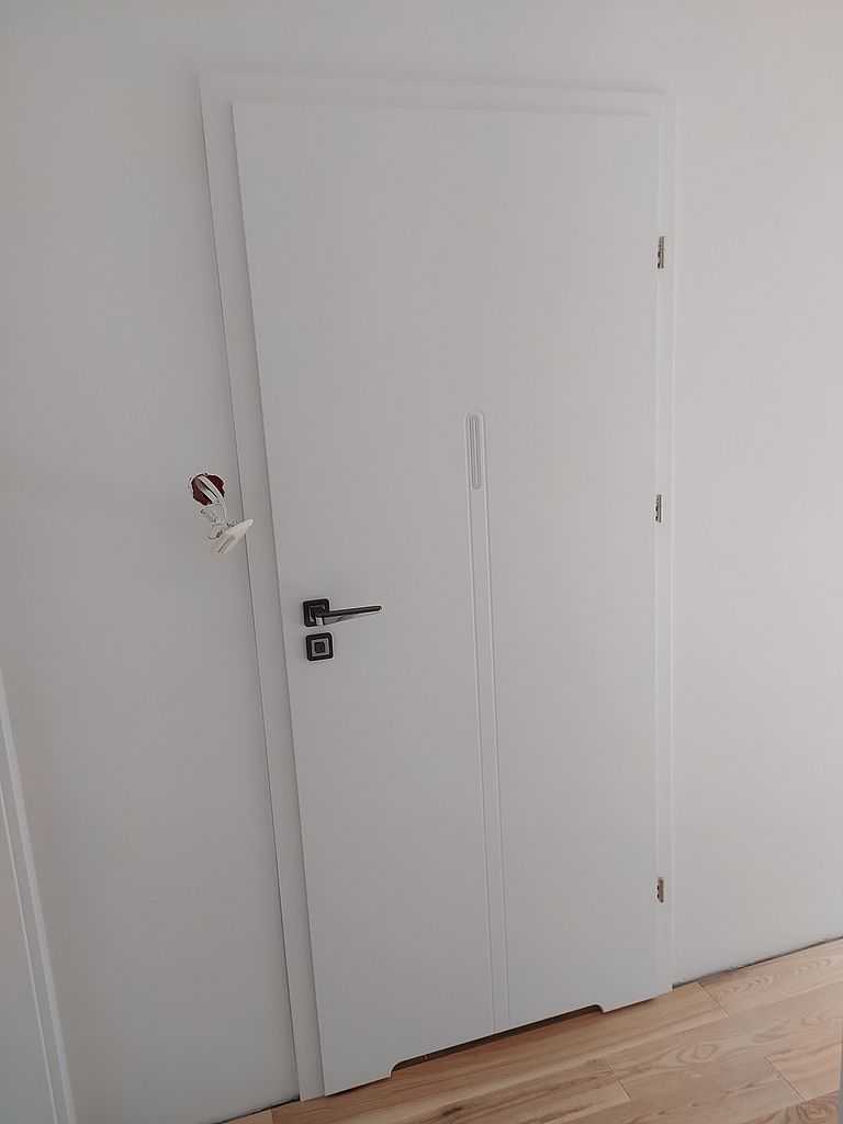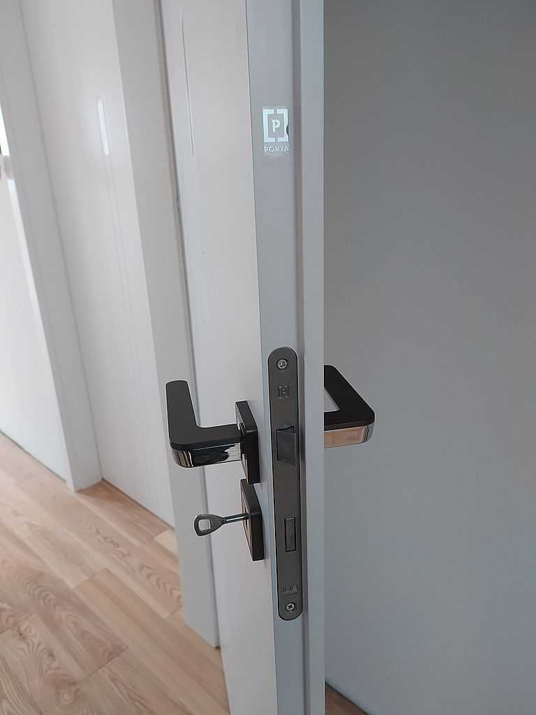 Na załączonej dokumentacji zdjęciowej możemy zauważyć zamontowane drzwi producenta Porta. Klient zdecydował się na model Porta Form, wzór 2, pełne, płaskie. Na szczególną uwagę zasługuje delikatna intarsja, wstawka w górnej części skrzydła, która nadaje całej aranżacji stylu i charakteru. Zamontowaliśmy drzwi Porta w systemie przylgowym o szerokości „80”. W skrzydle łazienkowym wykonaliśmy podcięcie u dołu, celem zapewnienia odpowiedniej wentylacji pomieszczenia, w którym znajduje się dużo wilgoci. Całość powieszona na ościeżnicach regulowanych Porta System o różnych zakresach regulacji z uwagi na grubości muru, z opaskami o szerokości 60 mm. Wszystko malowane na biało. Lakier Premium, który idealnie łączy estetykę wykonania z gwarancją wysokiej jakości użytkowej.