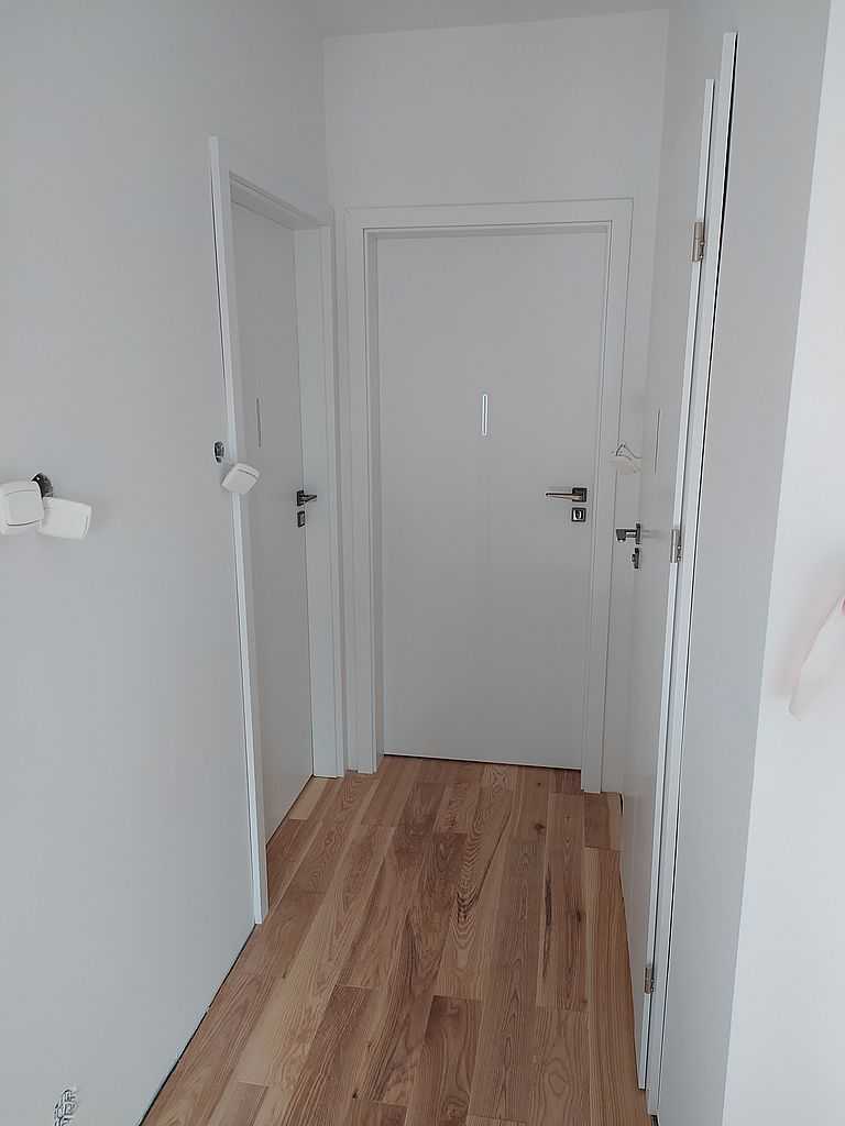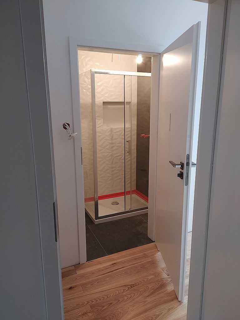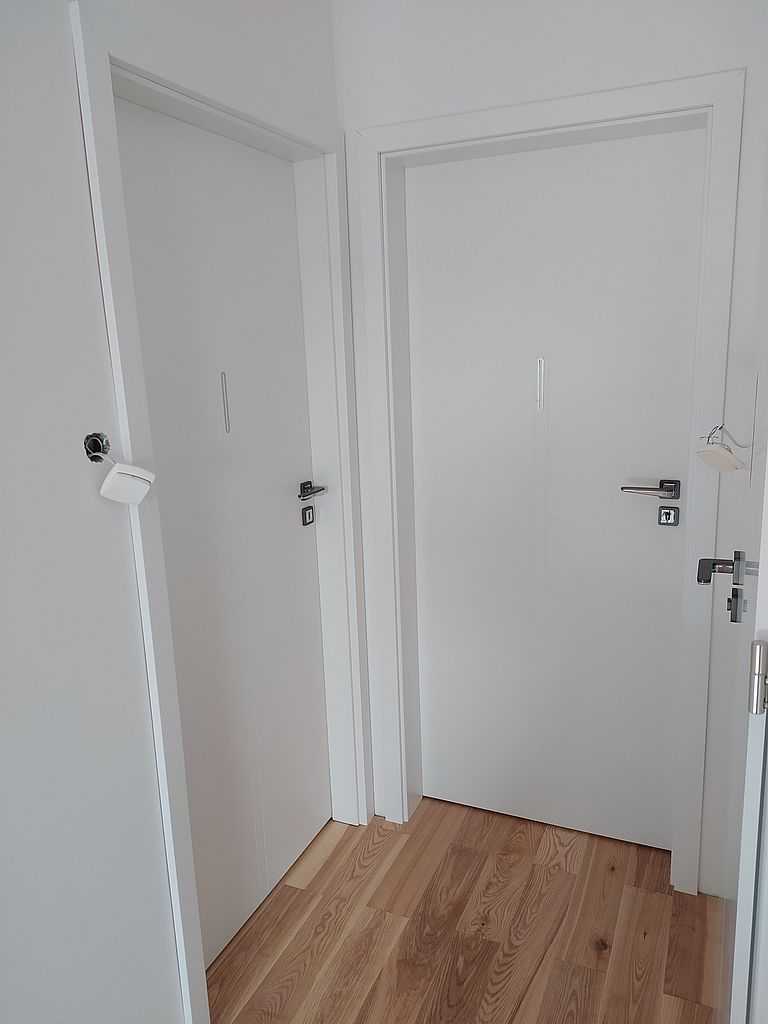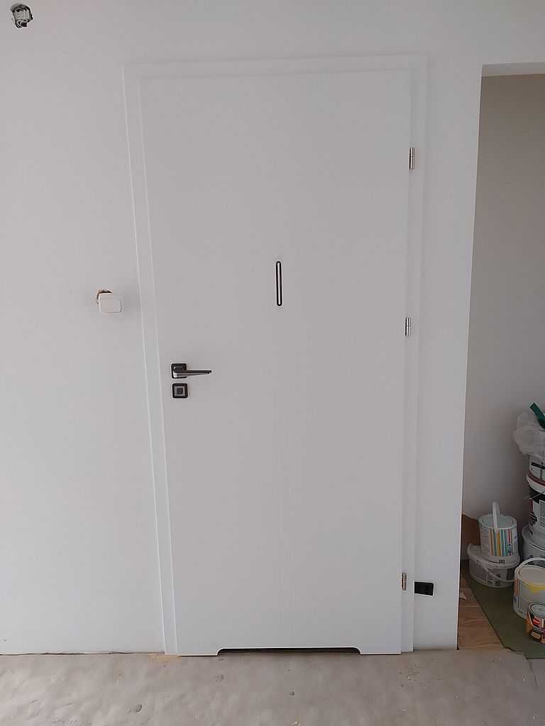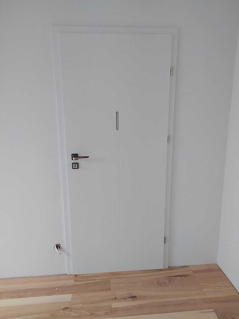 Na załączonej dokumentacji zdjęciowej możemy zauważyć zamontowane drzwi producenta Porta. Klient zdecydował się na model Porta Form, wzór 2, pełne, płaskie. Na szczególną uwagę zasługuje delikatna intarsja, wstawka w górnej części skrzydła, która nadaje całej aranżacji stylu i charakteru. Zamontowaliśmy drzwi Porta w systemie przylgowym o szerokości „80”. W skrzydle łazienkowym wykonaliśmy podcięcie u dołu, celem zapewnienia odpowiedniej wentylacji pomieszczenia, w którym znajduje się dużo wilgoci. Całość powieszona na ościeżnicach regulowanych Porta System o różnych zakresach regulacji z uwagi na grubości muru, z opaskami o szerokości 60 mm. Wszystko malowane na biało. Lakier Premium, który idealnie łączy estetykę wykonania z gwarancją wysokiej jakości użytkowej.