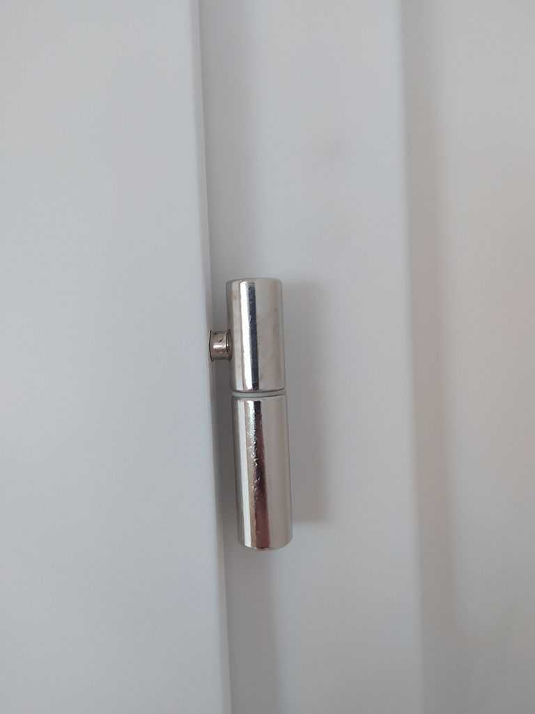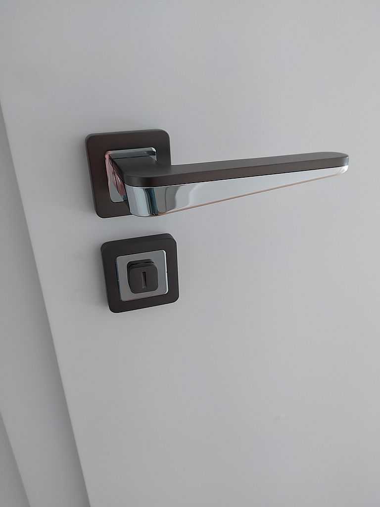 Dopełnieniem są okucia. Klient zdecydował się na klamki DUO marki Metal-Bud na rozecie dzielonej, kwadratowej. Ciekawostką jest to, że są dwukolorowe. Chrom w połączeniu z pięknym grafitem świetnie kontrastuje z białą powierzchnią skrzydła. W pewnym sensie stają się one biżuterią dla drzwi.