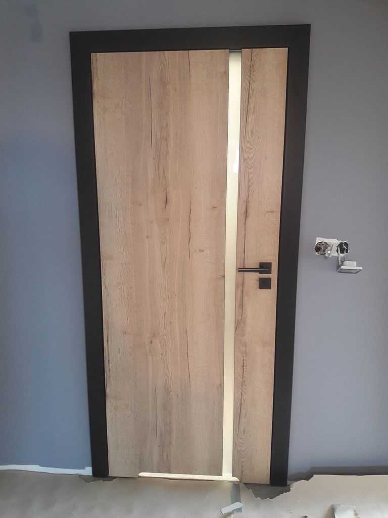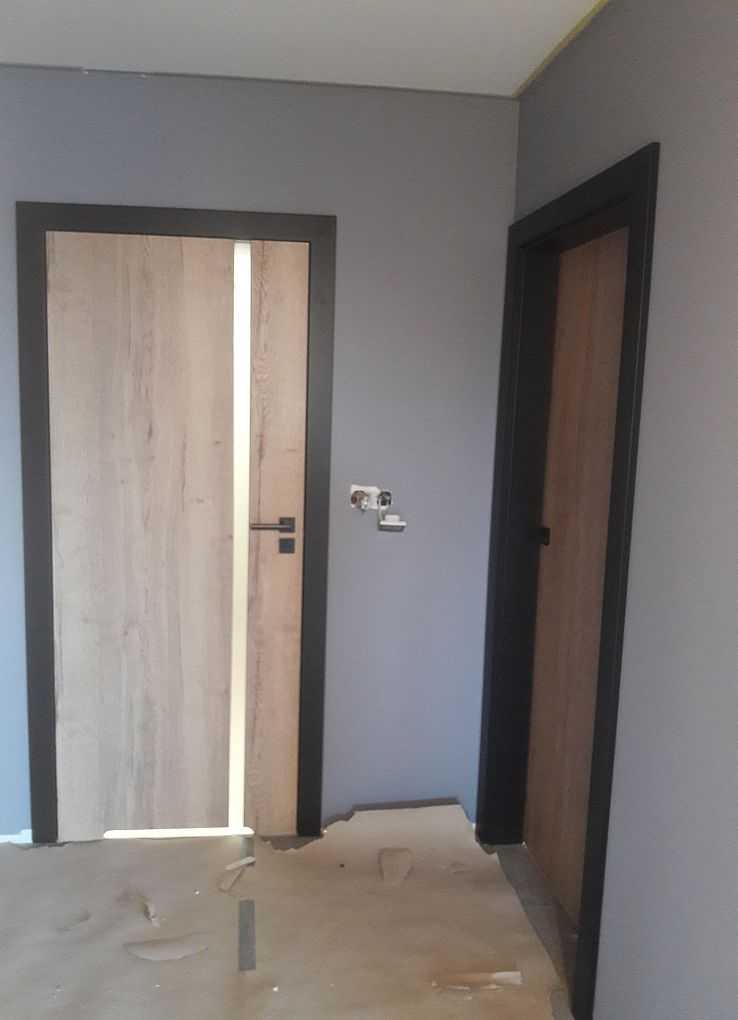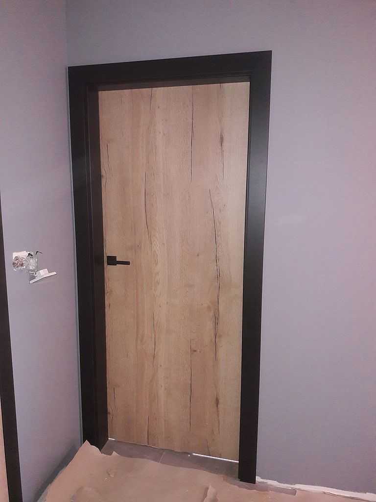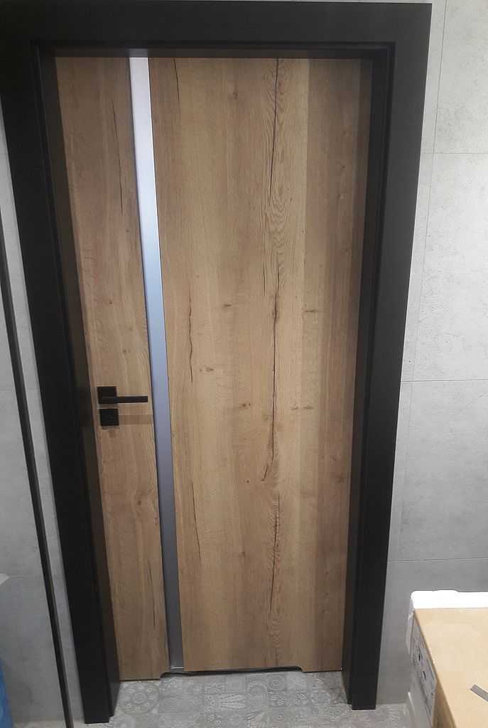 Do łazienki zamontowaliśmy model 4.A. przeszklone pionową szybą matową od strony klamki na całej długości skrzydła. Do pokoi zaś skrzydła pełne. Powierzchnia skrzydeł w kolorze Halifax Naturalny, który wybitnie imituje stare drewno. Obrzeże w kolorze czarnym. Nietypowo dedykowane ościeżnice są również w kolorze czarnym – okleina supermatt. Podobnie okucia, tj. zawiasy, zamek i zaczep zamka. Całość dopełniły także czarne klamki na rozecie dzielonej, kwadratowej. Efekt kapitalny – zdjęcia w załączeniu.