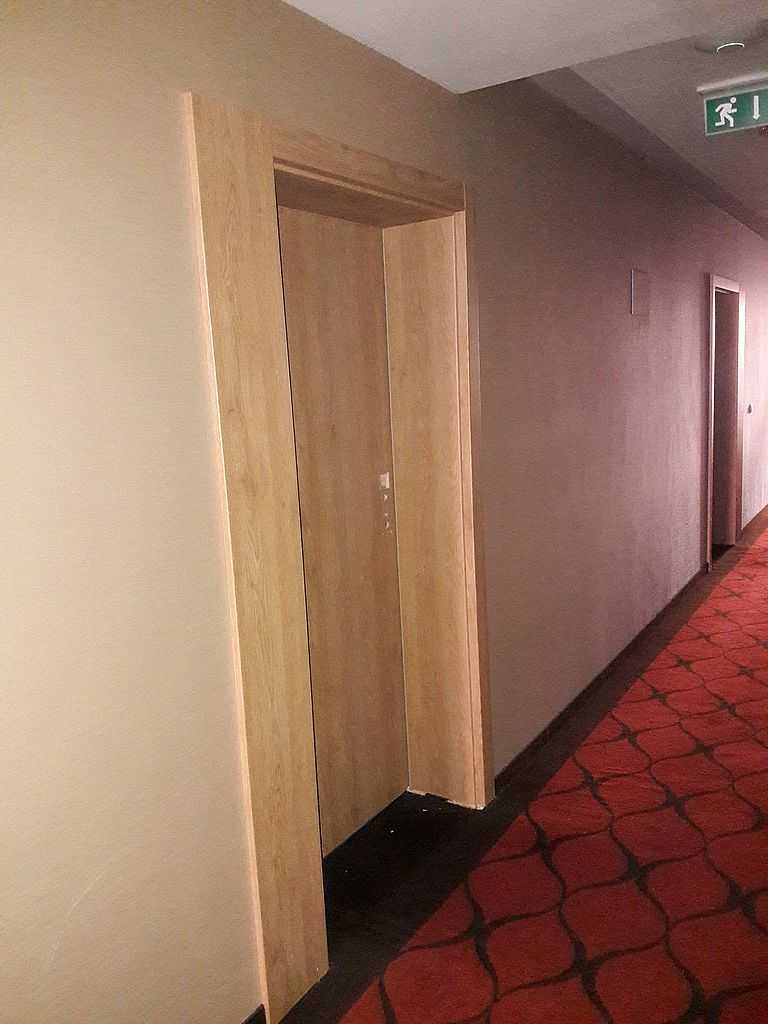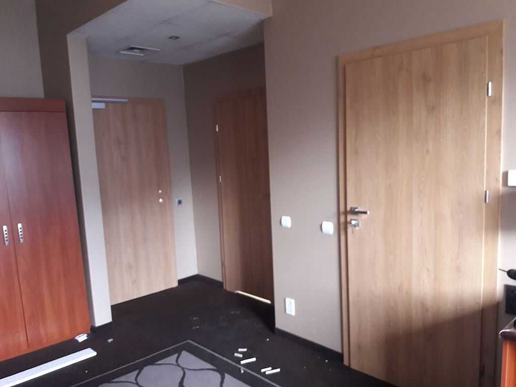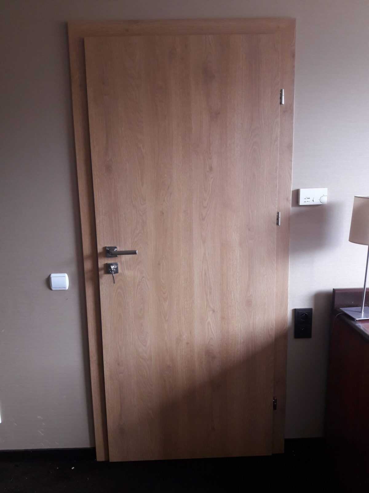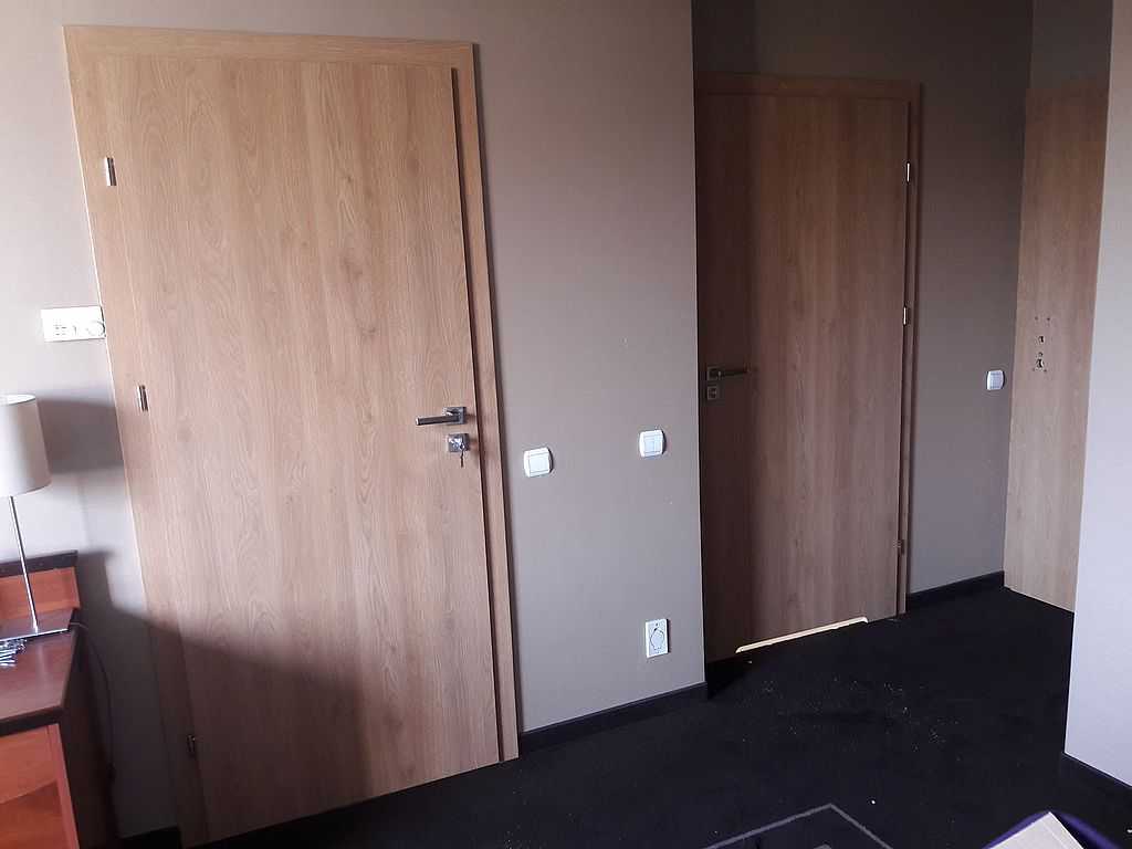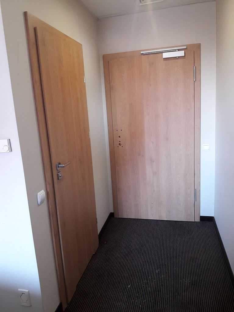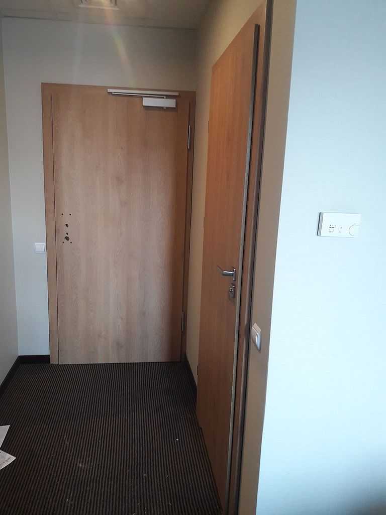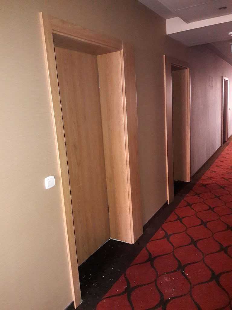 Jako wejście do pokoi zamontowaliśmy drzwi techniczne PORTA Silence z ognioodpornością 30 minut, dymoszczelnością oraz izolacyjnością akustyczną Rw – 40 dB. Porta Silence to model drzwi, który jest wyposażony w zawiasy obiektowe, uszczelkę opadającą, a samo skrzydło wypełnione pięciowarstwową konstrukcją akustyczną z ramiakiem z klejonki drewnianej. W porozumieniu z producentem na tzw. „zamówienie kontraktowe” zamontowaliśmy ościeżnice regulowane (o zakresie 16-18, 28-30) z nietypowym portalem widocznym od strony korytarza. Okucia to zamki hotelowe BE-Tech Oslo i samozamykacze producenta Assa Abloy. Aby całość była spójna drzwi w pokojach wykonano w tym samym pokryciu i kolorze tego samego producenta. To model „okleinowane CPL 1.1.”