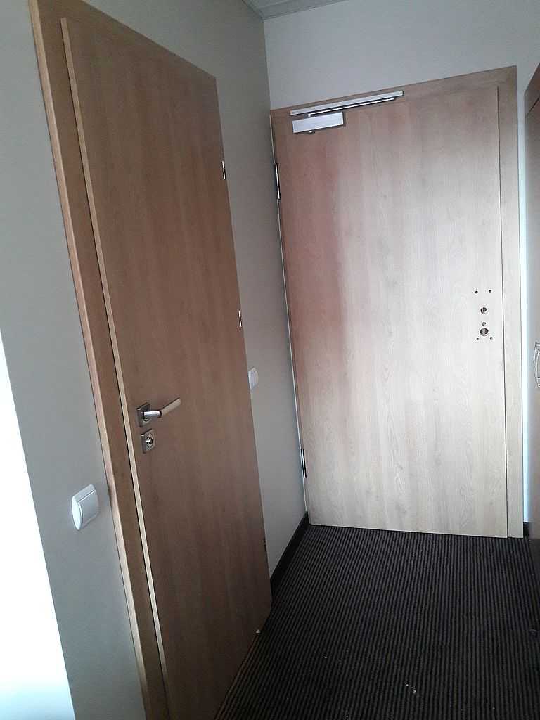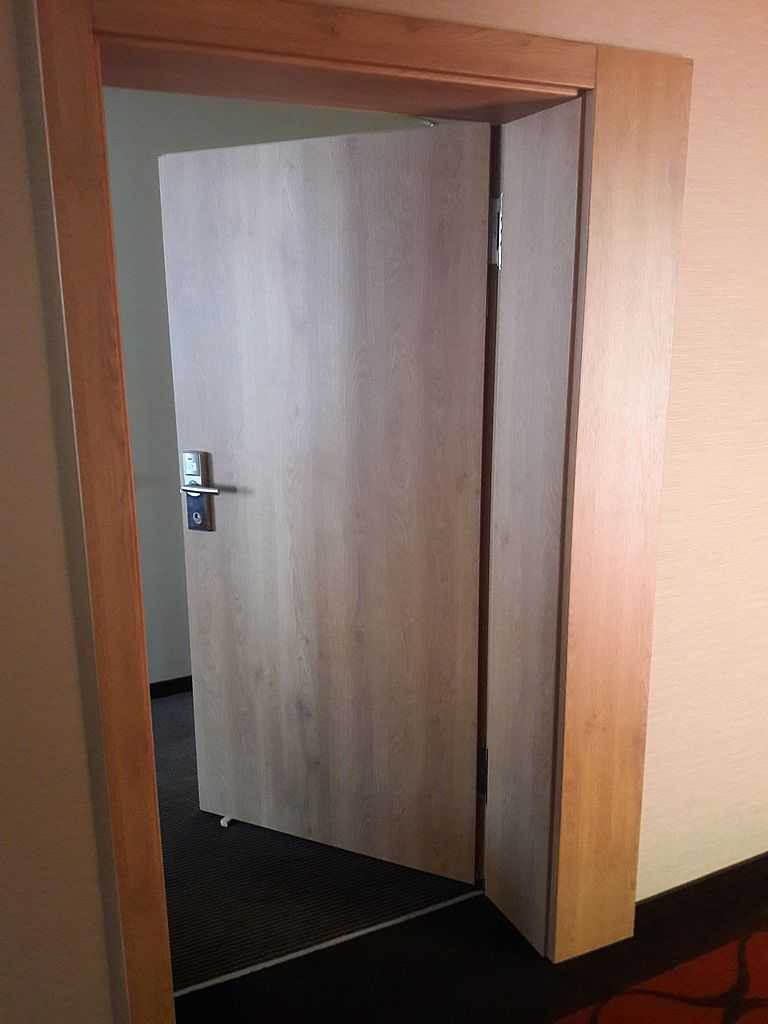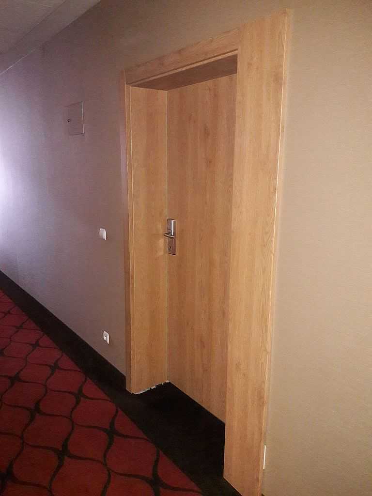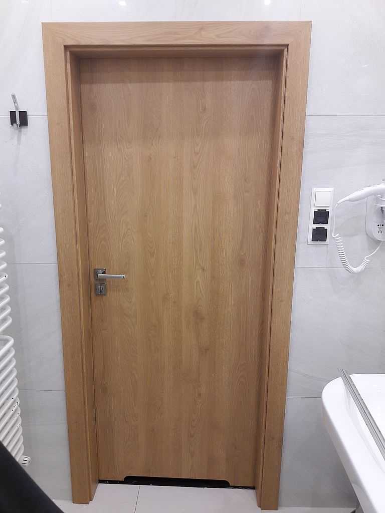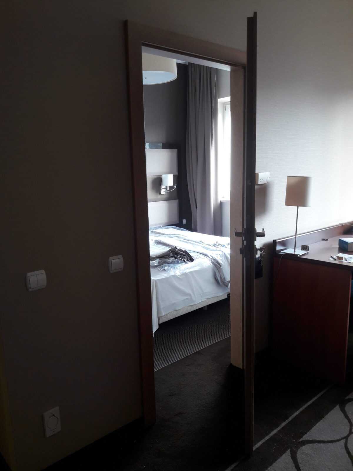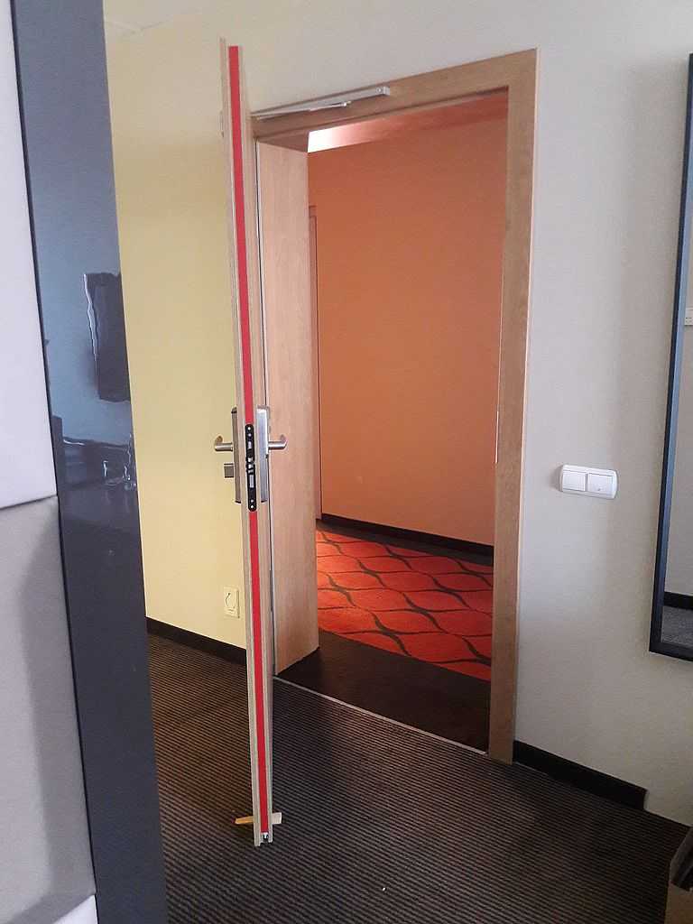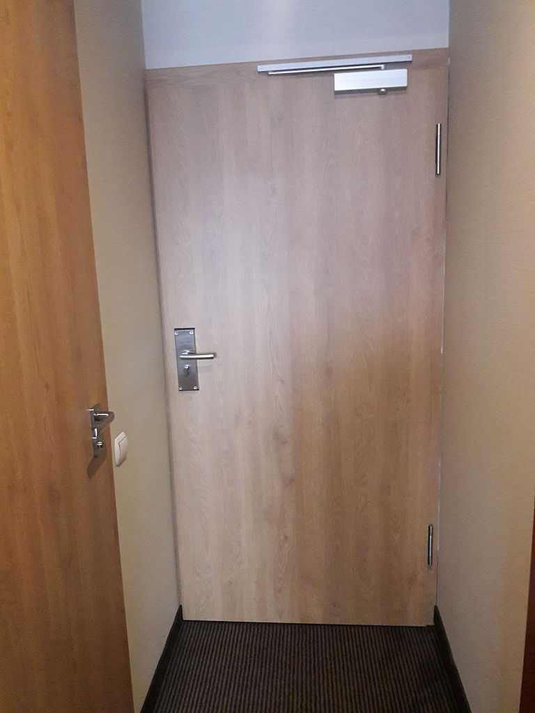 Jako wejście do pokoi zamontowaliśmy drzwi techniczne PORTA Silence z ognioodpornością 30 minut, dymoszczelnością oraz izolacyjnością akustyczną Rw – 40 dB. Porta Silence to model drzwi, który jest wyposażony w zawiasy obiektowe, uszczelkę opadającą, a samo skrzydło wypełnione pięciowarstwową konstrukcją akustyczną z ramiakiem z klejonki drewnianej. W porozumieniu z producentem na tzw. „zamówienie kontraktowe” zamontowaliśmy ościeżnice regulowane (o zakresie 16-18, 28-30) z nietypowym portalem widocznym od strony korytarza. Okucia to zamki hotelowe BE-Tech Oslo i samozamykacze producenta Assa Abloy. Aby całość była spójna drzwi w pokojach wykonano w tym samym pokryciu i kolorze tego samego producenta. To model „okleinowane CPL 1.1.”