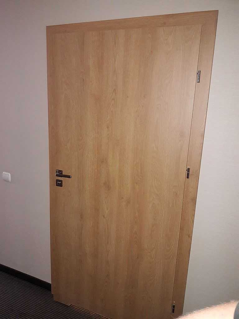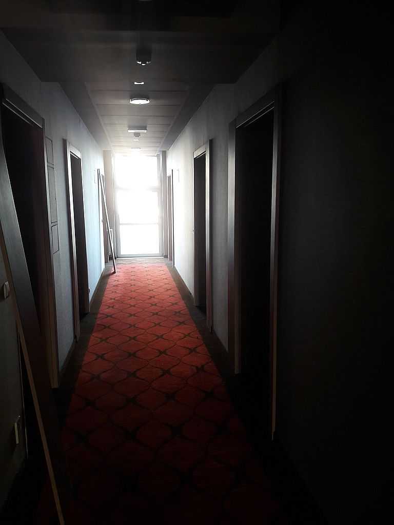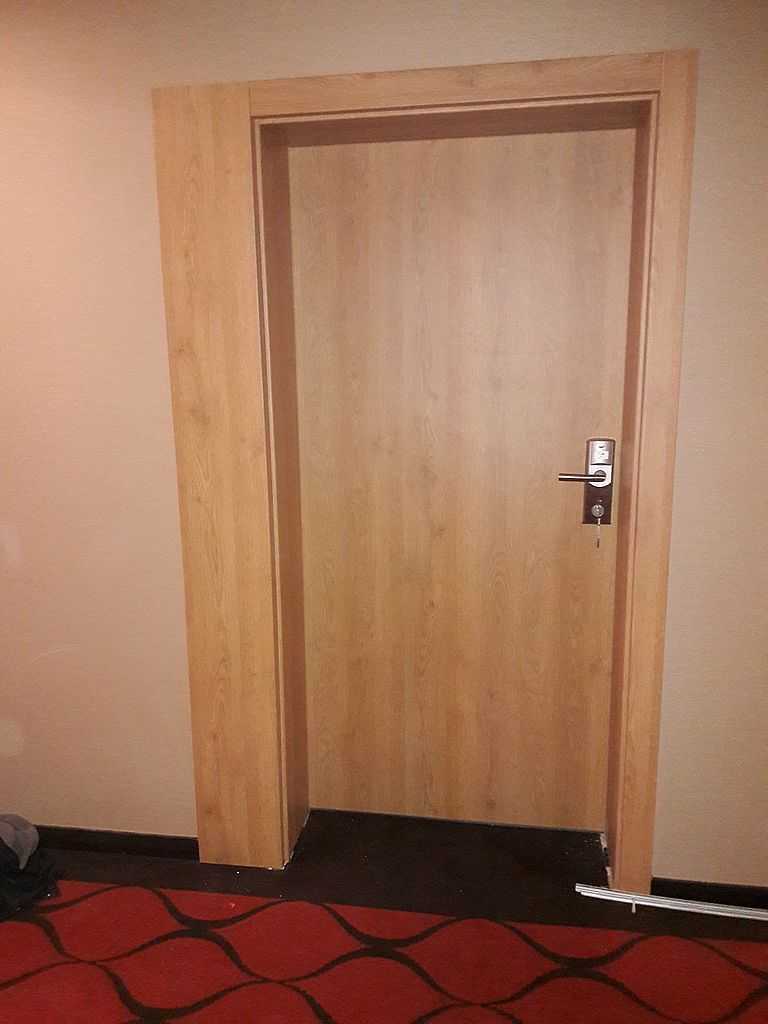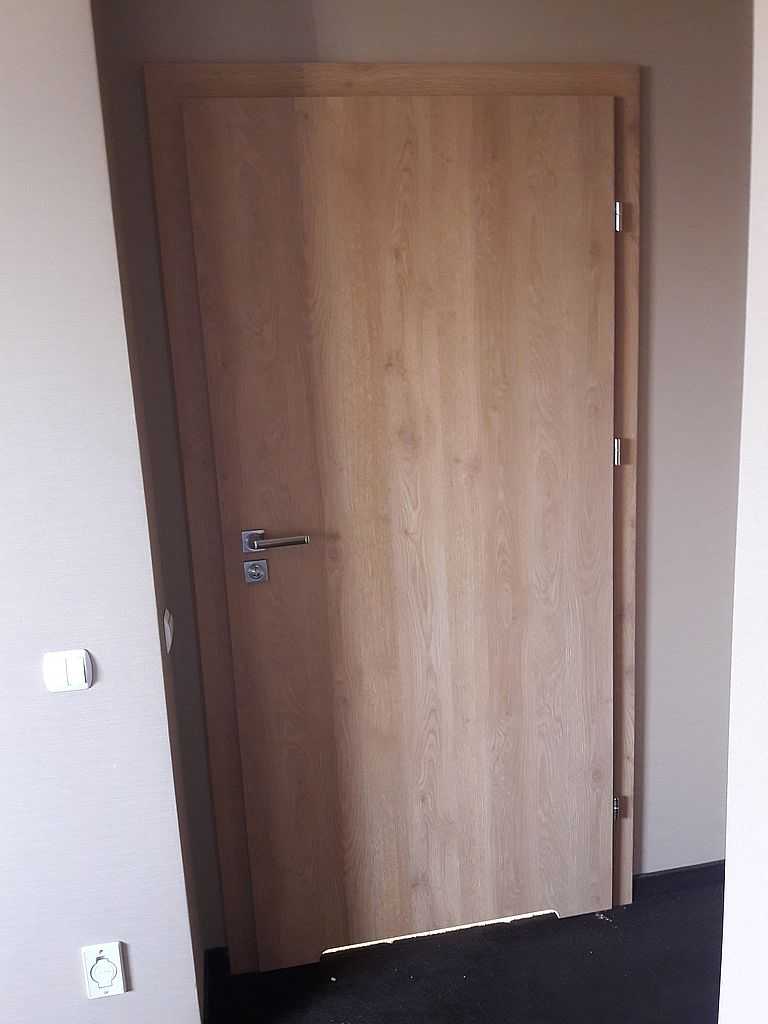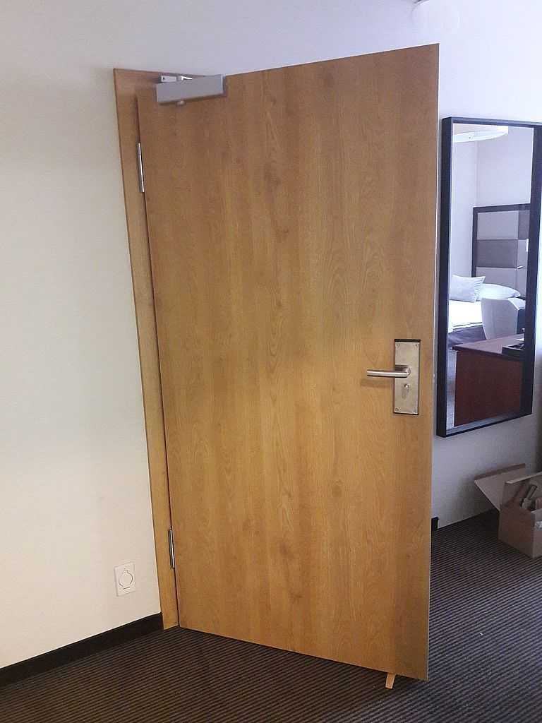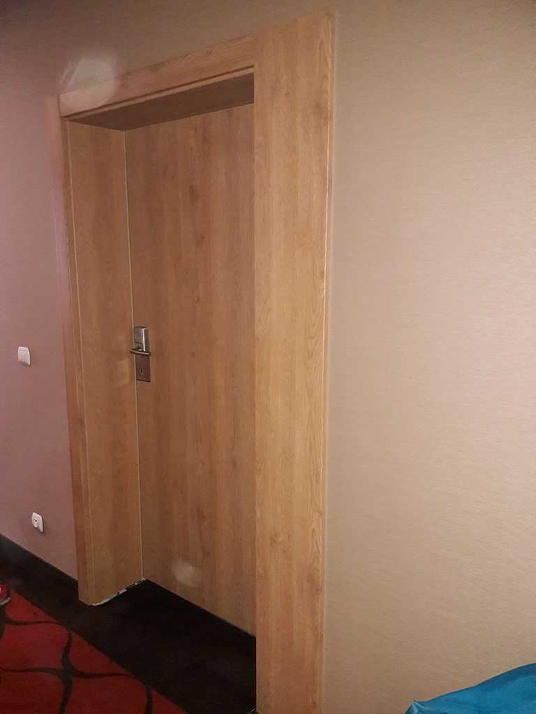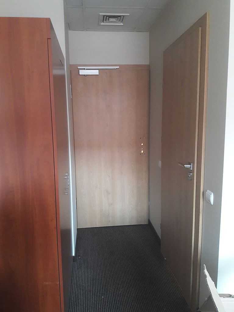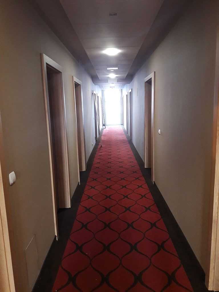 Jako wejście do pokoi zamontowaliśmy drzwi techniczne PORTA Silence z ognioodpornością 30 minut, dymoszczelnością oraz izolacyjnością akustyczną Rw – 40 dB. Porta Silence to model drzwi, który jest wyposażony w zawiasy obiektowe, uszczelkę opadającą, a samo skrzydło wypełnione pięciowarstwową konstrukcją akustyczną z ramiakiem z klejonki drewnianej. W porozumieniu z producentem na tzw. „zamówienie kontraktowe” zamontowaliśmy ościeżnice regulowane (o zakresie 16-18, 28-30) z nietypowym portalem widocznym od strony korytarza. Okucia to zamki hotelowe BE-Tech Oslo i samozamykacze producenta Assa Abloy. Aby całość była spójna drzwi w pokojach wykonano w tym samym pokryciu i kolorze tego samego producenta. To model „okleinowane CPL 1.1.”