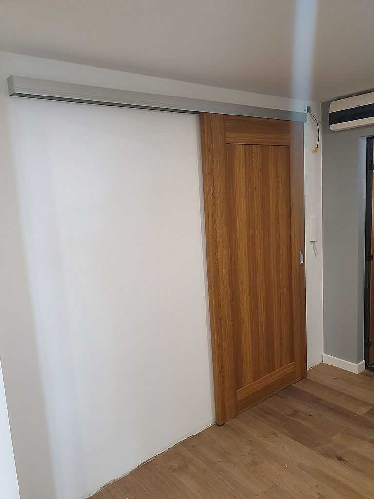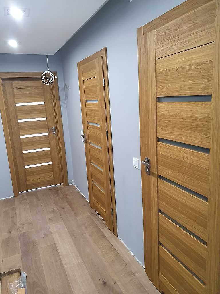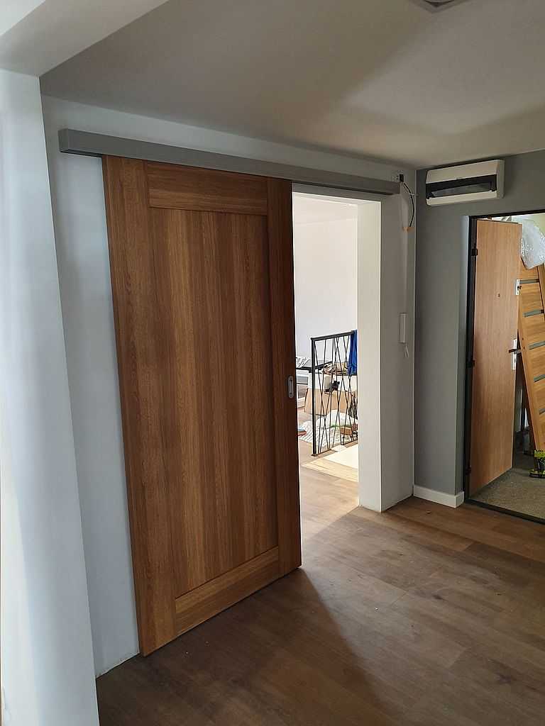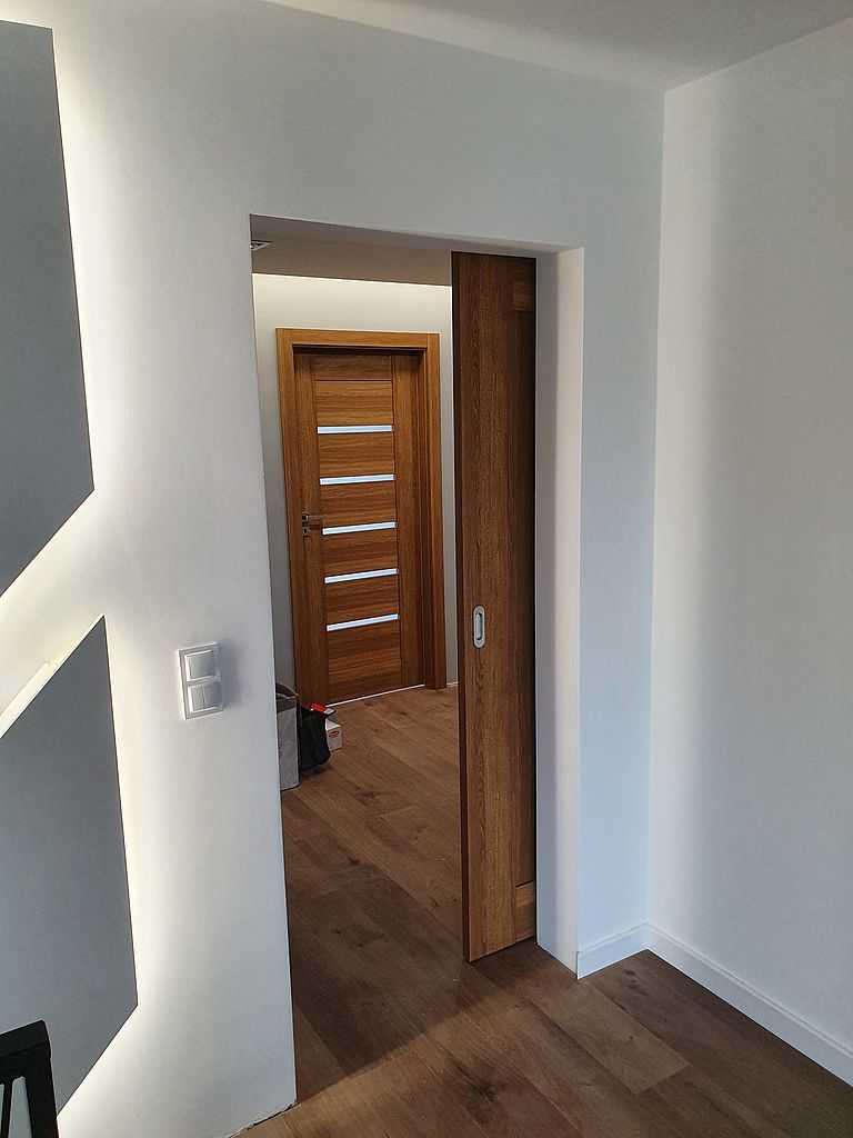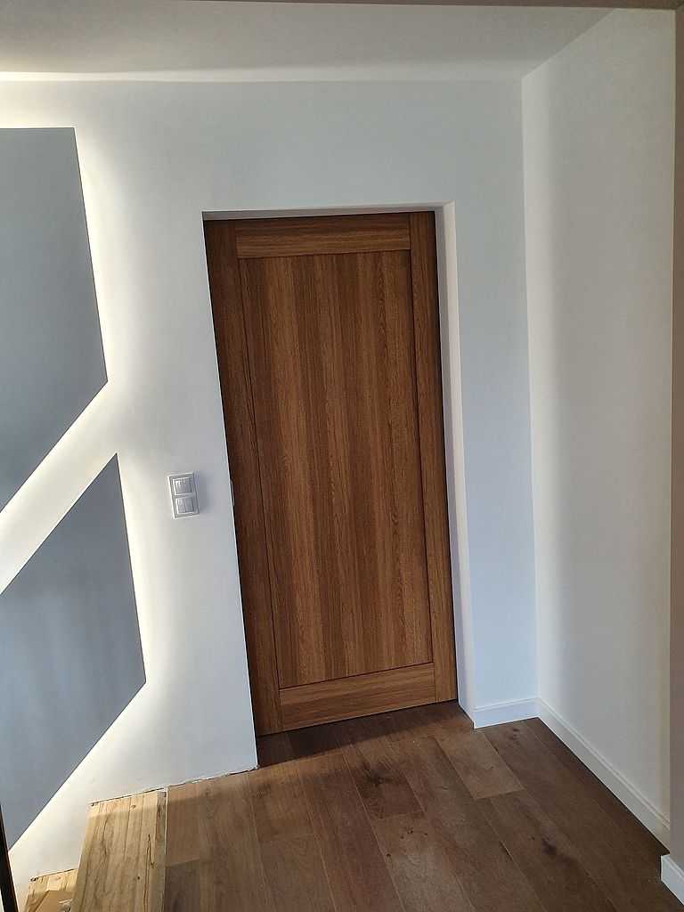 Drzwi Pol-Skone Łódź-Widzew. Dostarczyliśmy i zamontowaliśmy 4 komplety drzwi przylgowych tego producenta wraz z ościeżnicami regulowanymi DIN. Do tego 1 szt drzwi ukrytych Harmony, oraz 2 szt suwanych. Drzwi przylgowe oraz suwane posiadają konstrukcję ramową. Modele Pol-Skone Sempre W03 z szybą matową oraz W00 bez przeszklenia. Skrzydła są pokryte laminatem Lamistone Cpl 276 – dąb polski. Drzwi rozwierne w rozmiarze „80” z ościeżnicami regulowanymi o zakresach 095-120, 120-140 i 140-160, w których opaski łączyliśmy pod kątem 90 stopni. Natomiast drzwi suwane są w rozmiarze „90” przewyższone o 10 cm od standardu. Drzwi ukryte w rozmiarze „70” z wypełnieniem plaster miodu przygotowane do samodzielnego pomalowania. Zamontowaliśmy klamki Infinity Maxim w kolorze satynowym.