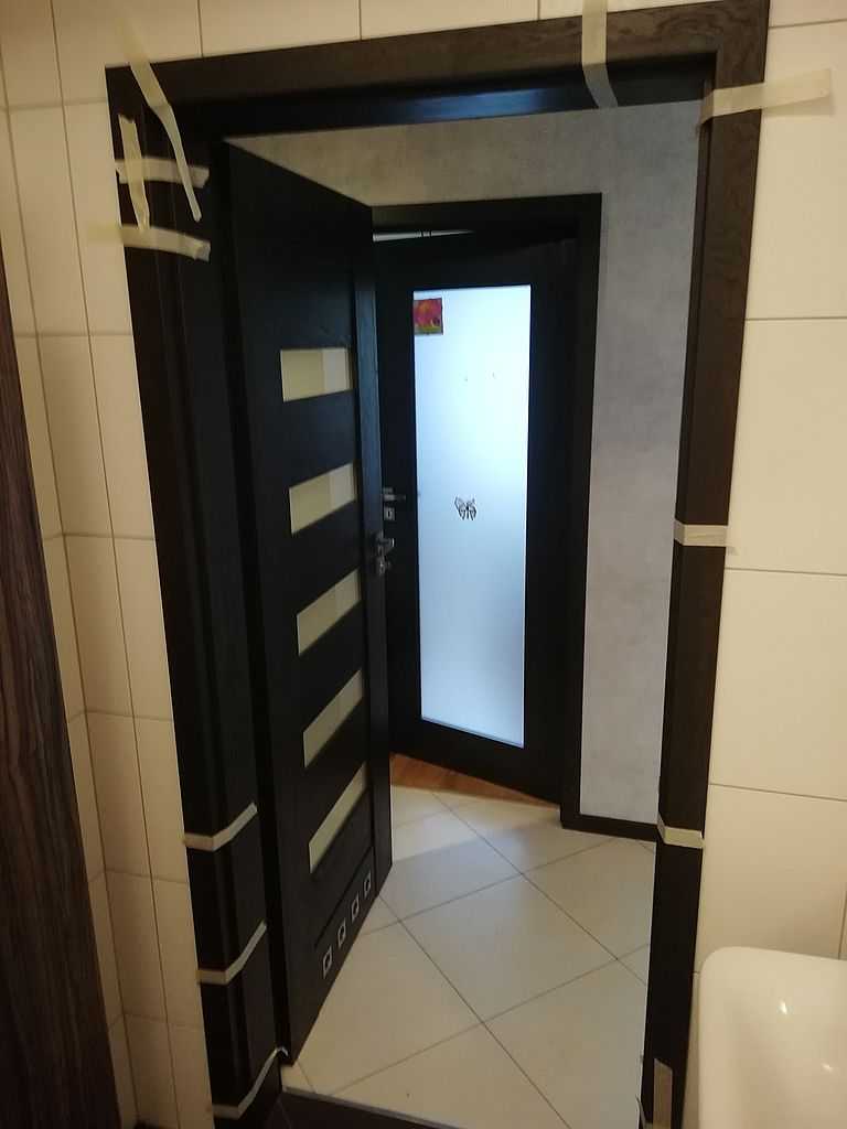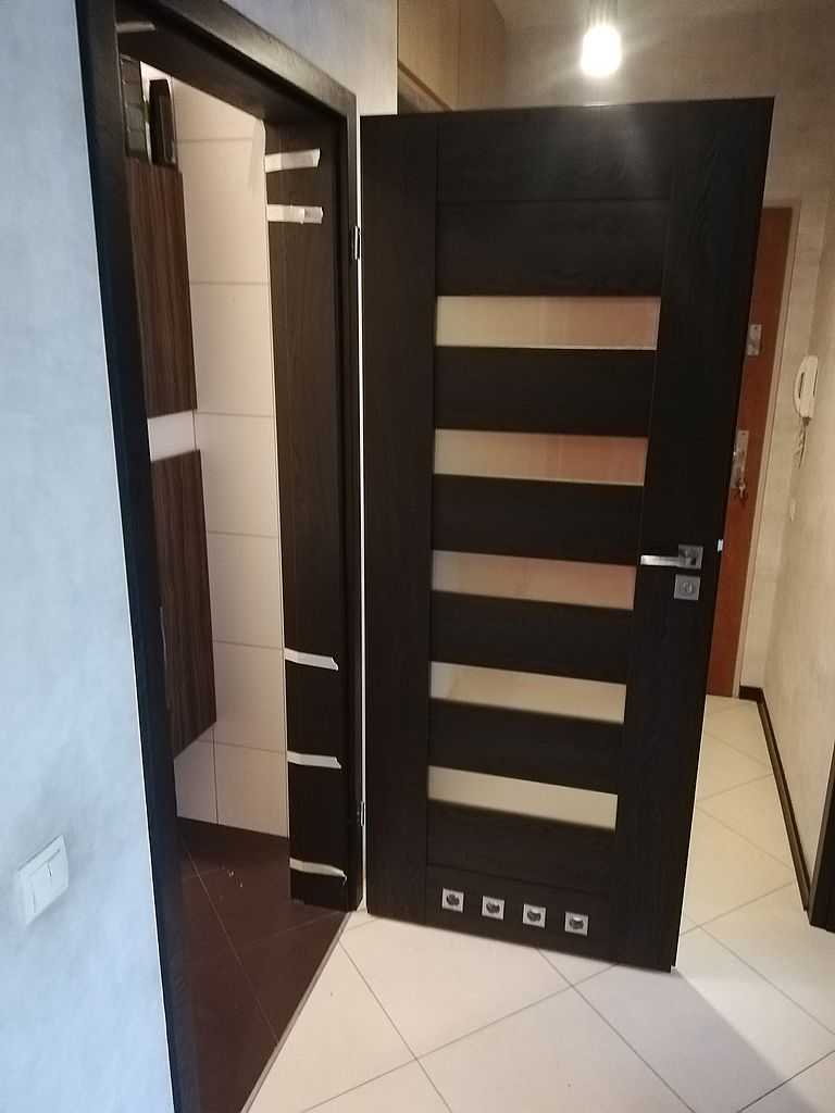 Pol-Skone Sempre Zgierz. Dostarczyliśmy i zamontowaliśmy drzwi przylgowe z ościeżnicą regulowaną. Skrzydła i ościeżnica w polskiej normie. Producent drzwi Pol-skone, model Sempre, wzór W02. Drzwi w okleinie Silkstone Kasztan Royal 292. Skrzydło o konstrukcji ramowej z szybą matową hartowaną o grubości 4 mm. Rozmiar drzwi: „80” z ościeżnicą DIN z opaskami 6 cm łączone pod katem 45 stopni o zakresie 140-160. W skrzydle łazienkowym tuleje łazienkowe stalowe.
