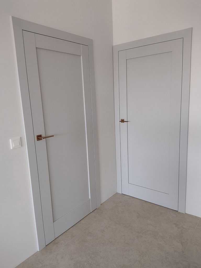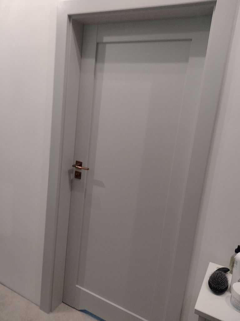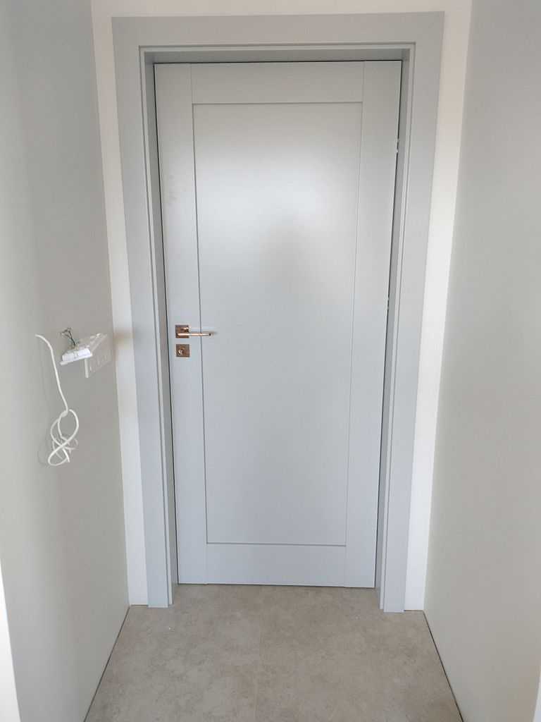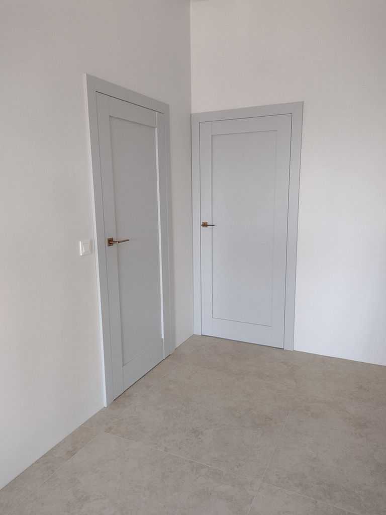 Nasza klientka wybrała model drzwi Porta Grande A.0 w satynowo gładkiej powierzchni. Pokrycie drzwi dzięki trwałej technologii lakierowania UV charakteryzuje się wysoką odpornością na zabrudzenia, ścieranie oraz zarysowania. Producent gwarantuje stałość koloru na długie lata. Zamówione skrzydła wraz z ościeżnicami w kolorze jasnoszarym- porównywalnym do koloru 7035 dostępnym z palety RAL.
