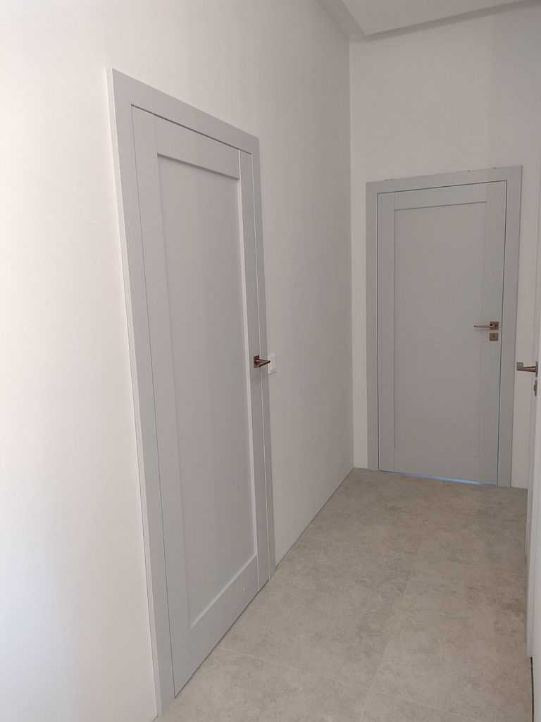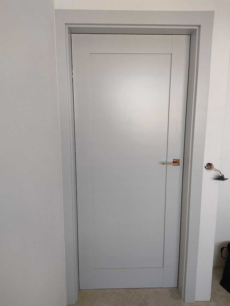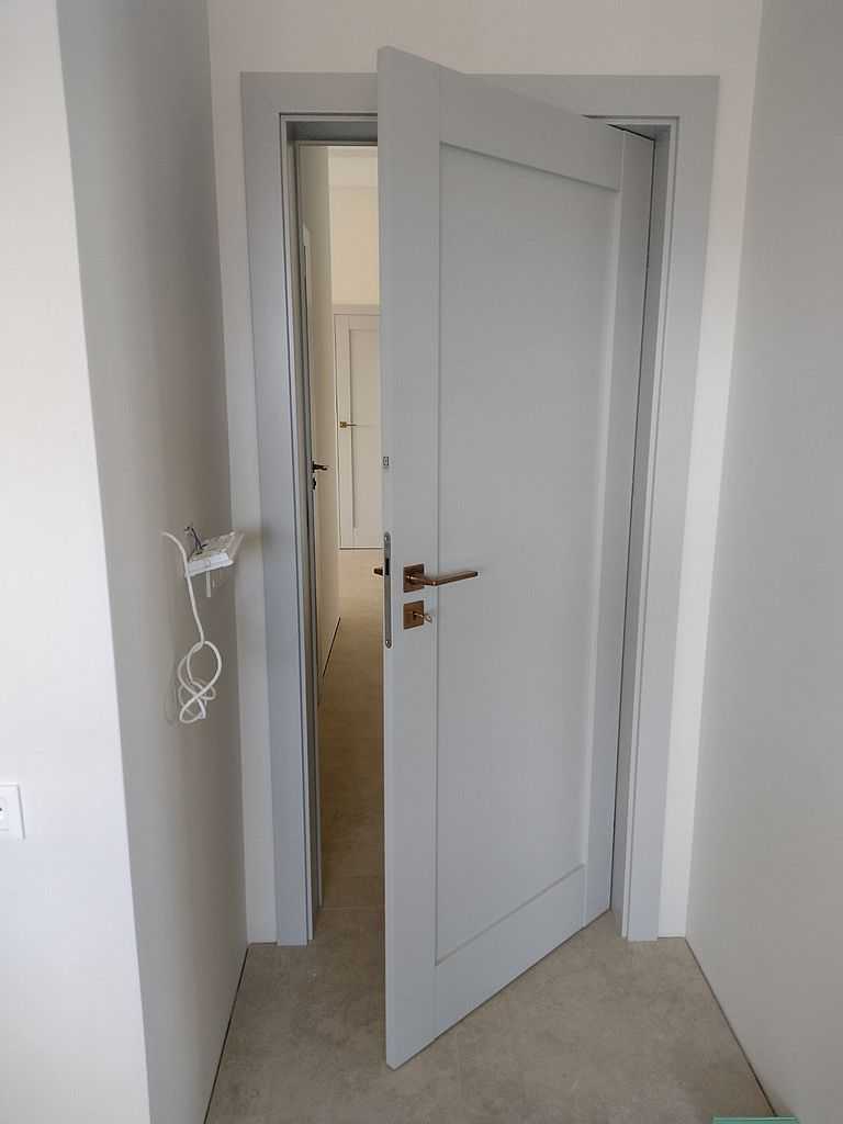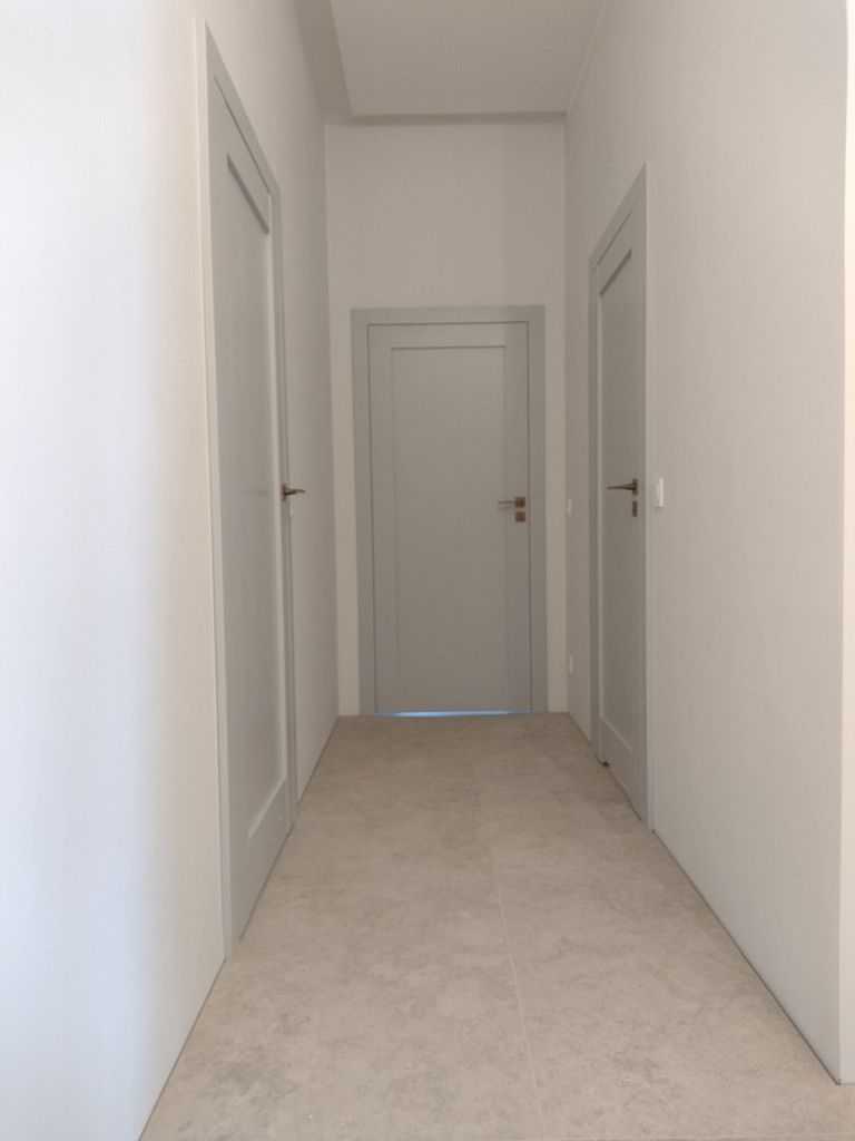 Nasza klientka wybrała model drzwi Porta Grande A.0 w satynowo gładkiej powierzchni. Pokrycie drzwi dzięki trwałej technologii lakierowania UV charakteryzuje się wysoką odpornością na zabrudzenia, ścieranie oraz zarysowania. Producent gwarantuje stałość koloru na długie lata. Zamówione skrzydła wraz z ościeżnicami w kolorze jasnoszarym- porównywalnym do koloru 7035 dostępnym z palety RAL.