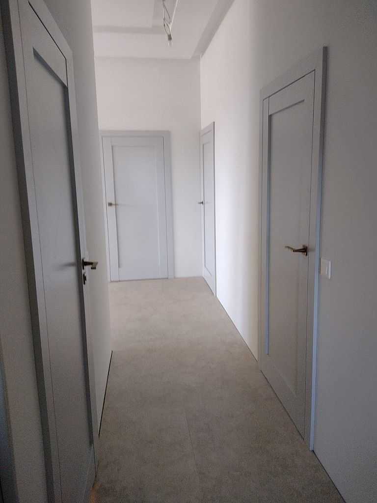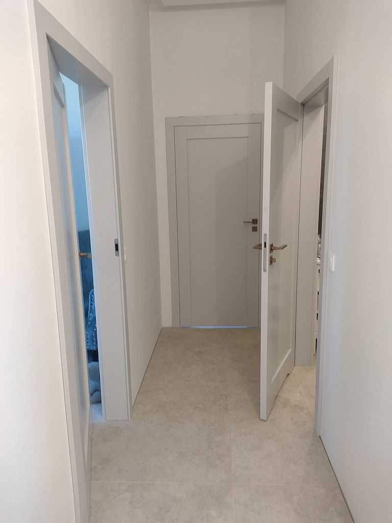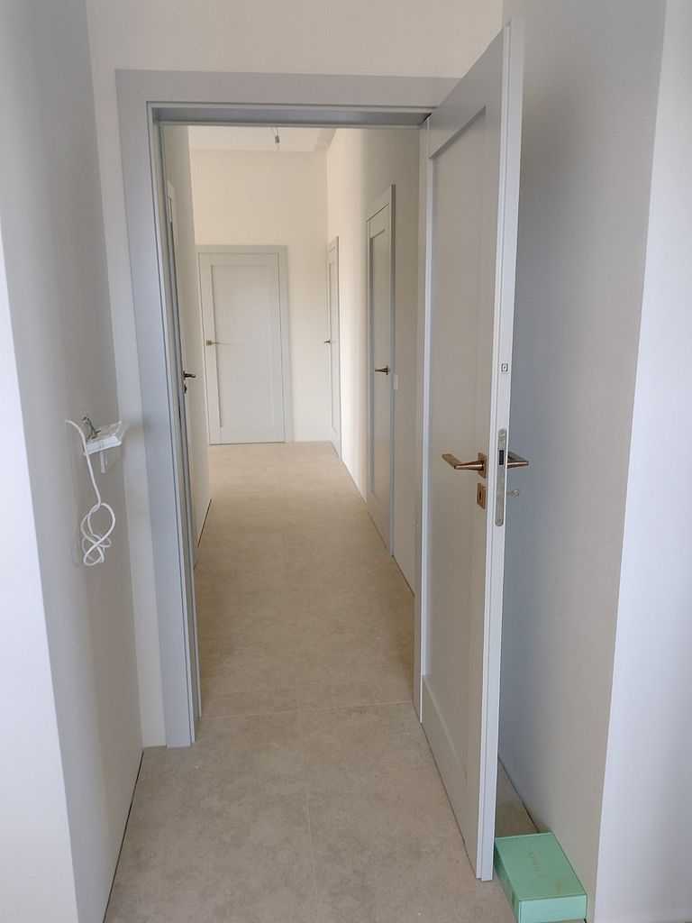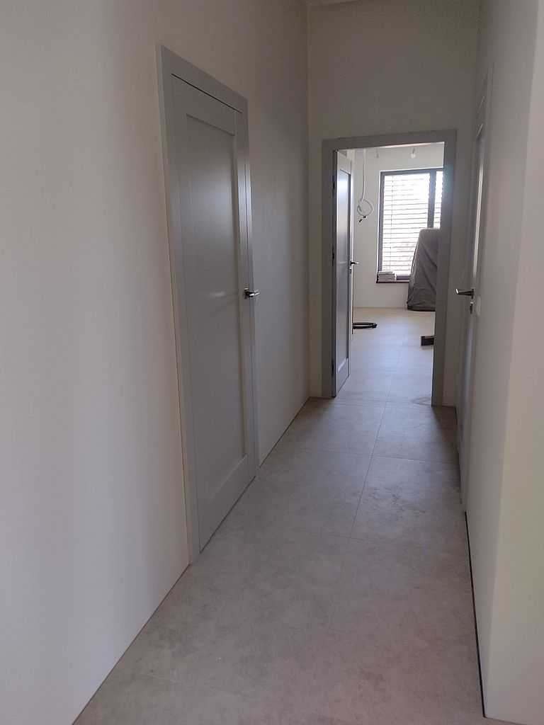 Dla pomieszczeń łazienkowych, otwieranych na zewnątrz zamontowaliśmy drzwi bezprzylgowe z ościeżnicami regulowanymi Porta System Elegance. Z kolei dla pomieszczeń pokojowych, otwieranych do wewnątrz zamontowane zostały drzwi rewersyjne z ościeżnicami regulowanymi Porta System z odwrotną przylgą. Zastosowanie drzwi rewersyjnych pozwala zlicować skrzydło drzwiowe od strony zewnętrznej (np. korytarza) pomimo tego, że drzwi otwierają się do wewnątrz. Drzwi bezprzylgowe oraz z odwrotną przylgą z perspektywy korytarza wyglądają identycznie, tworząc równą płaszczyznę.