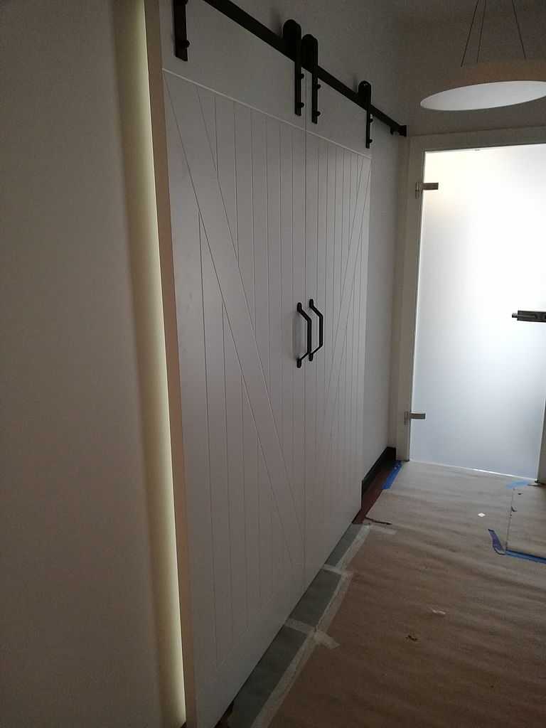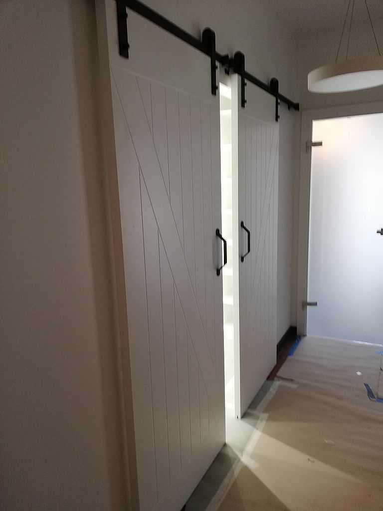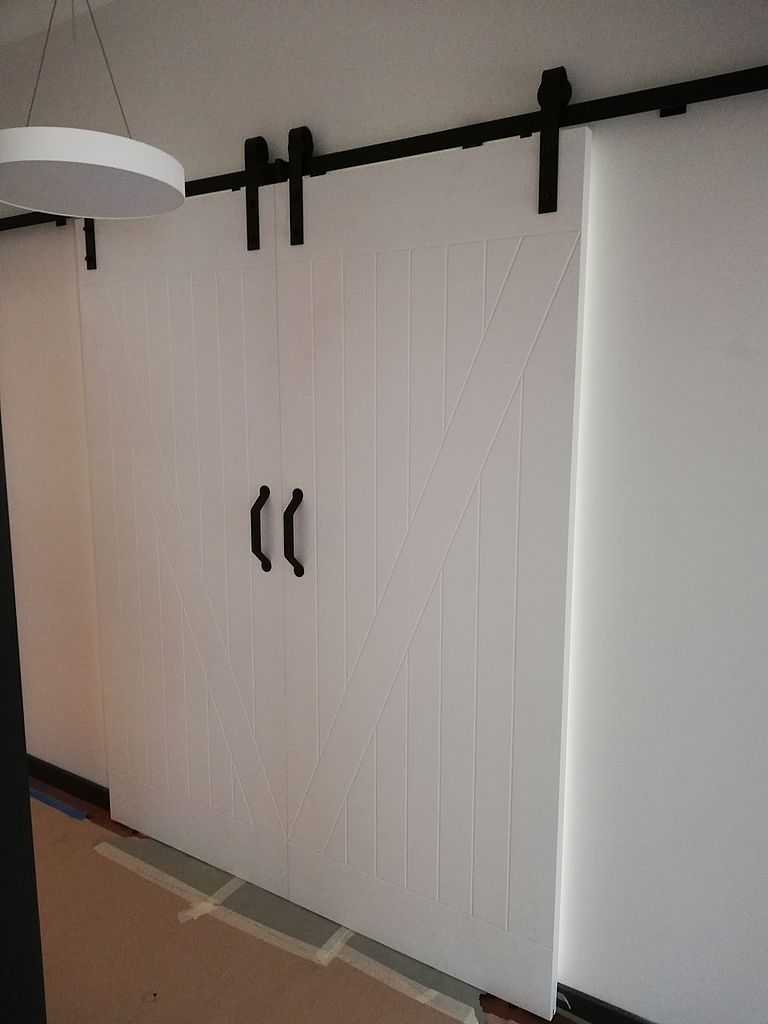 Na szczególną uwagę zasługują zamontowane w trakcie tej realizacji podwójne drzwi suwane system Black model 1 z mocowaniami do skrzydeł- TYP REA. Aby uniknąć widocznego połączenia dwóch prowadnic dodatkowo zastosowaliśmy klamrę łączącą do systemów podwójnych. Skrzydło wykończone Lakierem Premium w kolorze białym o gwarancji wysokiej jakości użytkowania. Charakterystycznym elementem jest stalowy system przesuwania, zbudowany z masywnej czarnej prowadnicy i wyposażonej w odpowiednie rolki z łożyskami pozwalającymi na ich płynną pracę.