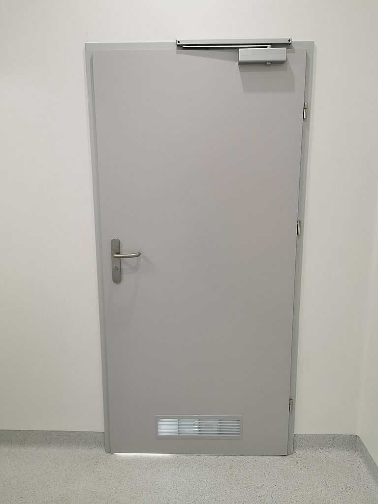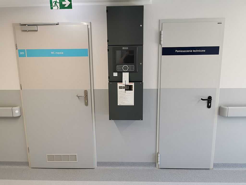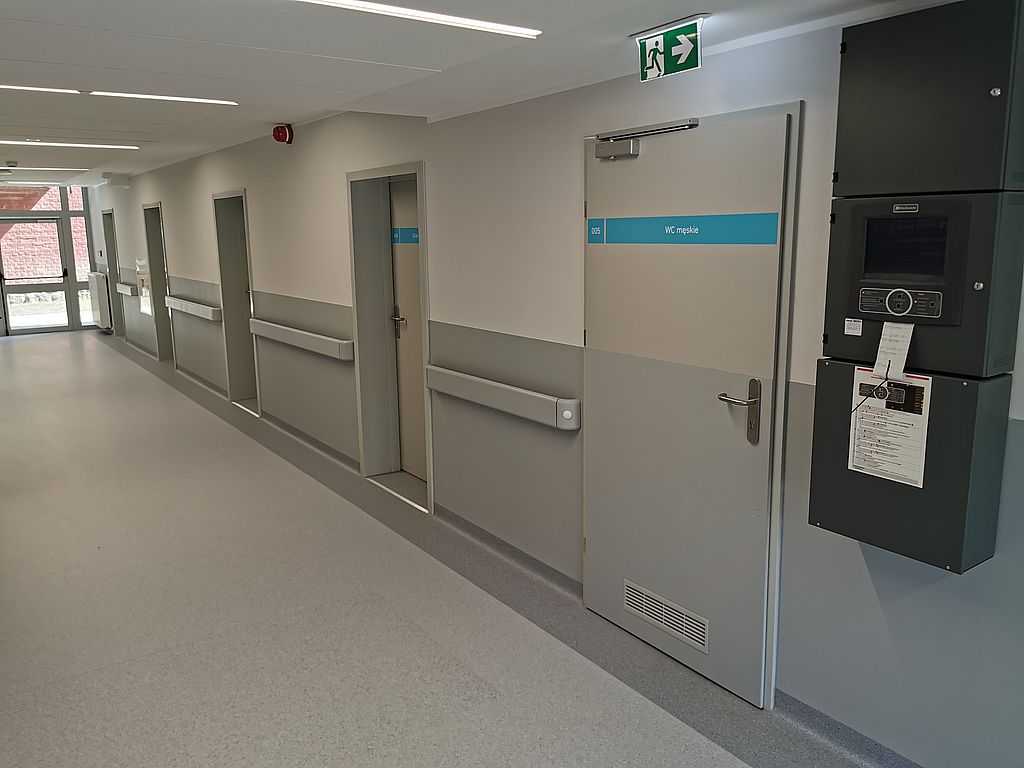 Drzwi zostały wykonane w normie inwestycyjnej dzięki czemu nie zawężają światła przejścia wynoszącego 90cm. Zamontowaliśmy dodatkowo klamki ze stali nierdzewnej o rozstawie 72mm w konstrukcji bezpiecznej. To oznacza, że klamki nie mają ostrych krawędzi. Poza drzwiami okleinowanymi, zamontowaliśmy też drzwi techniczne Porta model EI30. Są to drzwi przeciwpożarowe oraz dymoszczelne. Zamontowaliśmy dodatkowo samozamykacze szynowe DC135 firmy ASSA ABLOY.