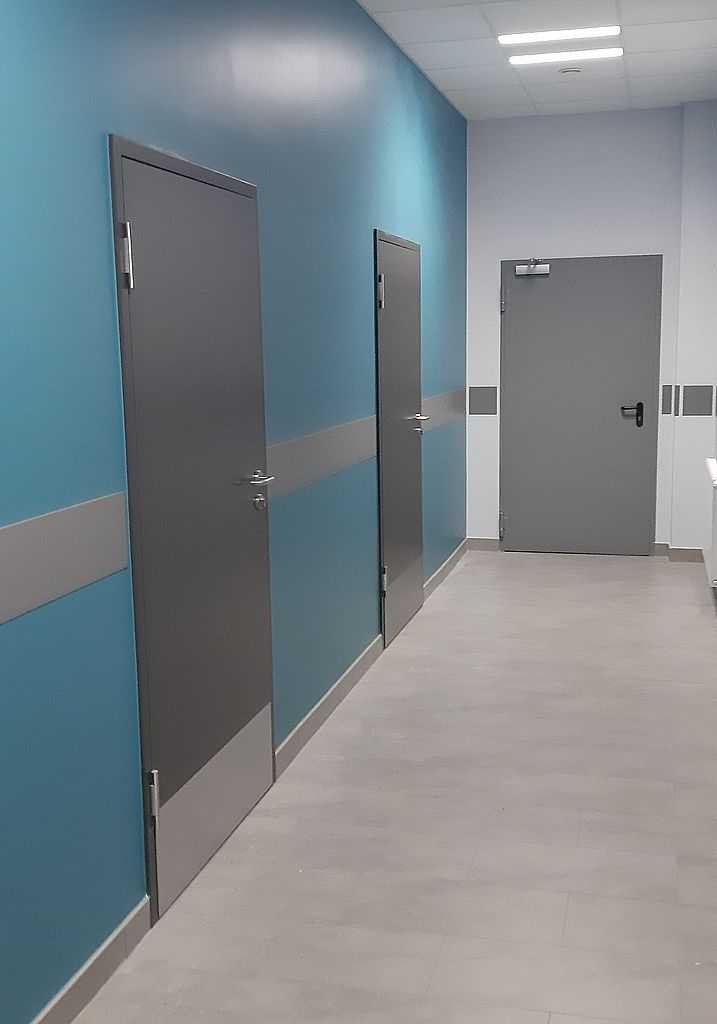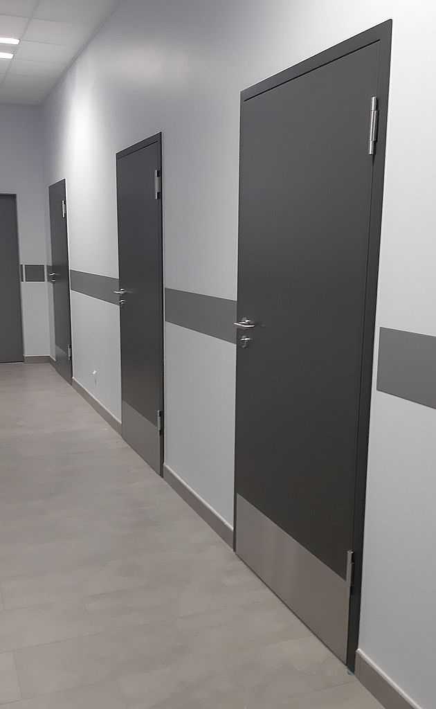 Dostarczyliśmy i zamontowaliśmy drzwi Porta CPL w budynku biurowo-magazynowym firmy Netto w miejscowości Motaniec, nieopodal Kobylanki. Do biur zamontowaliśmy drzwi akustyczne – model Silence o wygłuszeniu równym 37 dB. Są to drzwi bezprzylgowe na ościeżnicy metalowej regulowanej w kolorze antracyt. Drzwi do łazienek i pozostałych pomieszczeń takich jak szatnie, siłownie czy pomieszczenia porządkowe to drzwi bezprzylgowe Porta CPL 0,7 mm, kolor antracyt na ościeżnicach metalowych regulowanych.