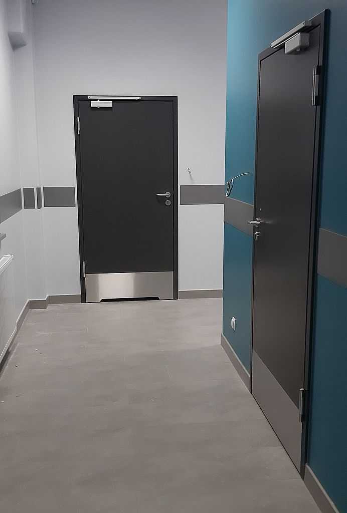 Na drzwiach w pomieszczeniach socjalnych zastosowaliśmy dolne panele ze stali nierdzewnej, natomiast w drzwiach łazienkowych i WC zastosowaliśmy dodatkowo podcięcia wentylacyjne. Zamontowane samozamykacze to model DC 135 firmy Assa Abloy. Na życzenie inwestora wszystkie drzwi zostały zaopatrzone w zawiasy obiektowe VX7729/160 ze stali nierdzewnej. Generalnym wykonawcą była firma Multi Projekt. Na inwestycji zamontowaliśmy łącznie 35 sztuk drzwi.