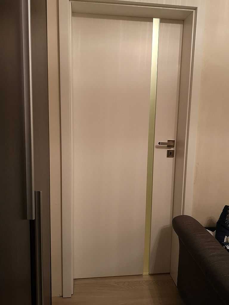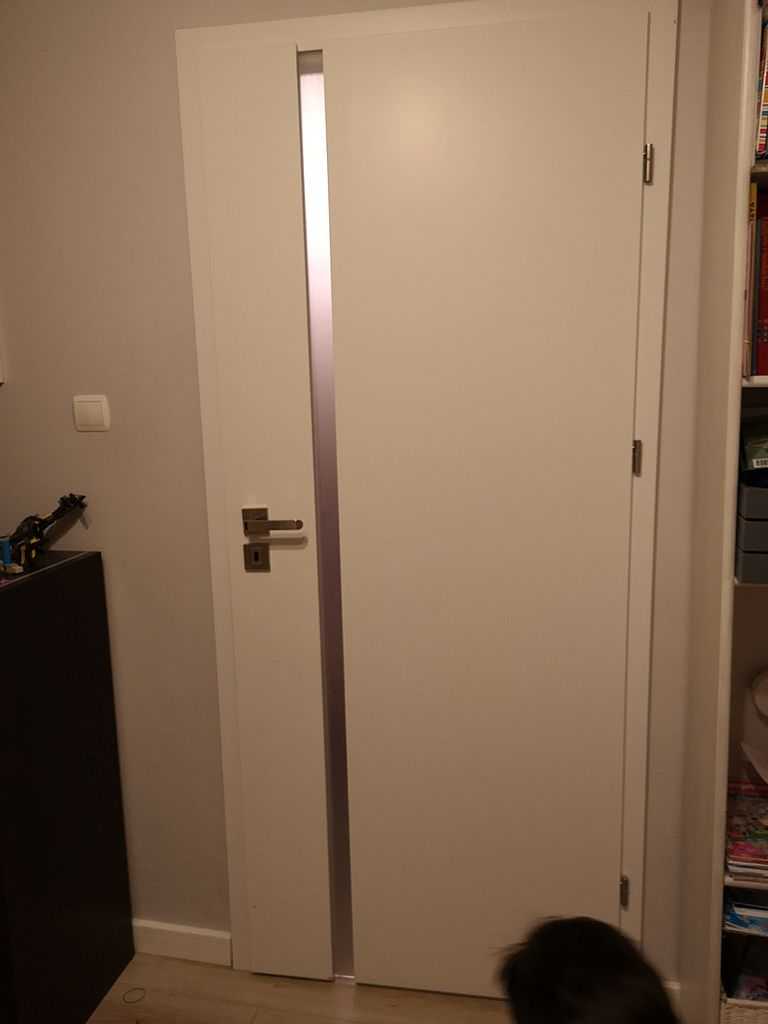 Drzwi Porta Focus Pyrzyce. Do niewielkiej miejscowości w województwie zachodniopomorskim dostarczyliśmy i zamontowaliśmy skrzydła wewnętrzne Porta Focus. Klient zdecydował się na wariant Focus Premium 4.A. Jest to model łączący minimalistyczny styl płaskiego skrzydła z nowoczesnym akcentem w postaci przeszklenia na całej jego długości. Przeszklenie w postaci szyby matowej hartowanej o grubości 8mm. Jest to również element konstrukcyjny skrzydła. W zależności od wersji skrzydło wypełnia struktura „plastra miodu” lub w wersji cięższej – płyta wiórowo otworowa. Całość obłożona płytą HDF.