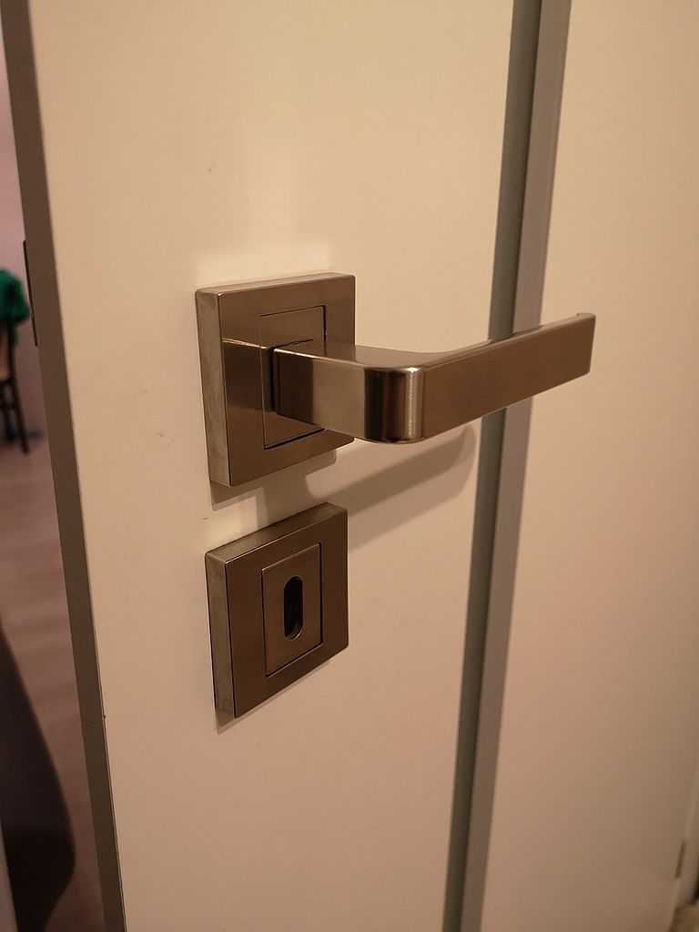 Prezentowane drzwi pokryte są farbą akrylową UV, która cechuje się wysoką odpornością na uszkodzenia oraz działanie promieni słonecznych. Do skrzydła dobraliśmy ościeżnicę regulowaną, dostosowaną do grubości ściany w tym samym kolorze i farbie co skrzydło. Okucia w kolorze srebrny mat. Zamontowaliśmy drzwi z trzema widocznymi zawiasami, tzw. drzwi przylgowe. Na życzenie klienta możliwy jest wybór skrzydeł, w których zawiasy będą niewidoczne po zamknięciu. To tak zwana wersja bezprzylgowa.W tym przypadku skrzydło po jednej stronie licuje się z ościeżnica. Do drzwi zamontowaliśmy klamki model OFFICE w kolorze srebrny mat wraz rozetą kwadratową na klucz.