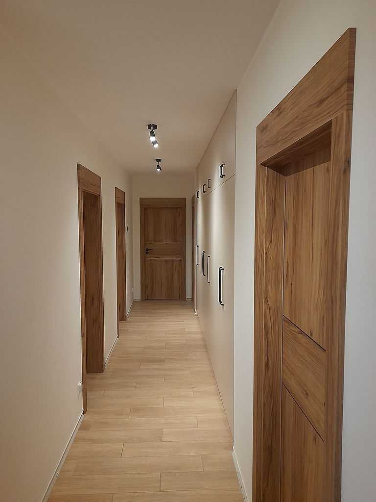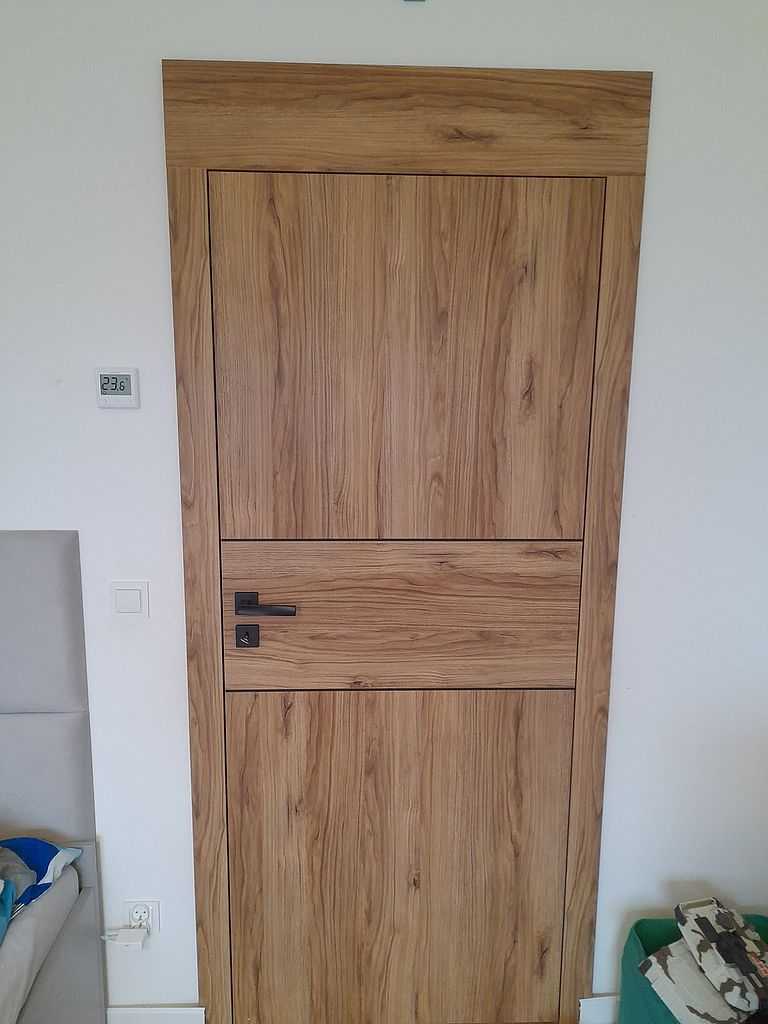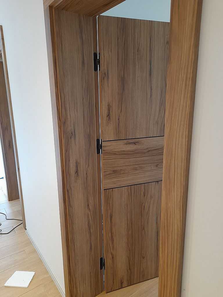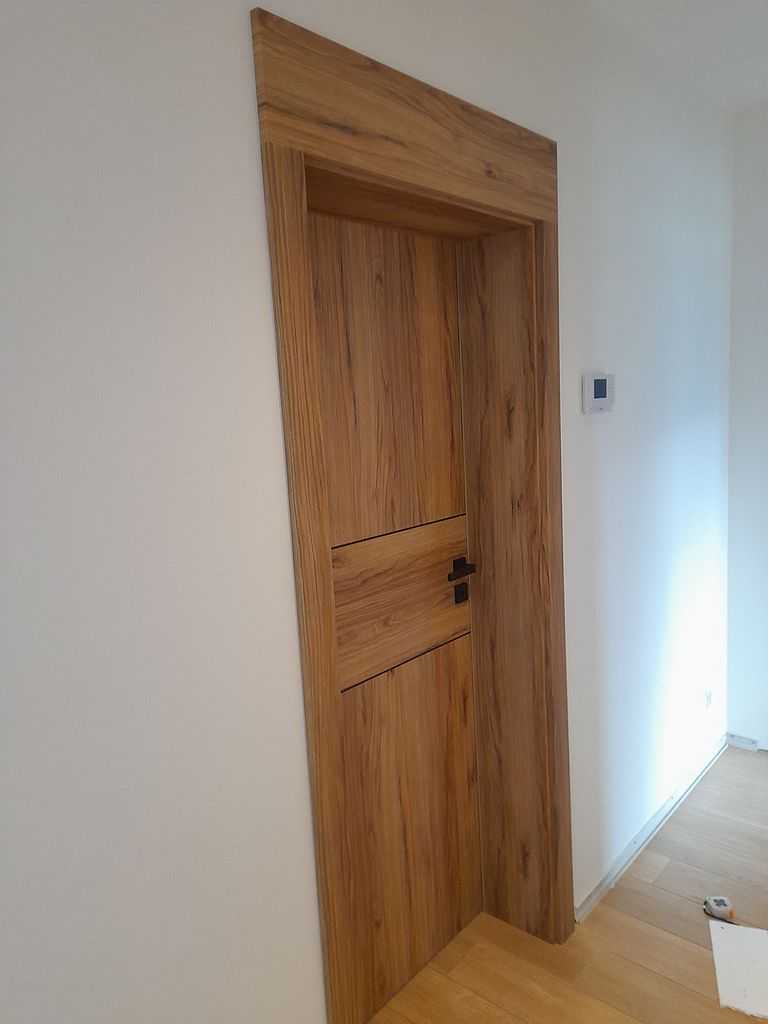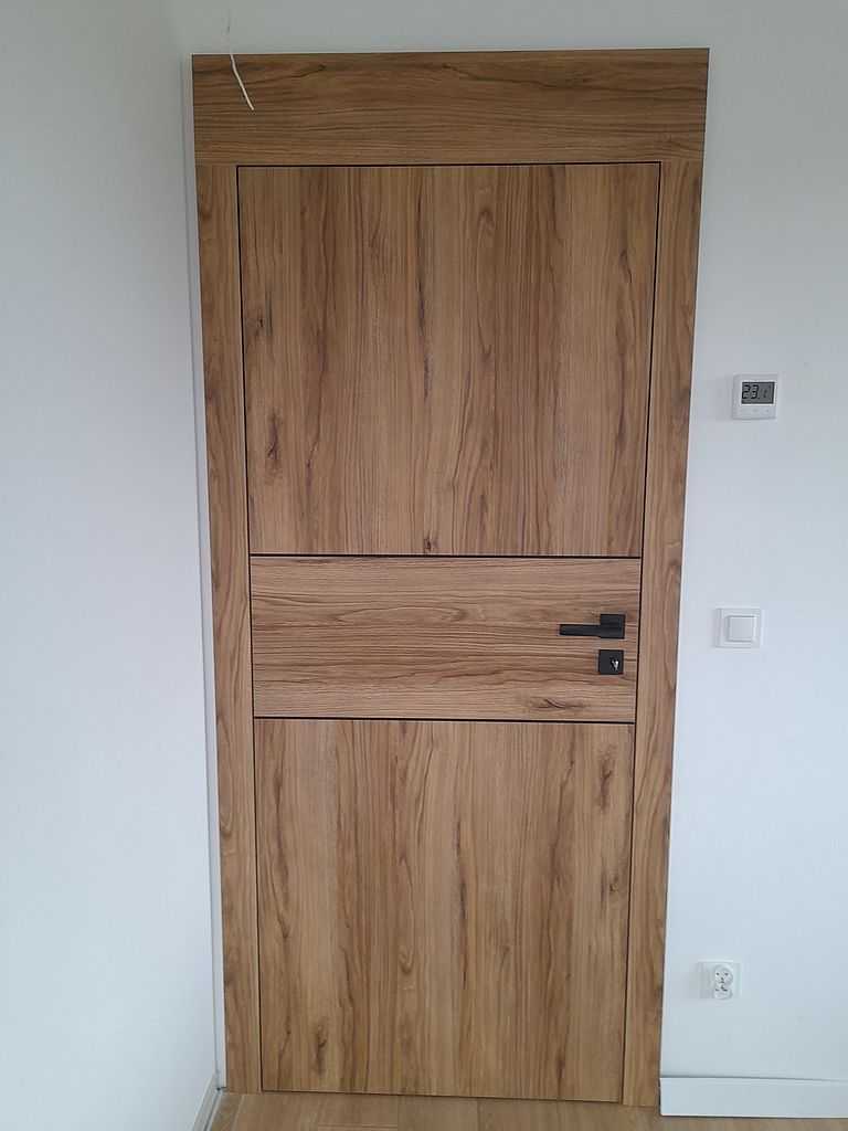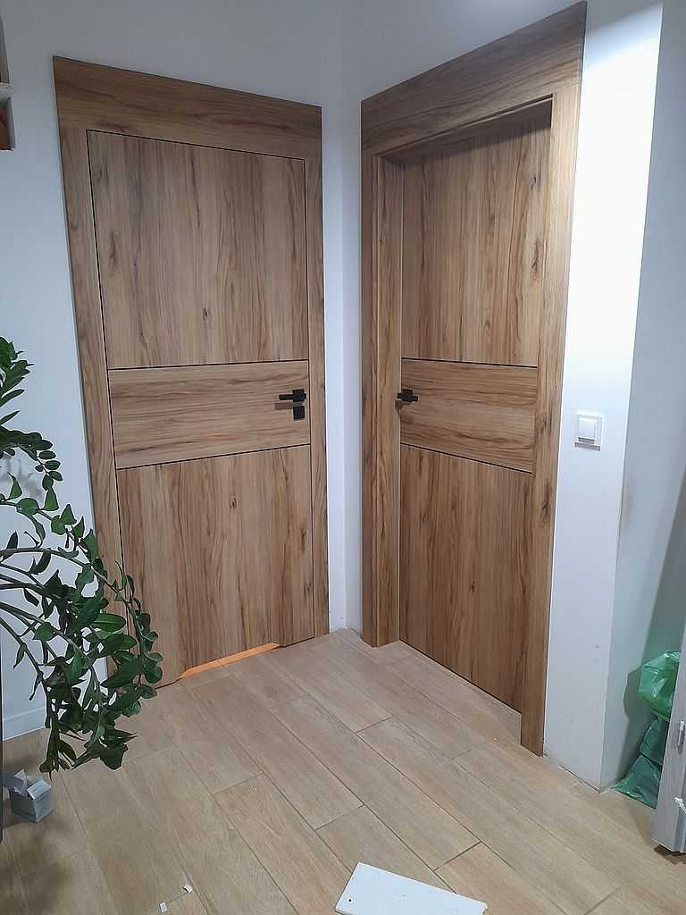 Skrzydła jak i ościeżnice w poniższej realizacji oklejone zostały drewnopodobną okleiną Porta Decor w kolorze Dąb Catania, której główną cechą jest doskonała imitacja drewna. Zastosowania okleina posiada drobne sęki i słoje dzięki czemu doskonale przypomina naturalny materiał. Ciekawym rozwiązaniem w skrzydłach jest zastosowanie intarsji idealnie zlicowanych z powierzchnią okleiny. Producent w swojej ofercie posiada szeroką gamę kolorów naśladujących drewno. Zamontowane skrzydła wypełnione wzmocnioną płytą wiórowo otworową, która doskonale wytłumia dźwięki. Wykonane są w wersji bezprzylgowej. Posiadają trzy zawiasy ukryte w kolorze czarnym oraz czarne zamki magnetyczne. Wersja łazienkowa posiada modne podcięcie wentylacyjne.