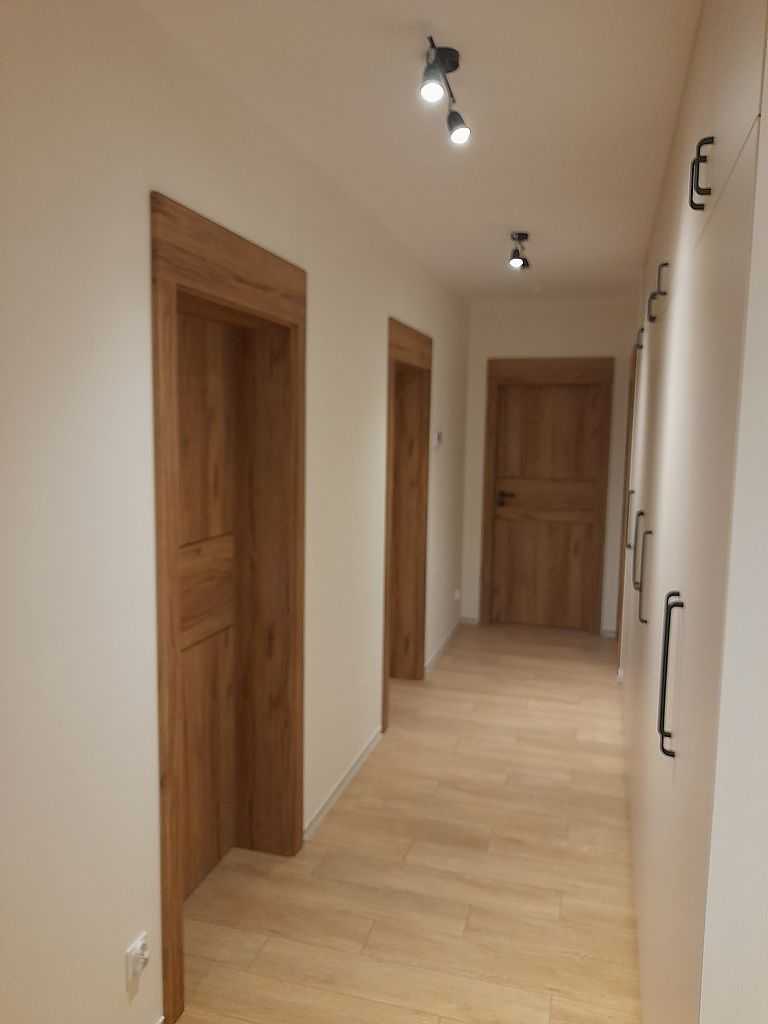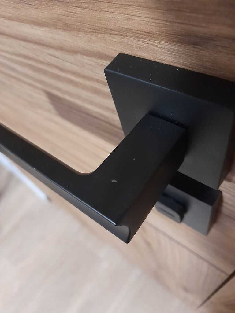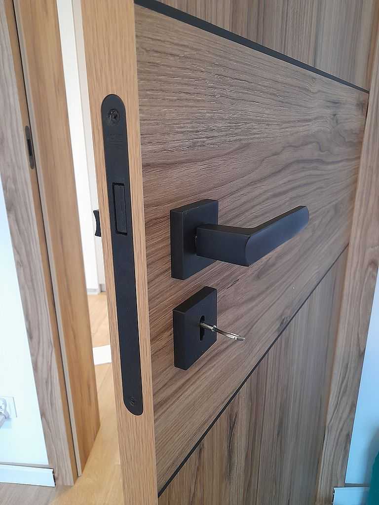 Niezbędnym elementem każdych drzwi są oczywiście okucia. Nasi montażyści zamontowali klamki dostępne w katalogu drzwi Porta. Prezentowany model to klamka Porta Rumba w kolorze  czarnym na rozecie kwadratowej. W drzwiach łazienkowych dodatkowo zamontowaliśmy szyld łazienkowy. Pokoje nie wymagające zamykania maja okucia w wersji oszczędnościowej czyli bez klucza. Wybierając drzwi z kolekcji Porta Level producent oferuje klamkę Rumba za 1zł.
