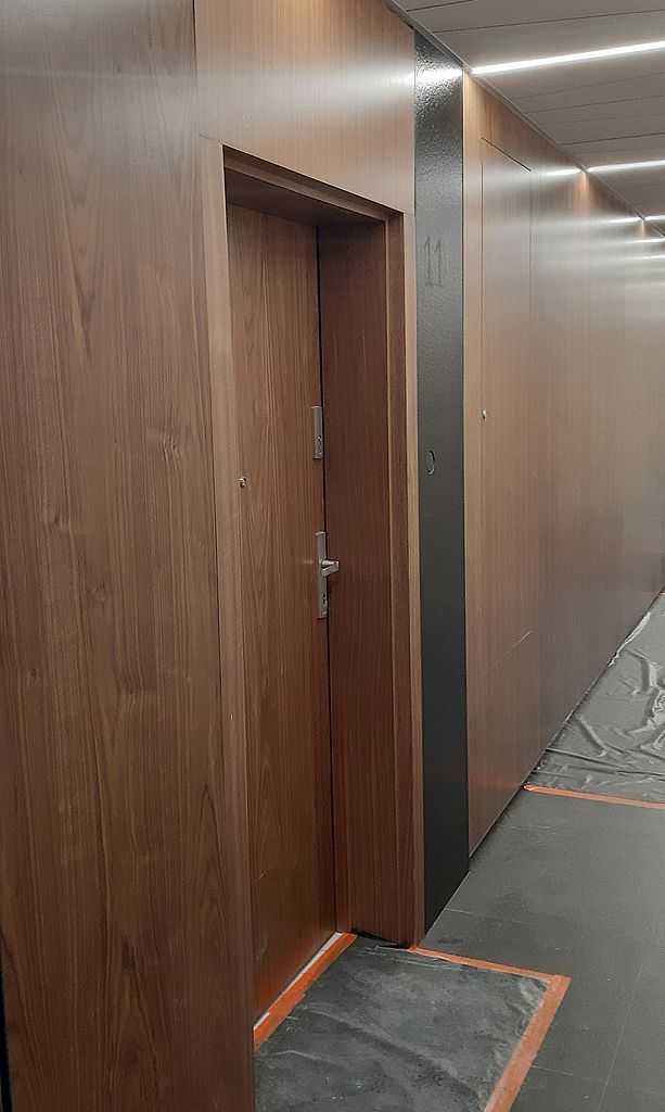 Dostarczyliśmy i zamontowaliśmy drzwi PORTA w budynku mieszkalnym nr 101 w szczecińskim Warszewie. Drzwi wejściowe do mieszkań to antywłamaniowe drzwi PORTA, model Extreme klasa RC 3 pokryte naturalna okleiną w kolorze Orzech. Mur zakryliśmy nakładkami Projekt Bis Porta wykonanymi na wzór ościeżnic model Level. Ściany zabudowaliśmy płytą NRO w kolorze identycznym jak drzwi wejściowe. W części garażowej zamontowaliśmy drzwi stalowe przeciwpożarowe oraz drzwi uniwersalne do komórek lokatorskich w kolorze antracyt. Łącznie dostarczyliśmy oraz zamontowaliśmy 75 sztuk drzwi.