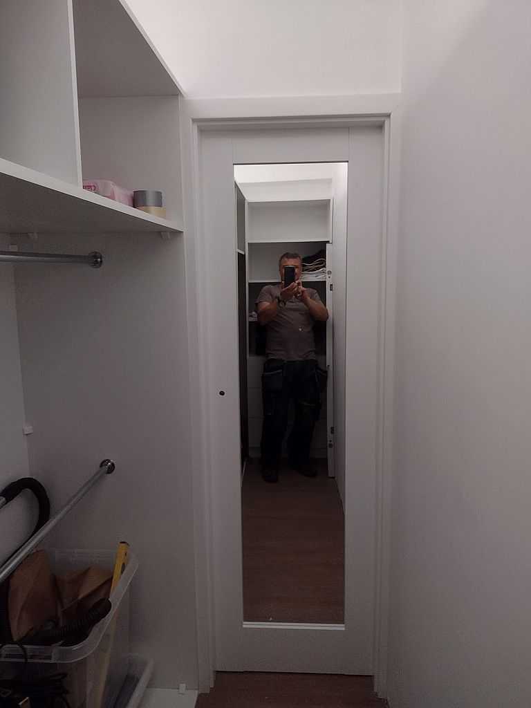 Klienci zdecydowali się również na drzwi przesuwne w systemie naściennym Porta w wykonaniu z lustrem dwustronnym z czarnym pochwytem podłużnym. Największą zaletą takich drzwi jest oczywiście oszczędność miejsca oraz funkcjonalność przy zastosowaniu połączenia drzwi przesuwnych z dużym lustrem. Niekiedy istnieje konieczność zamówienia drzwi spoza standardowych wymiarów, wynikająca z niedostatku miejsca. W takim przypadku aby sprostać potrzebą naszych klientów w garderobie zostały zamontowane węższe drzwi, wykonane przez producenta na indywidualne zamówienie.
